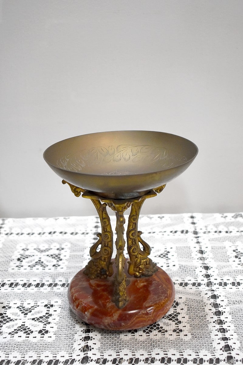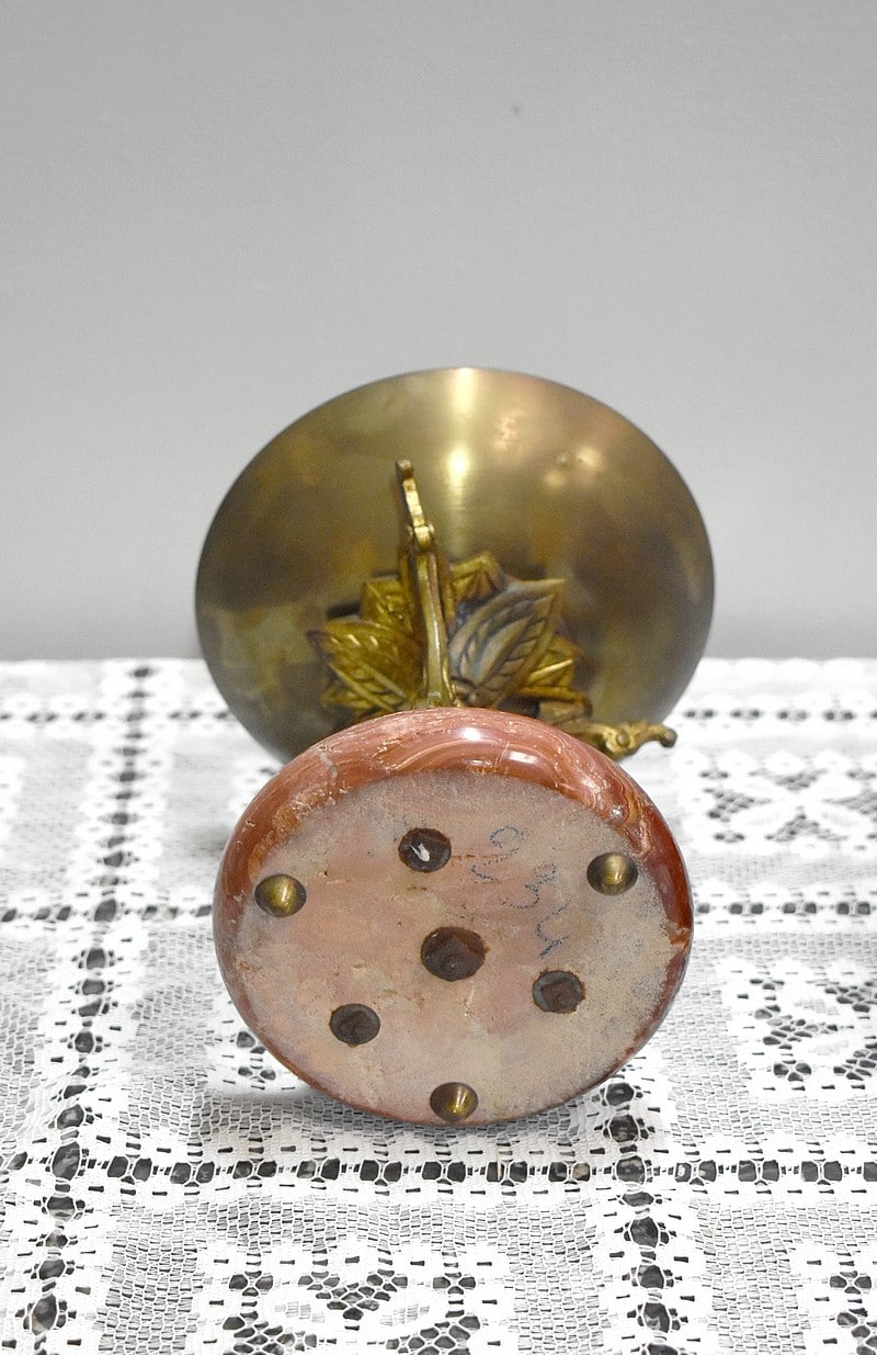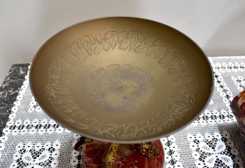 Les vide-poches en bronze, semblables à des coupelles surélevées, reposent sur des socles rond du même marbre que la pendule. A l’intérieur, ils sont finement gravés de feuillages.