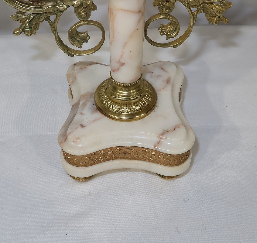 Deux candélabres assortis complètent l’ensemble. Ils ont un socle de section carrée et le fût cylindrique est agrémenté de collerettes ciselées. De chaque côté, un élément en volute forme une branche supportant la bobèche.