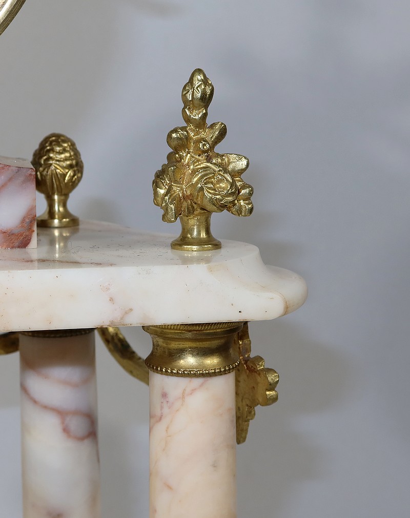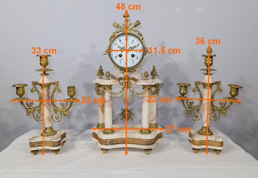Quatre colonnes cylindriques en marbre sont agrémentées de collerettes en partie haute et basse, et supportent un socle mouluré et le cadran. L’ensemble est ornementé de guirlandes, de volutes, de pommes de pin et de bouquets en bronze façonné.