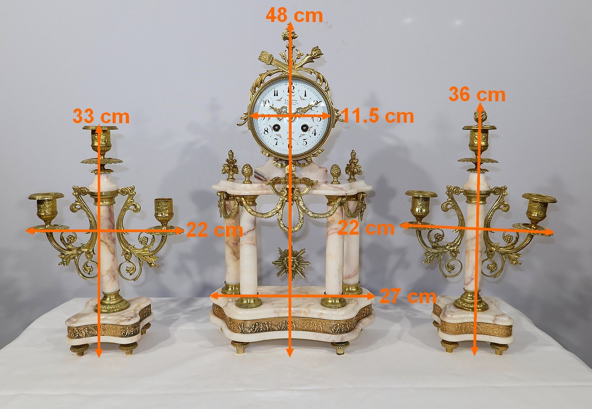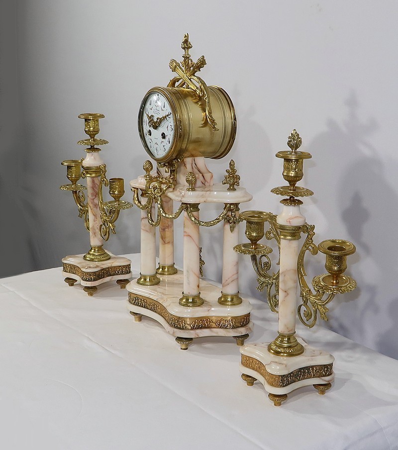 Bel ensemble trois pièces en marbre et bronze, constitué d’une pendule et de deux candélabres assortis.