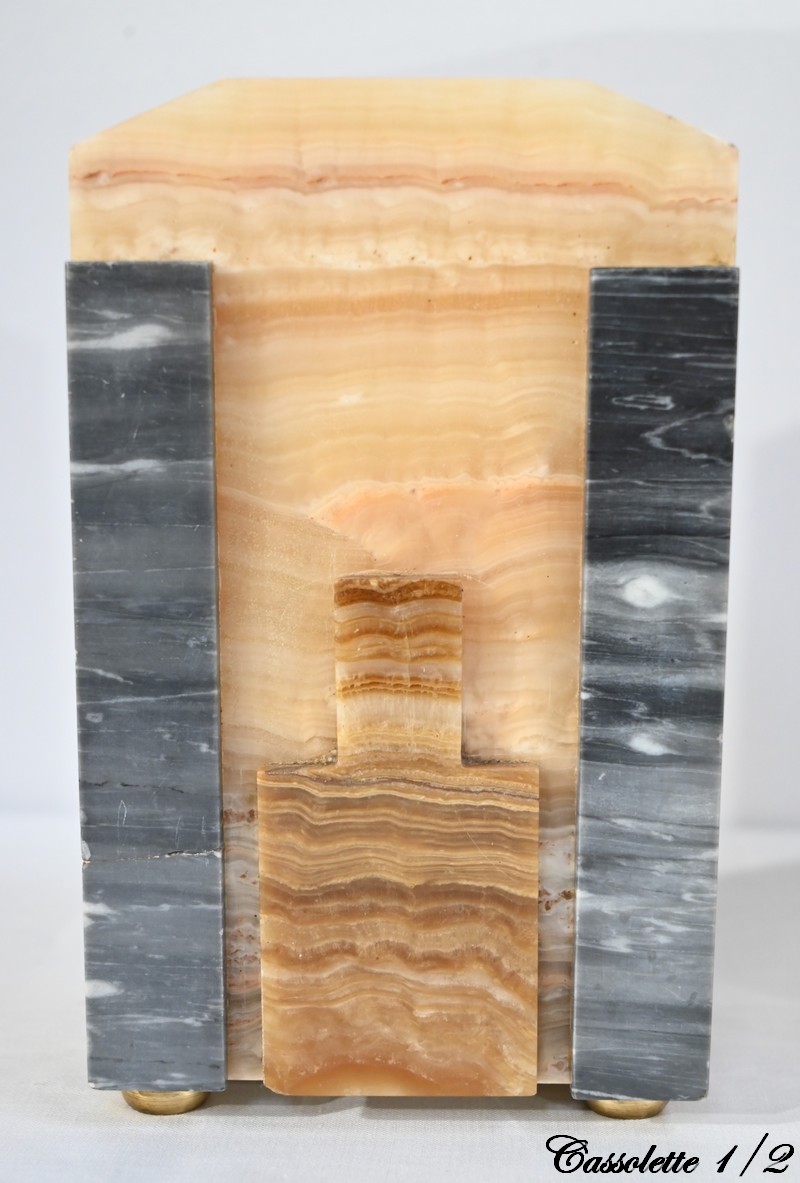 L’alliance de l’onyx, du marbre et du bronze, ainsi que ses ornementations, font de cette garniture de cheminée une œuvre fidèle au courant Art Déco.