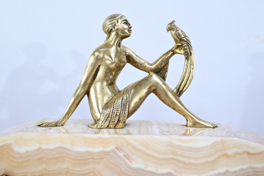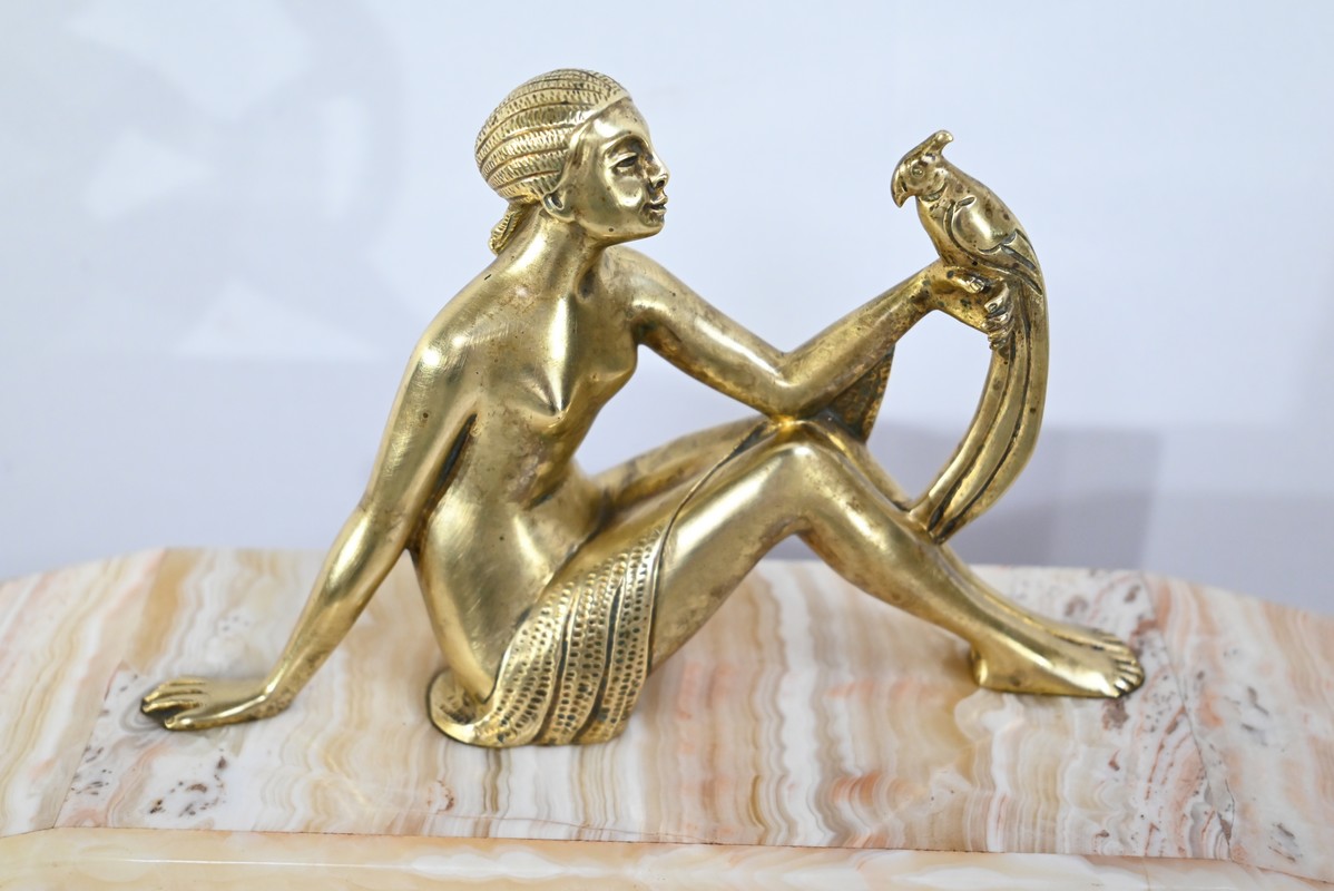 Ce garde temps comporte une sculpture en bronze représentant une femme drapée tenant un perroquet dans sa main gauche.