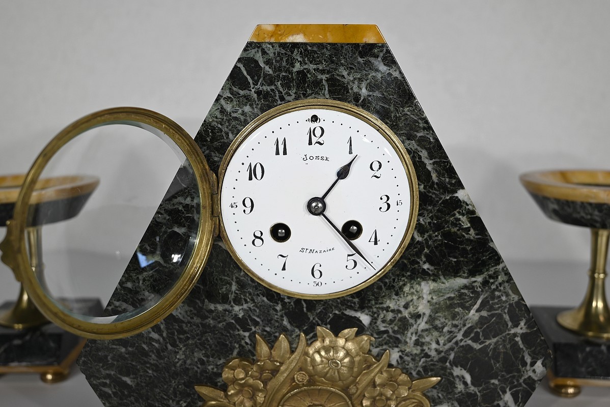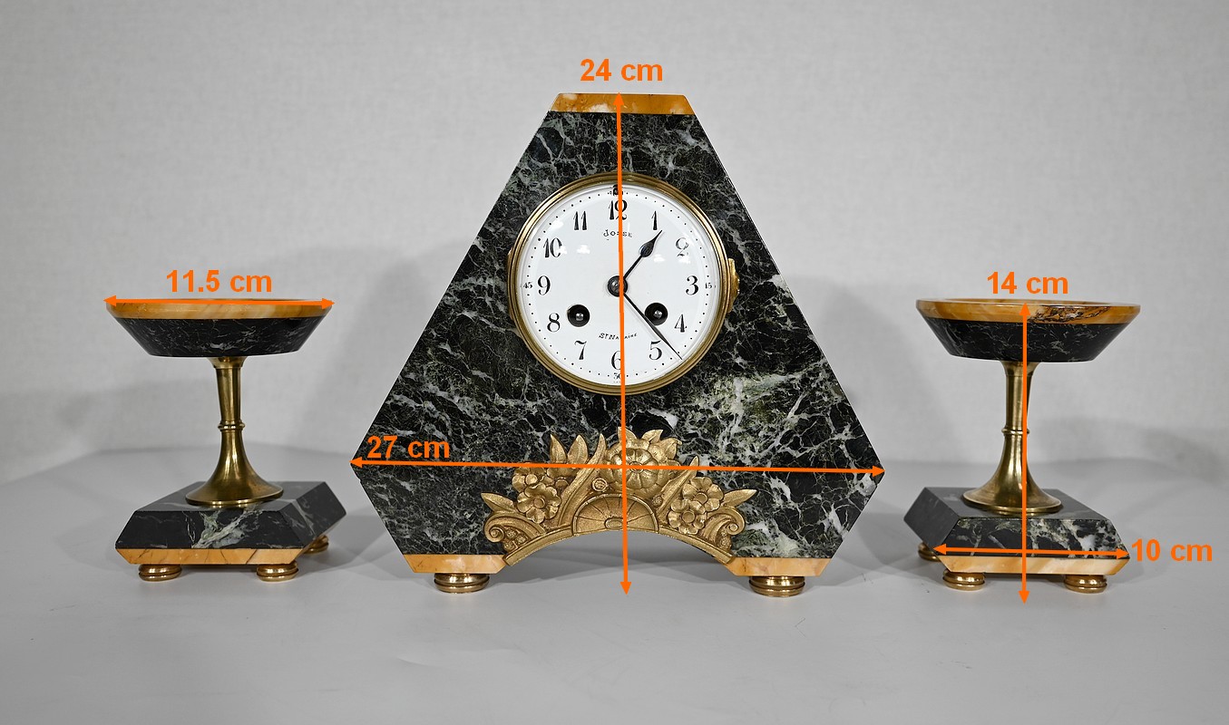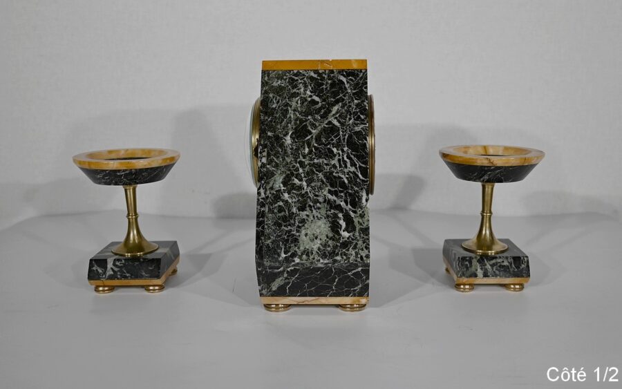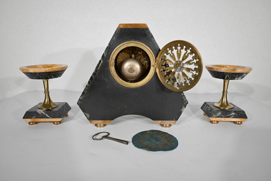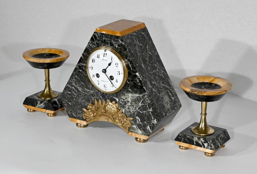 Garniture de cheminée en marbre vert de mer et jaune de sienne comprenant une pendule en forme de prisme triangulaire accompagnée de deux coupes assorties.
