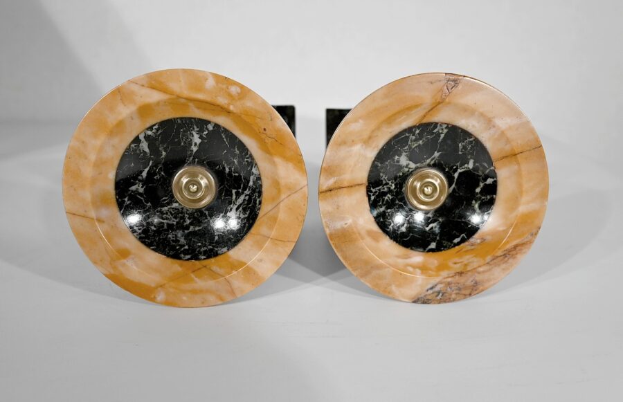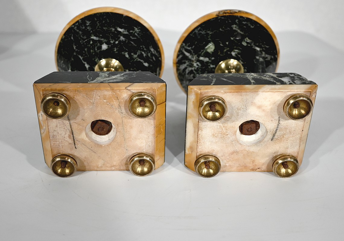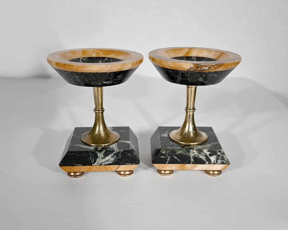 Deux coupes stratifiées de marbre vert de mer et de marbre jaune de sienne complètent l’ensemble. Elles possèdent un élégant fût et quatre petits pieds en bronze.