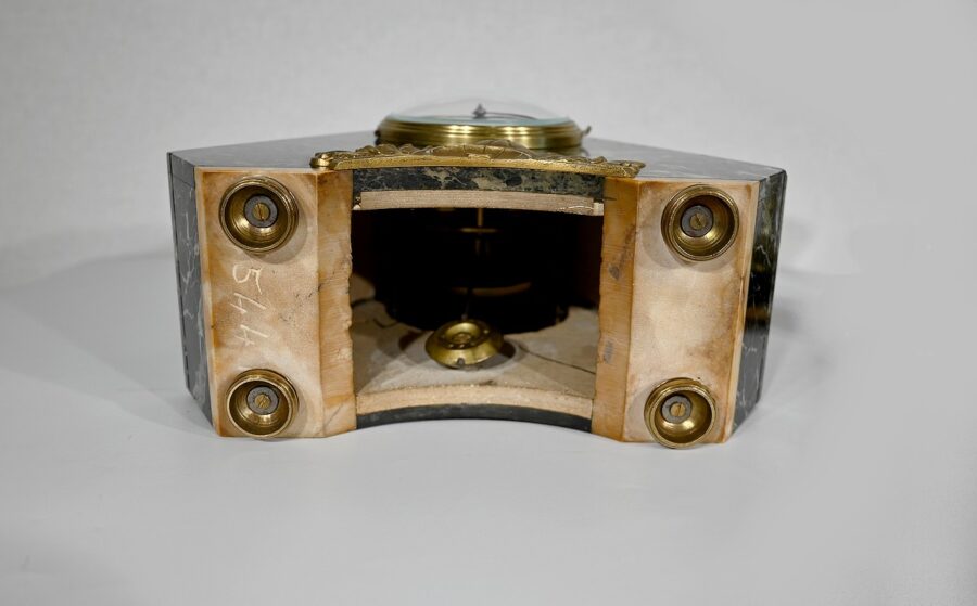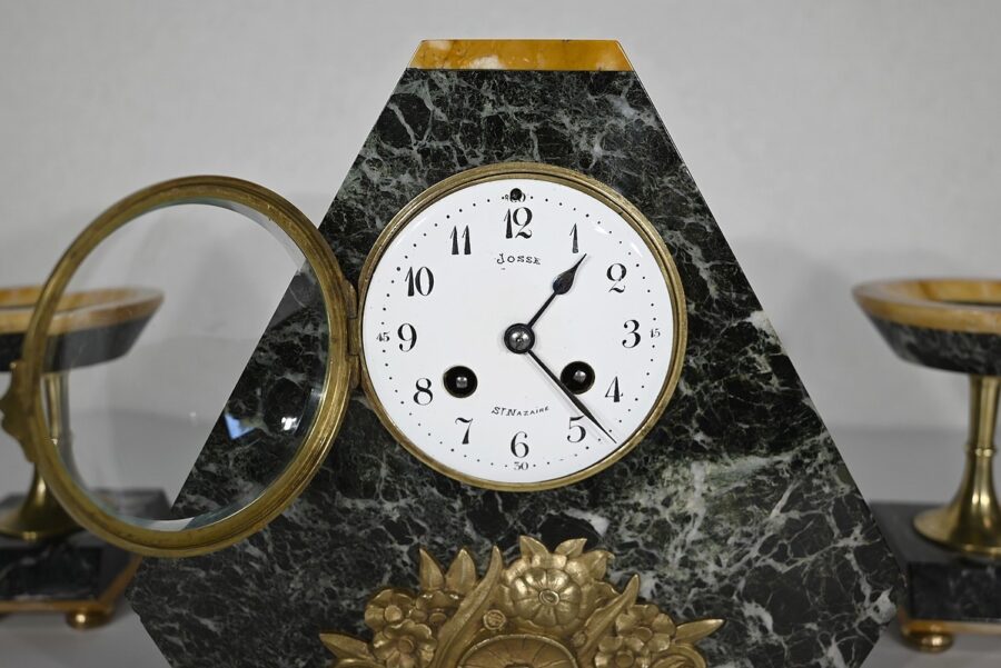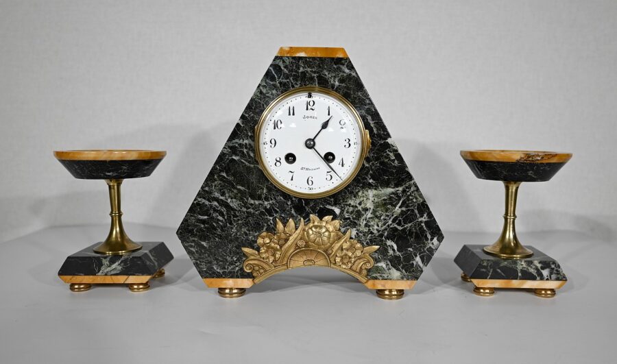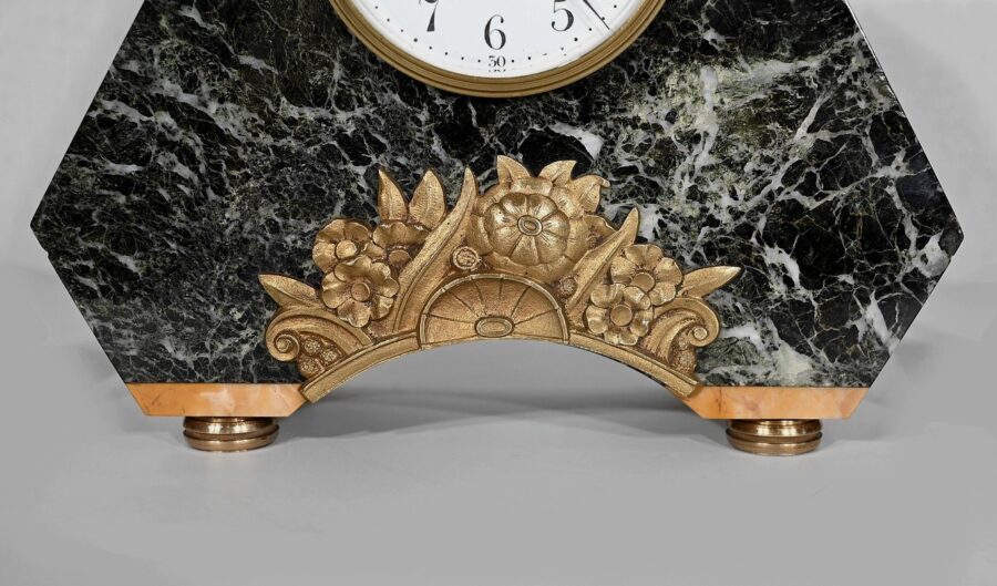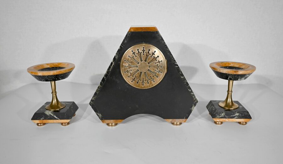 L’alliance des marbres et du bronze, sa forme, ainsi que ses ornementations, font de cette garniture de cheminée une œuvre unique, fidèle au design novateur du début du XXe siècle.