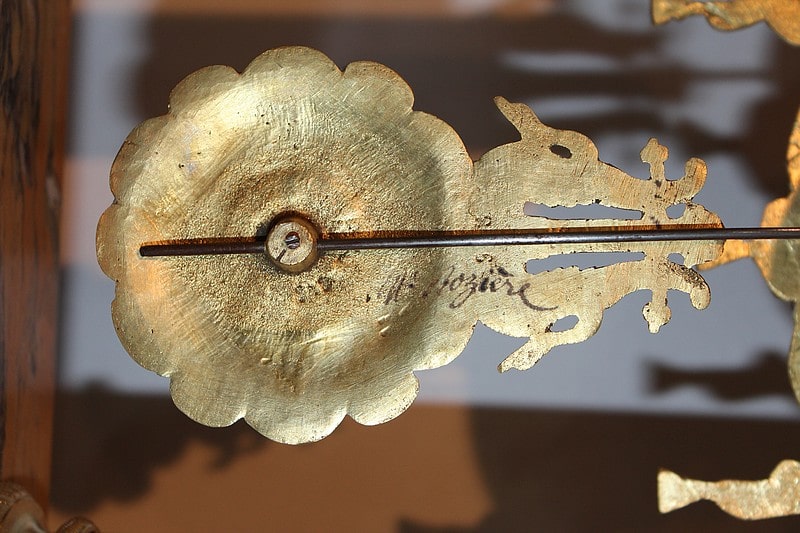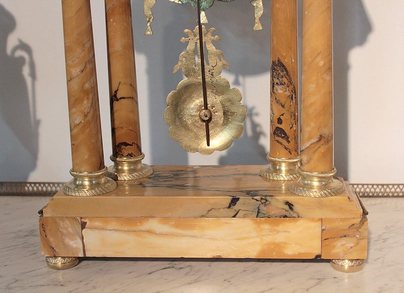 Garniture de cheminée en marbre et bronzes dorés de style Empire composée d’une pendule à colonnes et de 2 cassolettes. Le marbre est de couleur ocre veiné de brun , le cadran est surmonté d’un aigle en bronze aux ailes déployées. Elle est ornée de bronzes : palmettes, bagues, pieds … qui ont tous été déposés pour être nettoyés. (voir photos). Signature au dos du balancier : ‘H. Rozière’.
