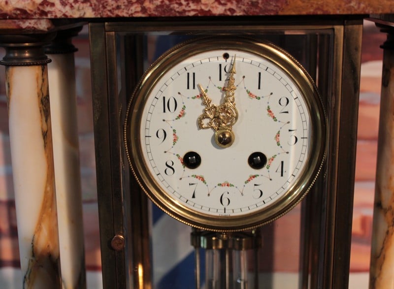 Garniture de cheminée en marbre rose orangé de style Empire composée d’une pendule cage encadrée de 4 colonnes blanches, surmontée d’un Lion en bronze et de deux pendants en forme de vases ornés de bronze. Le cadran de la pendule est en émail et son balancier à mercure. Époque : fin XIXe