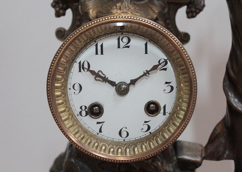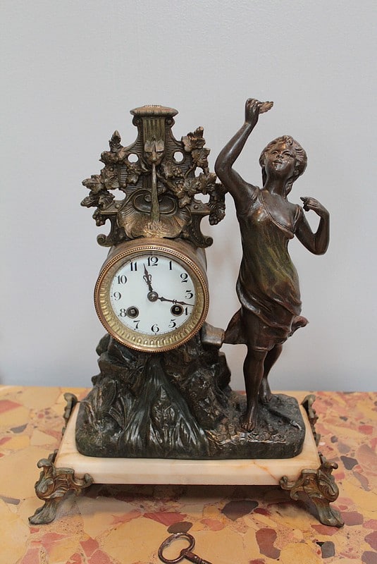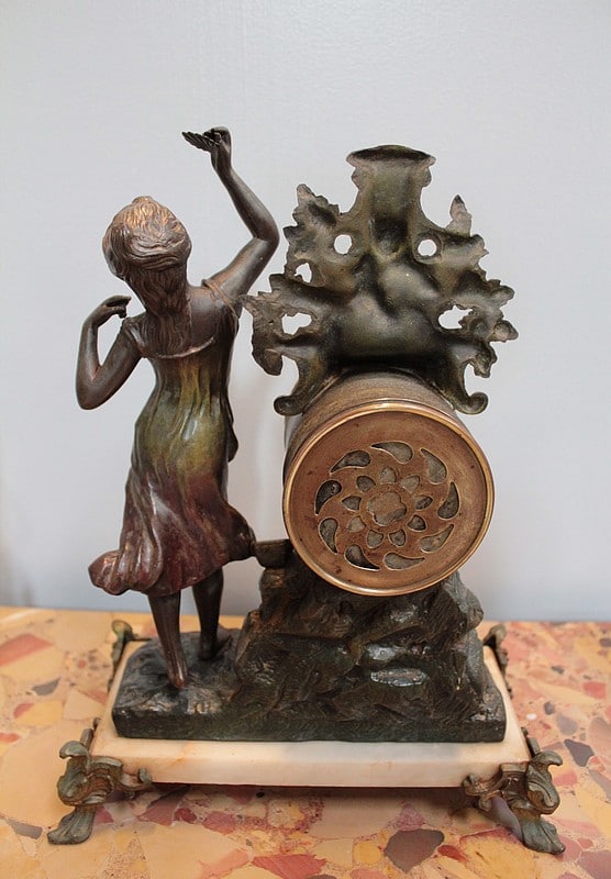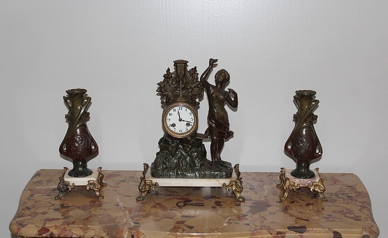 Décor de fleurs sur les bougeoirs, statue de jeune femme sur la pendule.