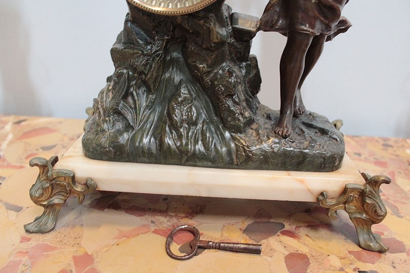 Garniture de cheminée en régule à patine brune et verte, composée d’une pendule et de 2 bougeoirs, sur socles de marbre posés sur des pieds dorés de style Louis XV.