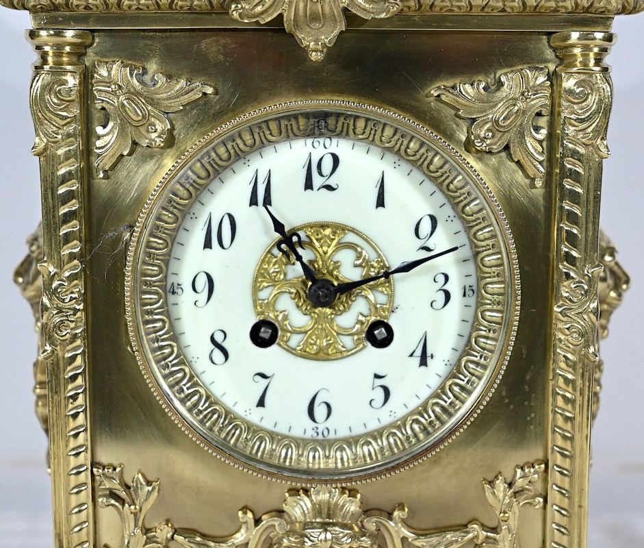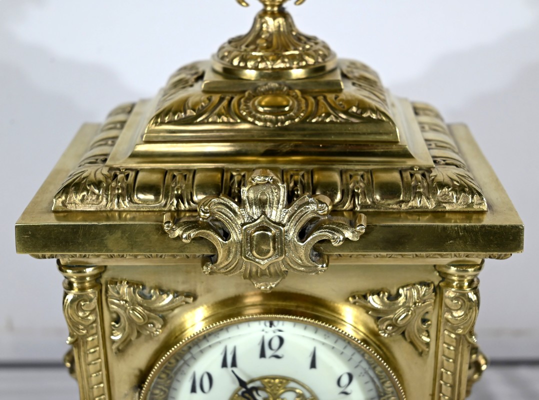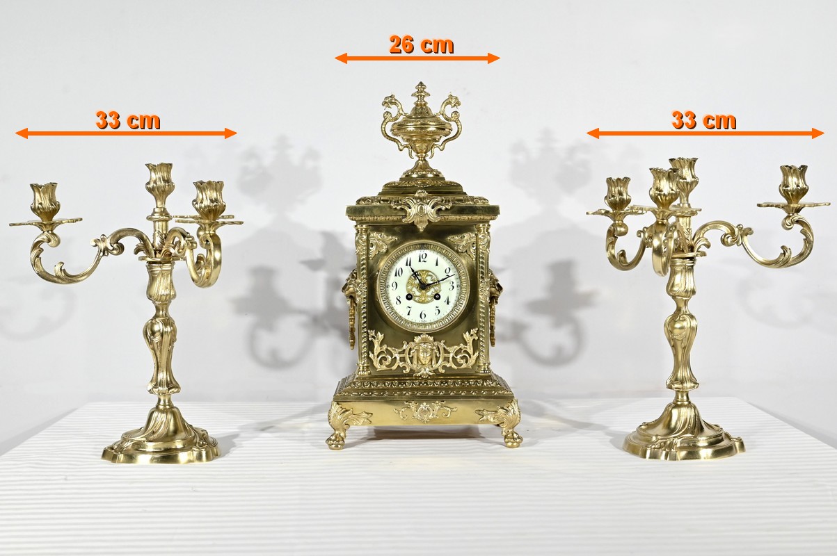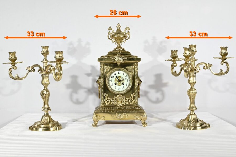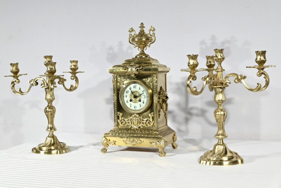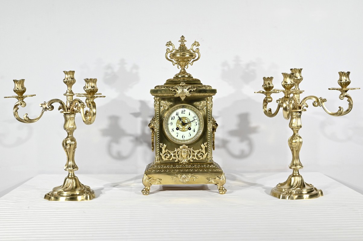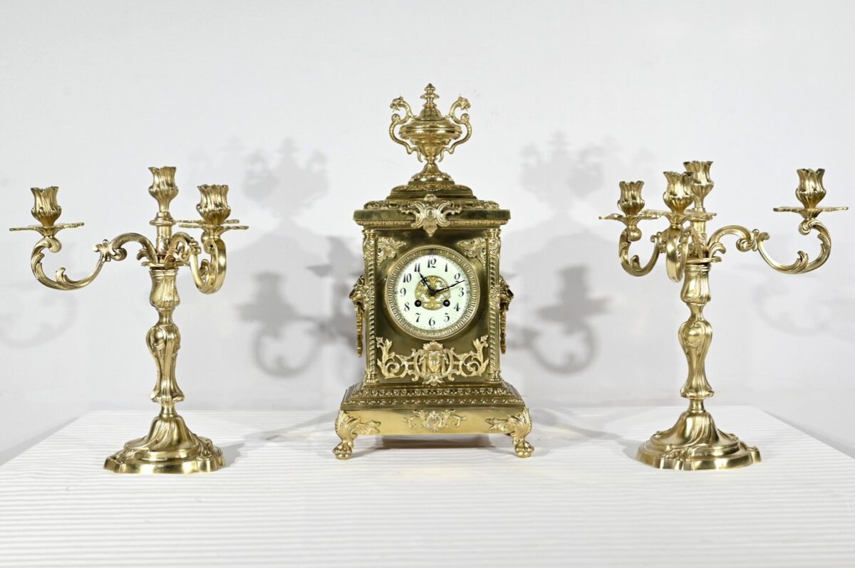 Cette garniture de cheminée en bronze doré se compose d’une horloge estampillée Japy Frères & Cie ainsi qu’une paire de chandeliers.