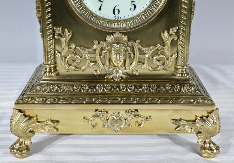 L’horloge rectangulaire étagée figure des décors de feuille d’acanthe, de frises et d’un masque de déesse sur sa façade.