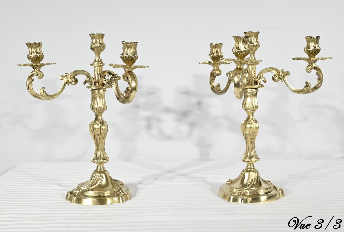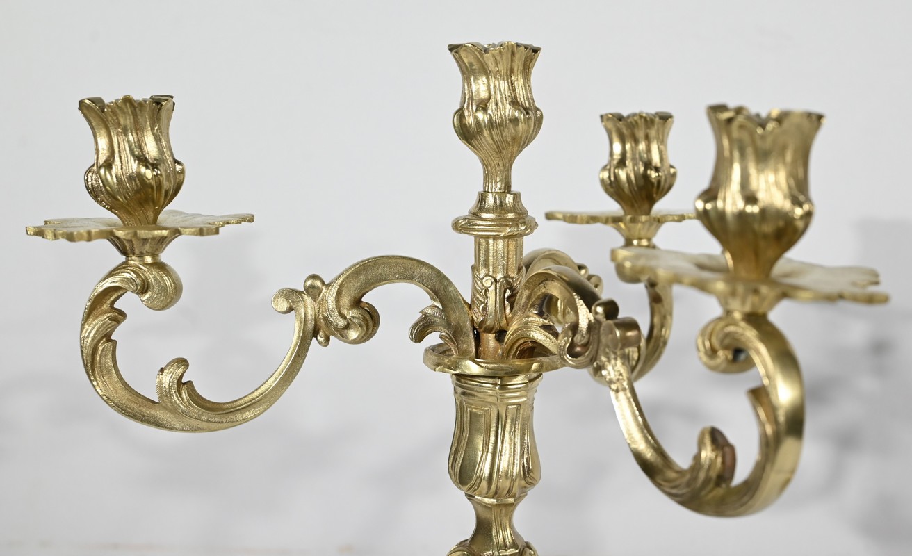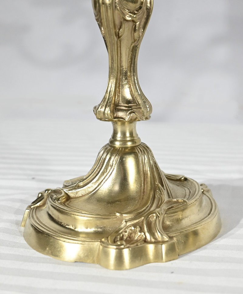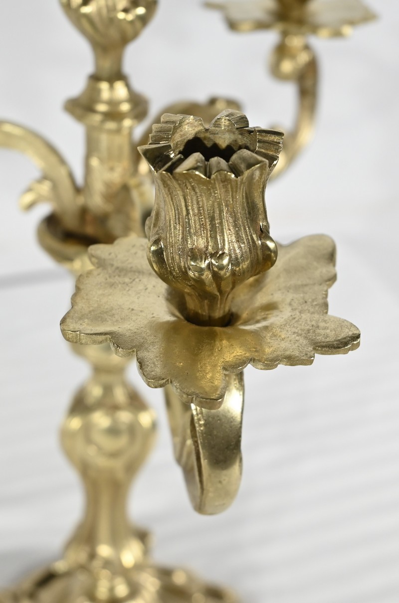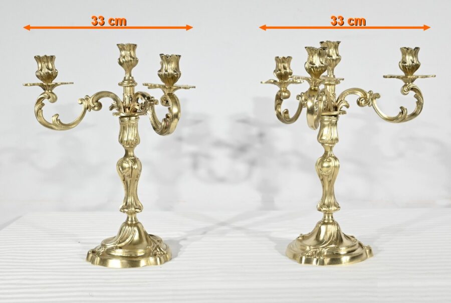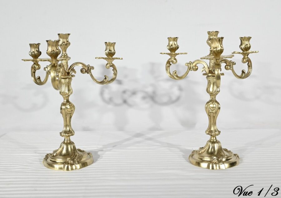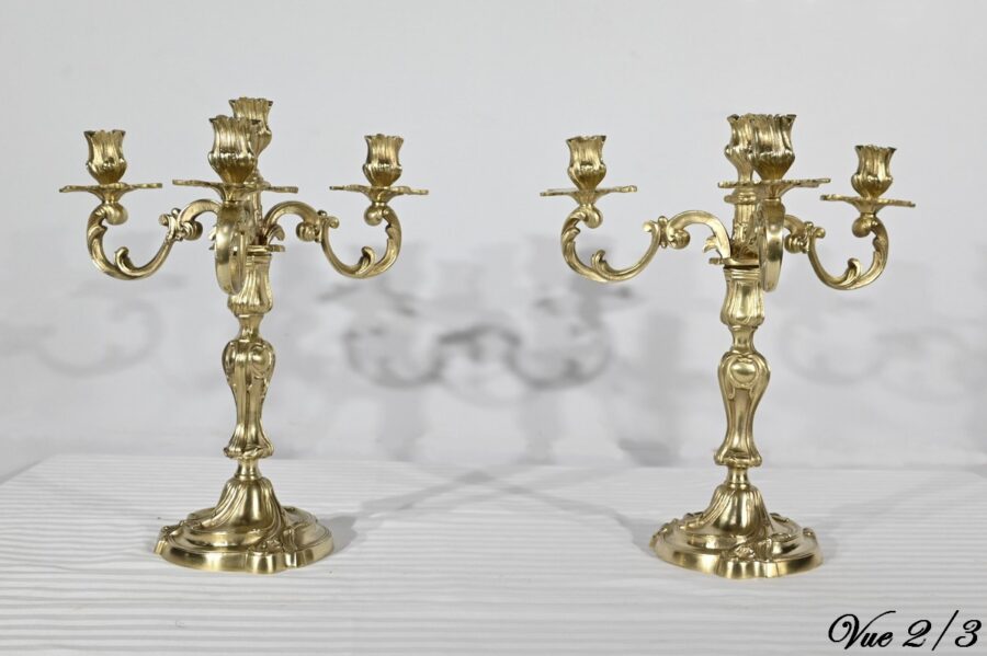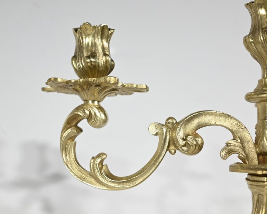 Ces bras supportent des bobèches finement ciselés et des calices à décors de feuilles d’acanthe.