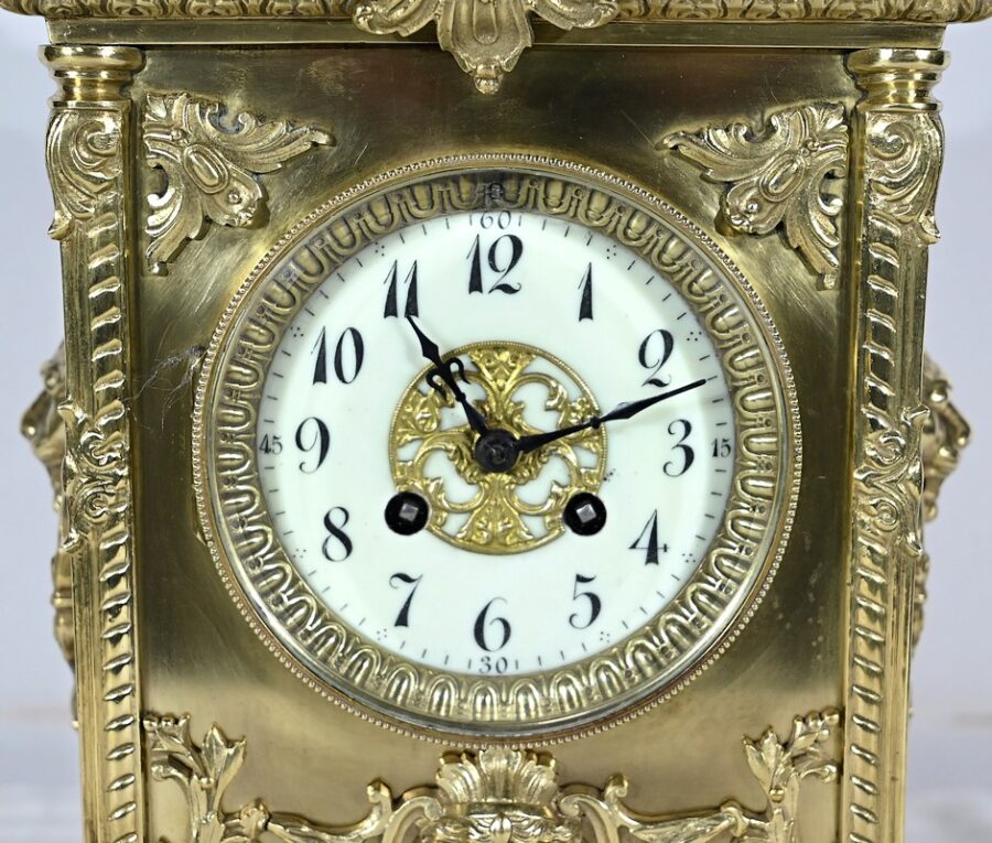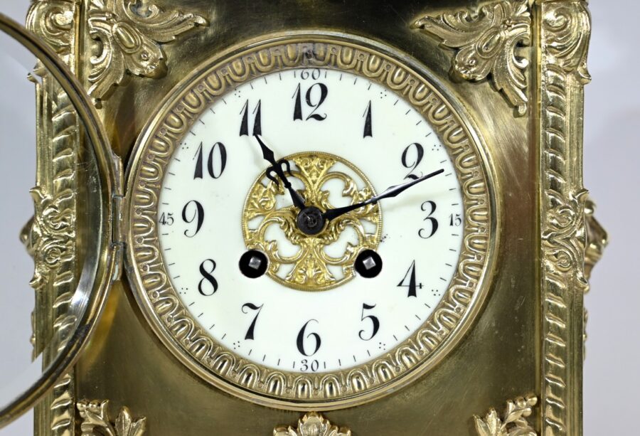 Le cadran blanc émaillé gradué aux heures et aux quarts d’heure est souligné d’un motif ajouré en laiton.