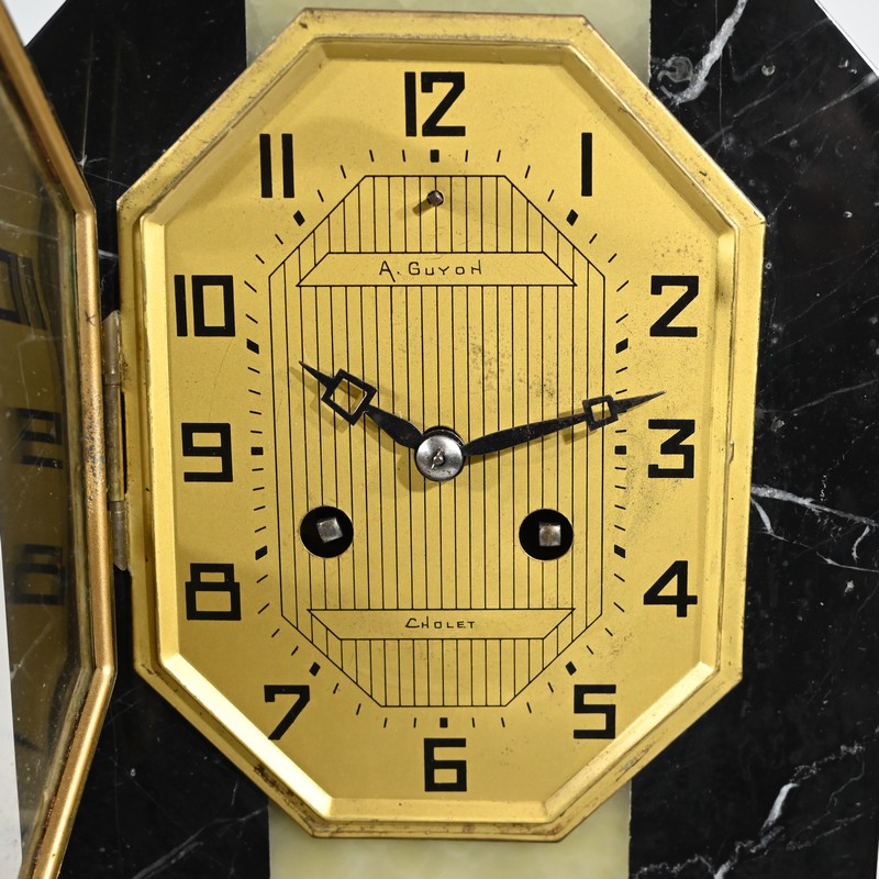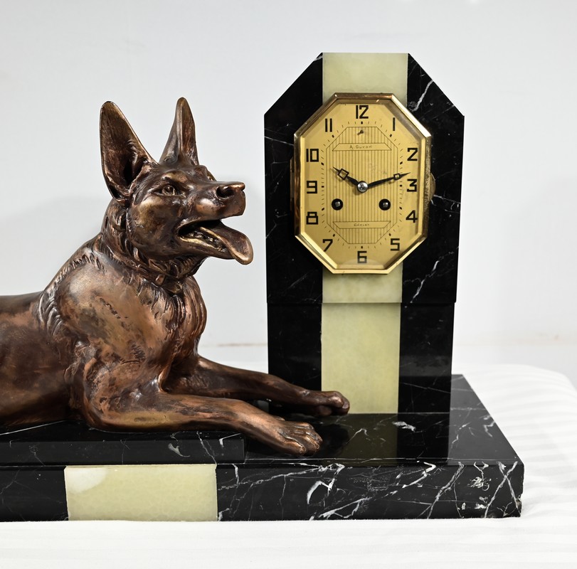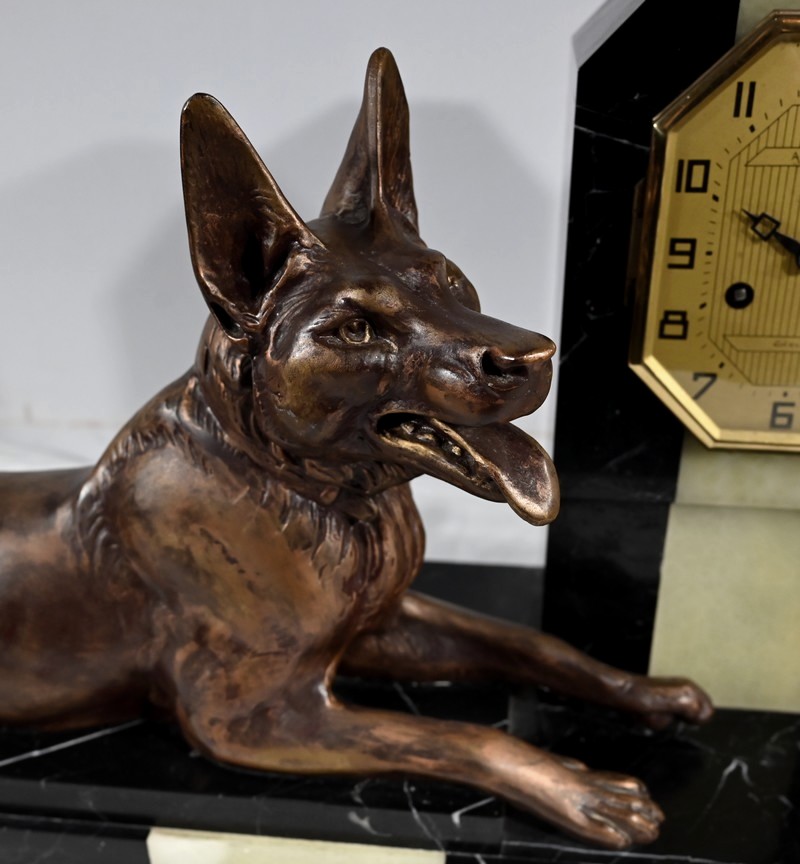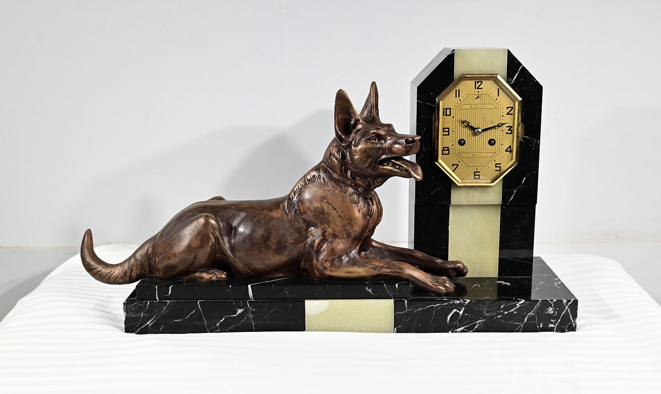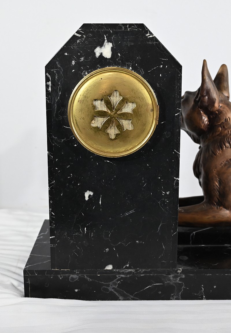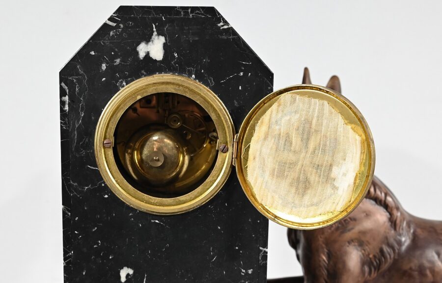 Belle garniture de cheminée en marbre noir de Cihigue, contrasté de plaques d’onyx, comprenant une horloge et deux cassolettes. Elle possède une grande sculpture en régule figurant un grand chien allongé, joyeux et oreilles dressées, semblant regarder son maître. Le cadran octogonal est estampillé de nom de l’horloger et de sa ville « A. Guyon Cholet ». Les cassolettes de même composition sont pourvues d’une cavité en partie supérieure.