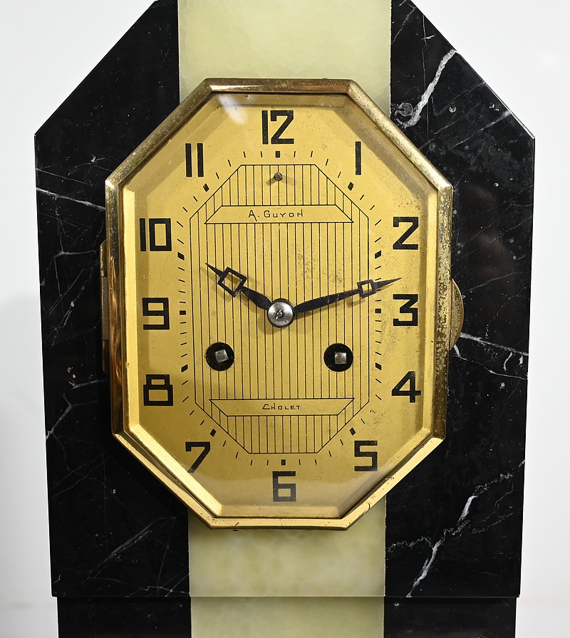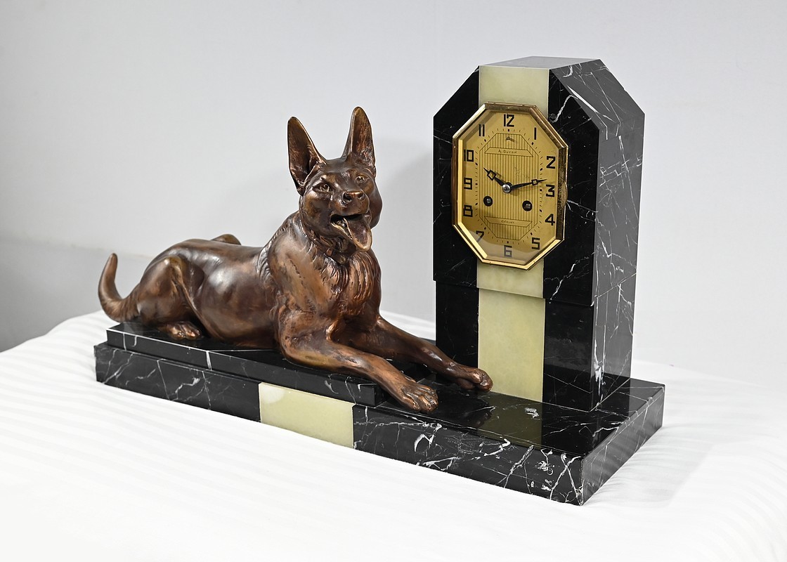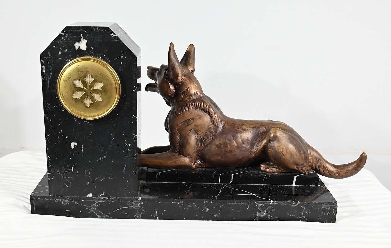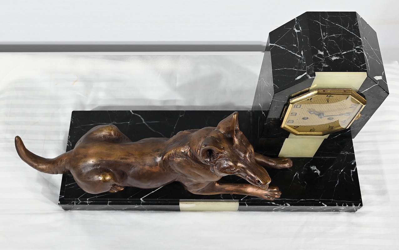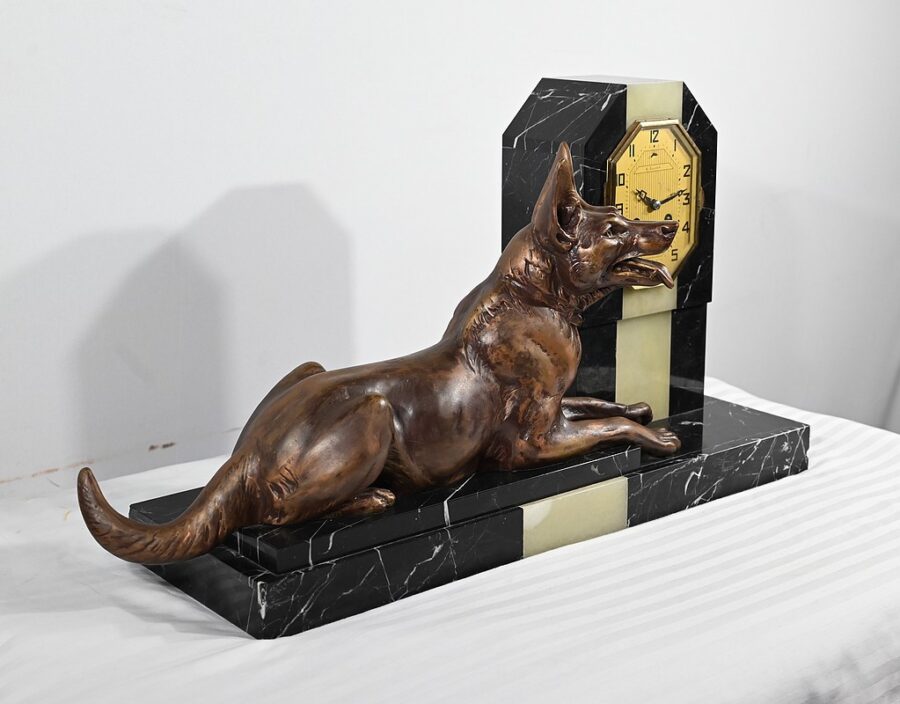 Belle garniture de cheminée en marbre noir de Cihigue, contrasté de plaques d’onyx, comprenant une horloge et deux cassolettes. Elle possède une grande sculpture en régule figurant un grand chien allongé, joyeux et oreilles dressées, semblant regarder son maître. Le cadran octogonal est estampillé de nom de l’horloger et de sa ville « A. Guyon Cholet ». Les cassolettes de même composition sont pourvues d’une cavité en partie supérieure.