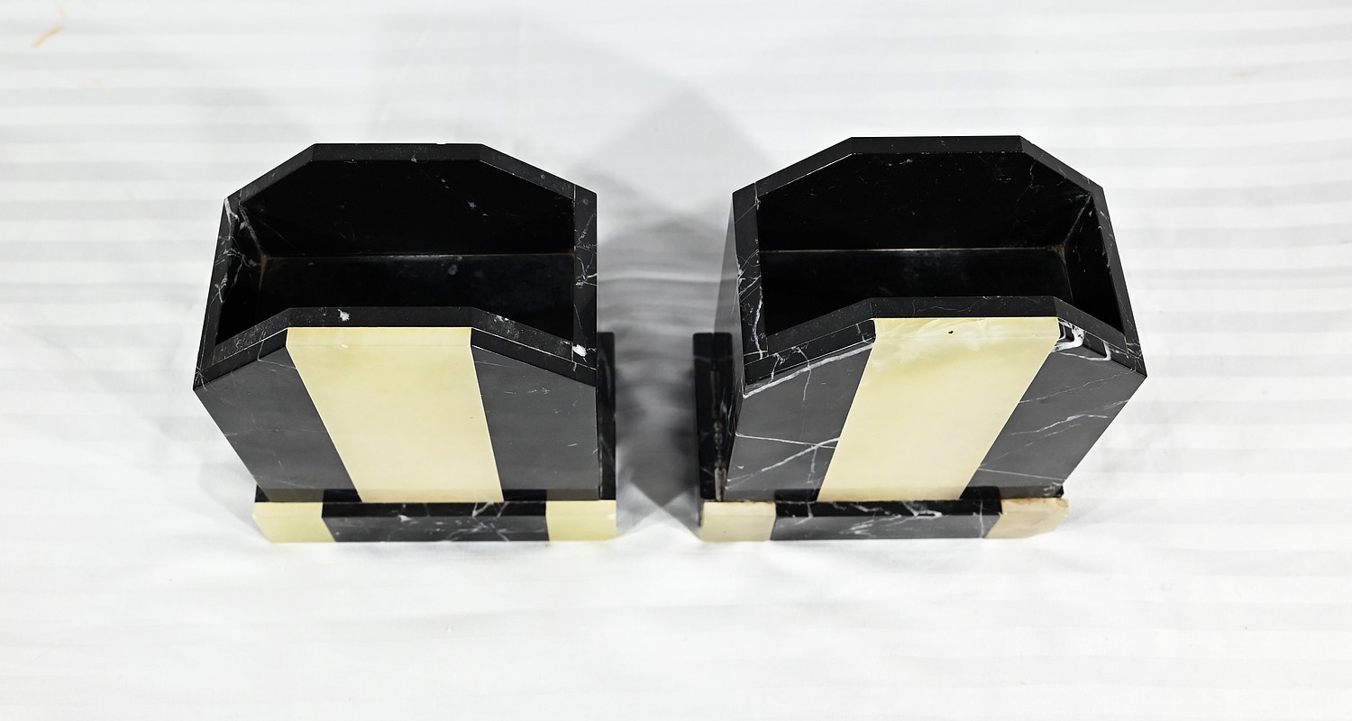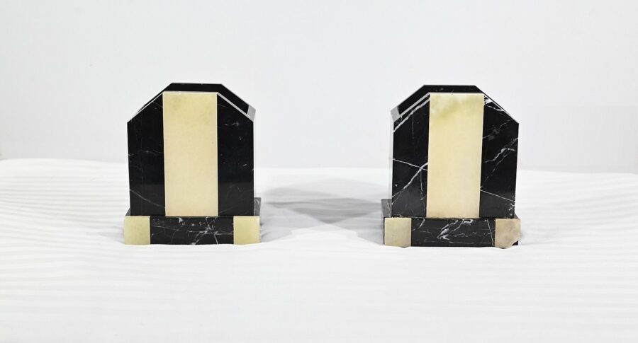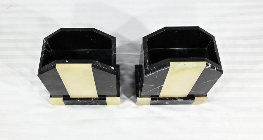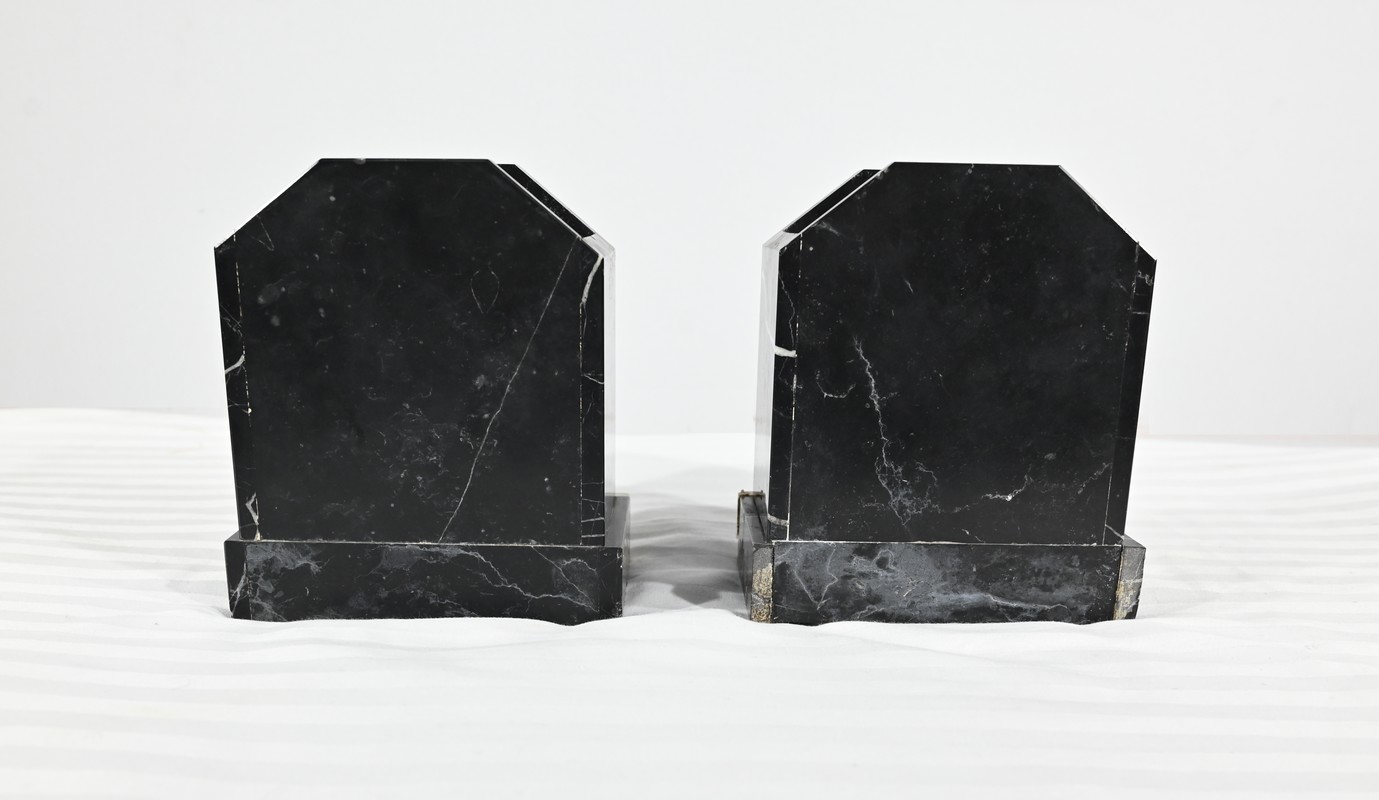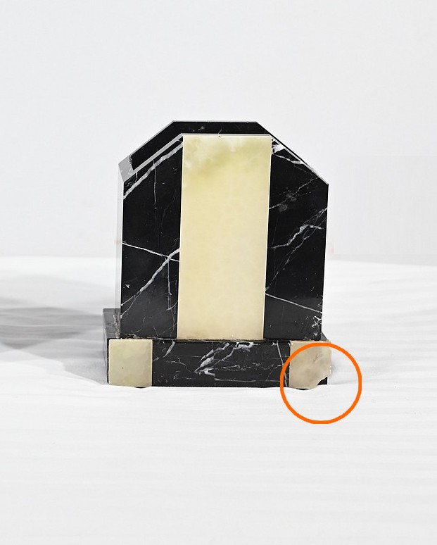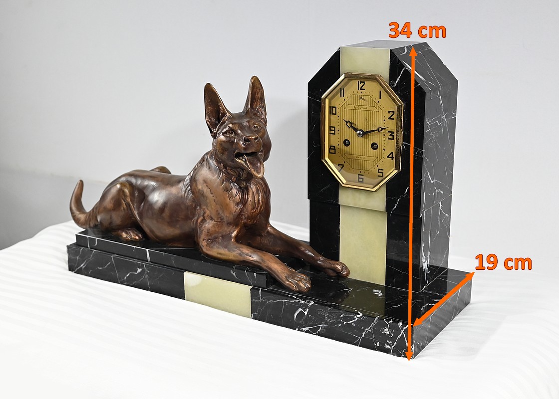 Belle garniture de cheminée en marbre noir de Cihigue, contrasté de plaques d’onyx, comprenant une horloge et deux cassolettes. Elle possède une grande sculpture en régule figurant un grand chien allongé, joyeux et oreilles dressées, semblant regarder son maître. Le cadran octogonal est estampillé de nom de l’horloger et de sa ville « A. Guyon Cholet ». Les cassolettes de même composition sont pourvues d’une cavité en partie supérieure.