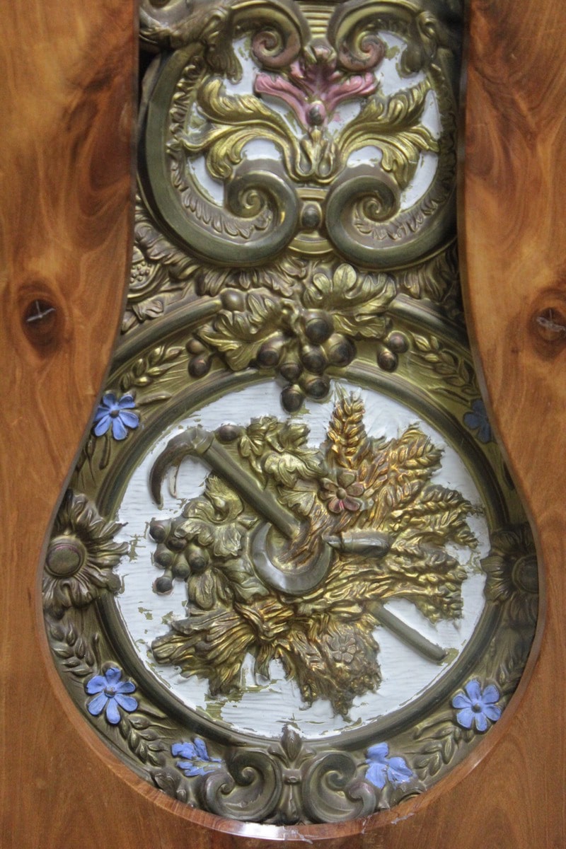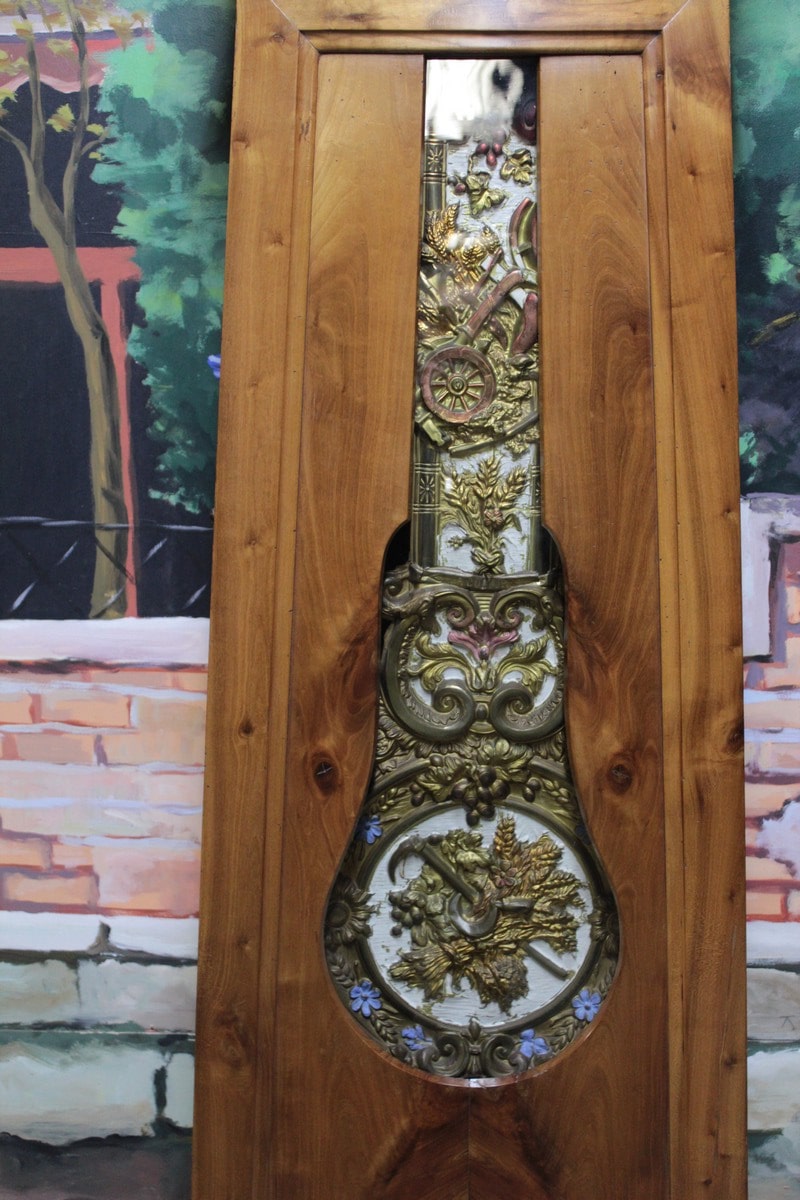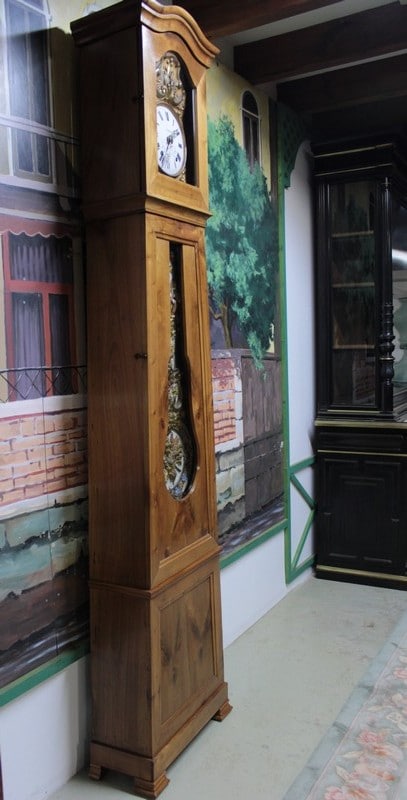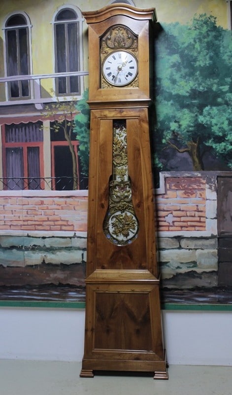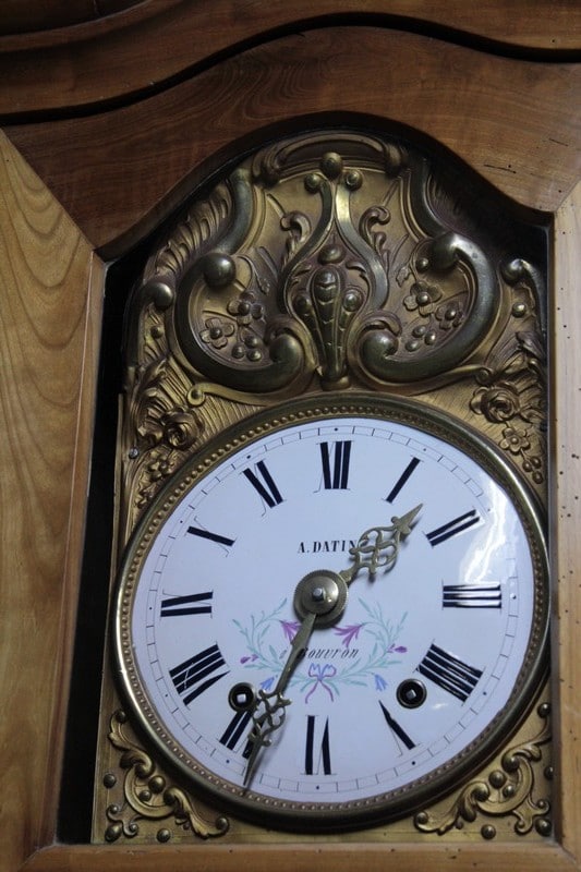 Horloge de parquet Louis-Philippe en merisier de la région de Nantes. Sur le cadran figure le nom de l’horloger ‘A. DATIN – Bouvron’ Le balancier est très coloré avec motifs de fleurs et de campagne. Époque 1880.