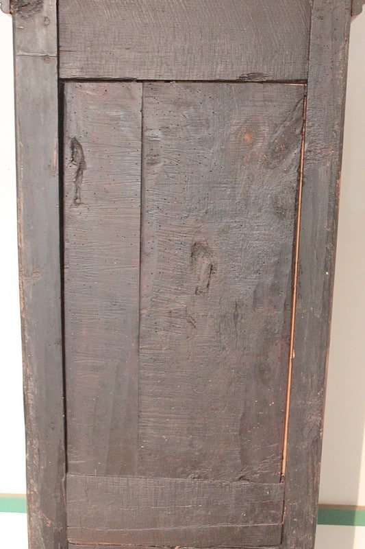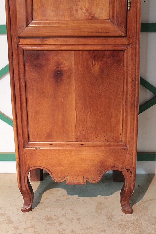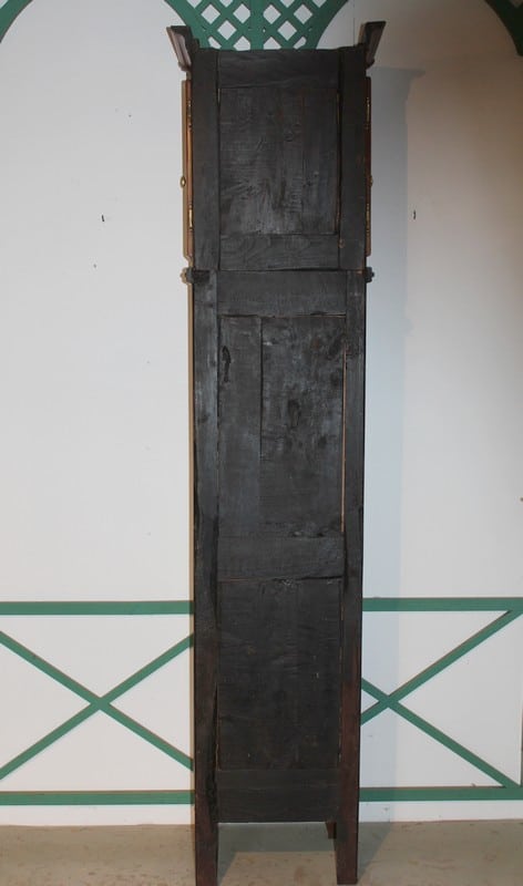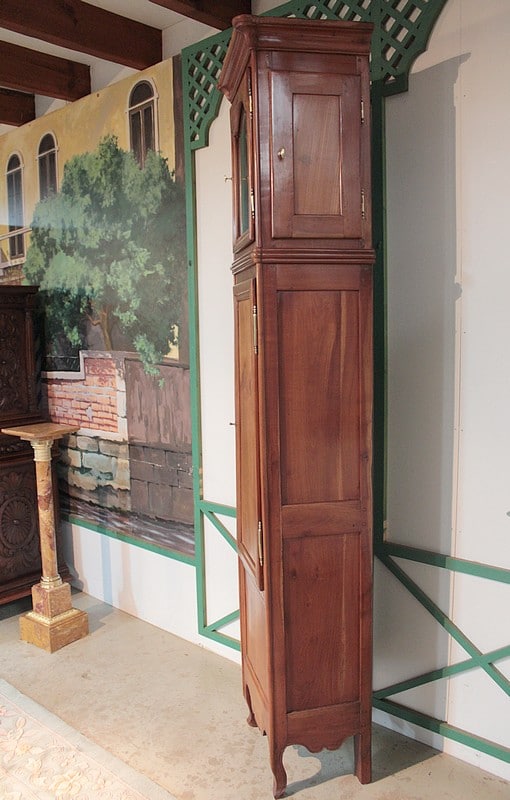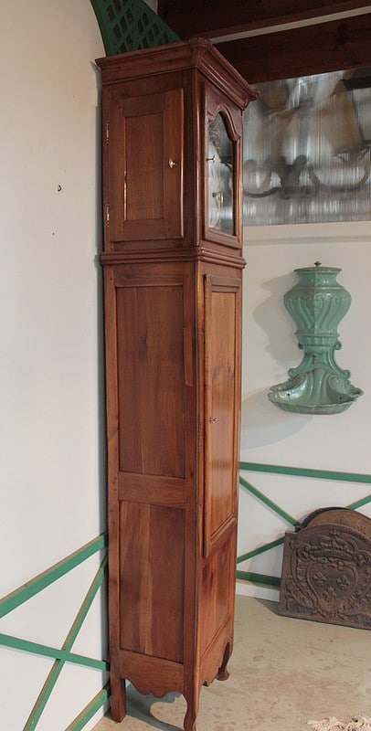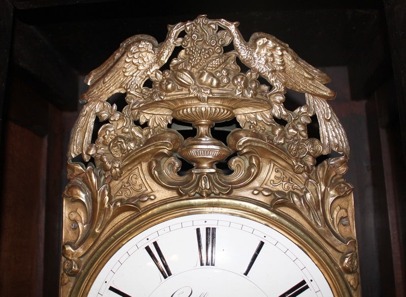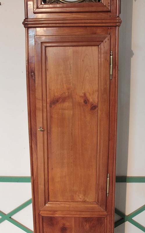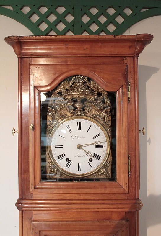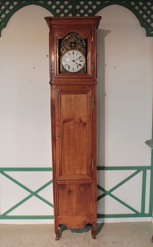 Horloge de parquet Louis XV en merisier massif – façade et côtés – reposant sur des pieds avants galbés et pieds arrières droits. Le cadran, en tôle émaillée, est signé ‘GOILLANDEAU à Nantes’. La tête du cadran, en laiton repoussé, est à décor d’oiseaux, de coupe de fruits et de rinceaux.