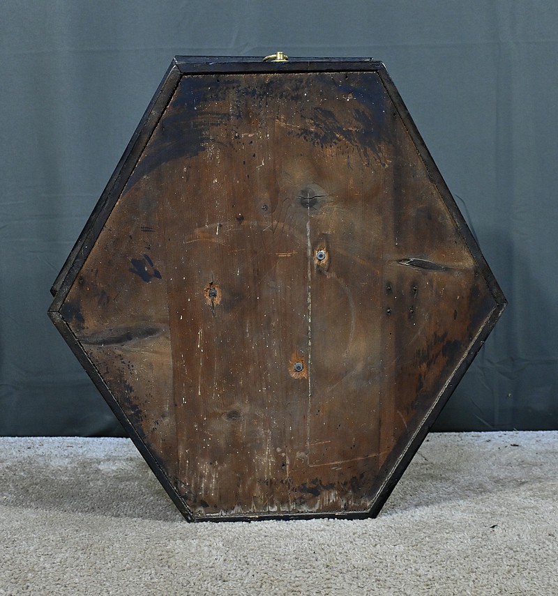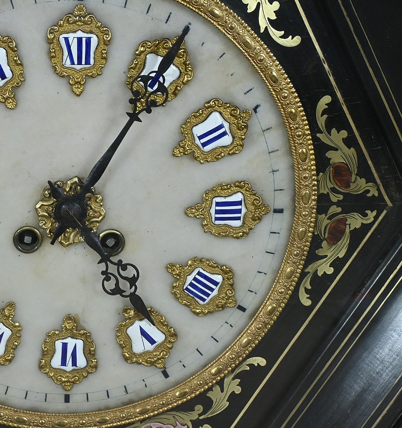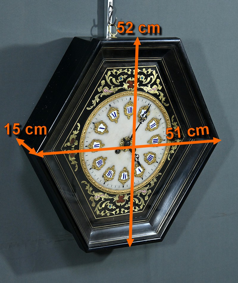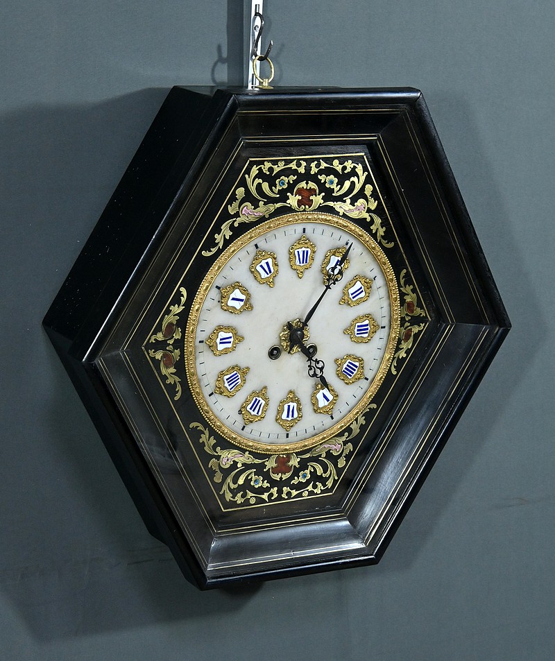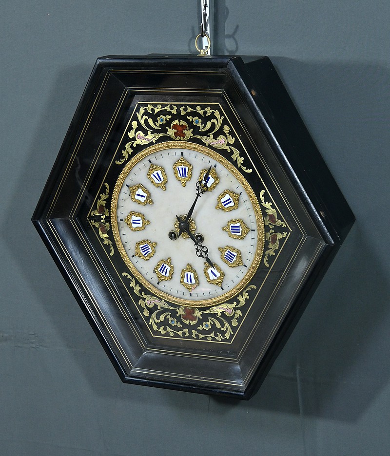Pièce emblématique de l’époque Napoléon III, cette horloge parisienne appelée Œil de Bœuf est une pendule au cadre hexagonal en bois noirci sublimé par des incrustations de laiton qui apportent une richesse visuelle unique. Le cadran en marbre blanc est rehaussé de chiffres romains bleus peints sur de la porcelaine et entouré de petits cadres en bronze minutieusement ouvragés. Ce cadran est entouré d’une belle frise en bronze. L’horloge se remarque par ses incrustations de laiton volutées, de nacre colorée et d’écaille dans l’esprit « Boulle ». Cet objet décoratif allie un savoir-faire artisanal exceptionnel et une esthétique raffinée, caractéristique de cette période.