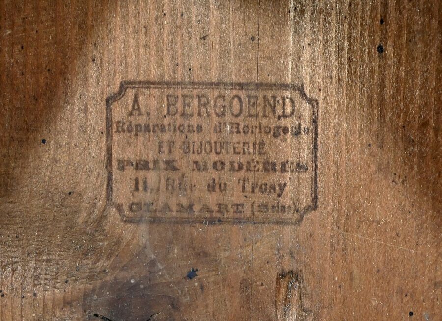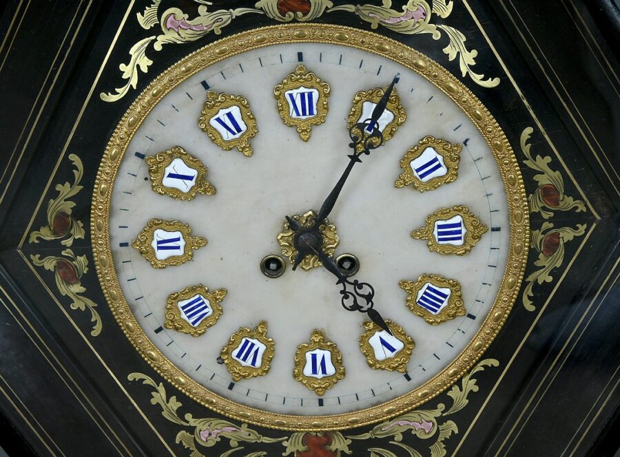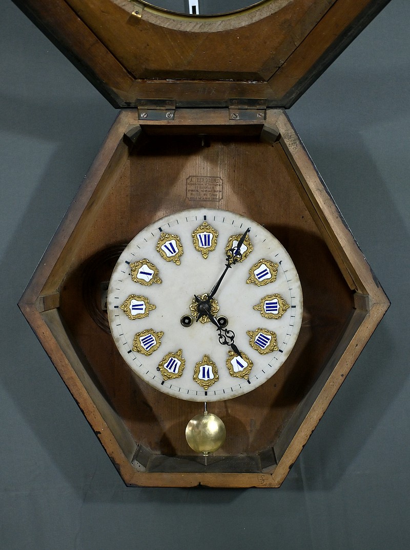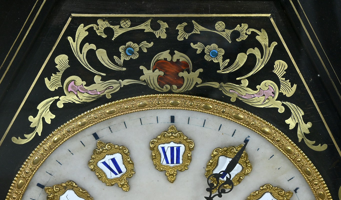 Pièce emblématique de l’époque Napoléon III, cette horloge parisienne appelée Œil de Bœuf est une pendule au cadre hexagonal en bois noirci sublimé par des incrustations de laiton qui apportent une richesse visuelle unique. Le cadran en marbre blanc est rehaussé de chiffres romains bleus peints sur de la porcelaine et entouré de petits cadres en bronze minutieusement ouvragés. Ce cadran est entouré d’une belle frise en bronze. L’horloge se remarque par ses incrustations de laiton volutées, de nacre colorée et d’écaille dans l’esprit « Boulle ». Cet objet décoratif allie un savoir-faire artisanal exceptionnel et une esthétique raffinée, caractéristique de cette période.