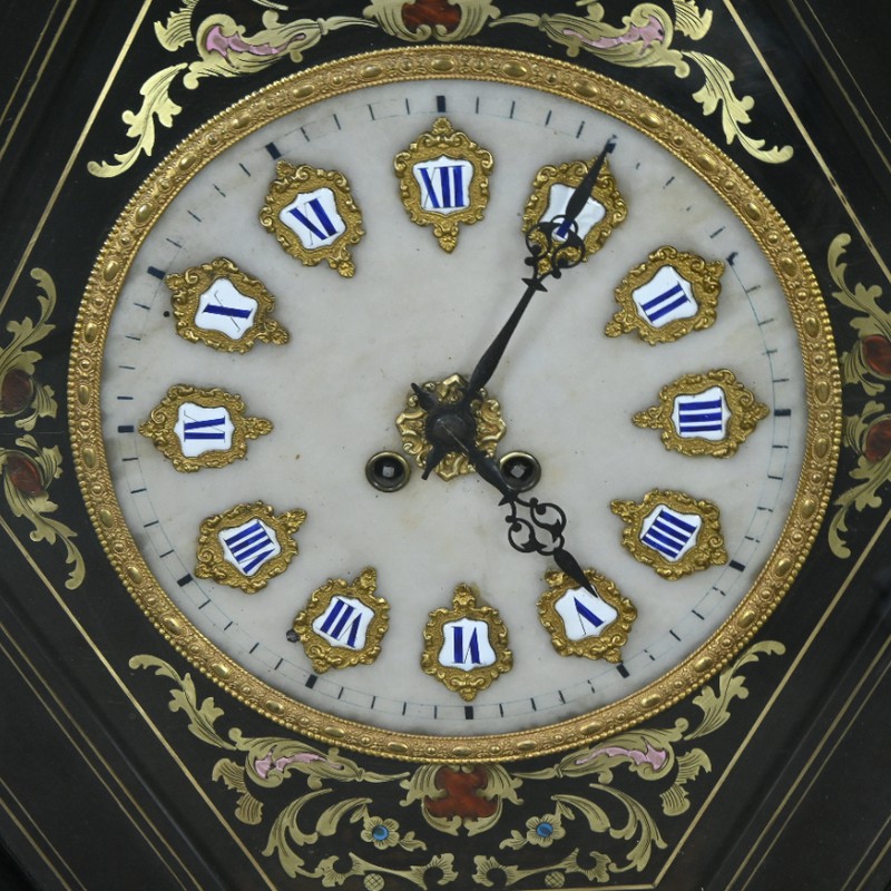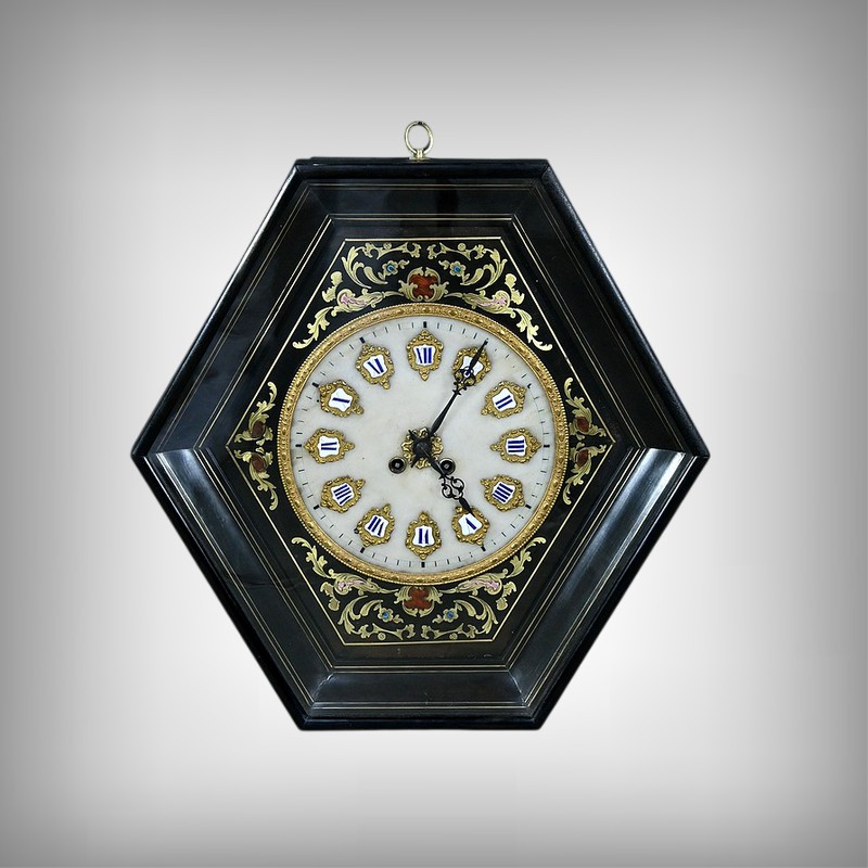 Pièce emblématique de l’époque Napoléon III, cette horloge parisienne appelée Œil de Bœuf est une pendule au cadre hexagonal en bois noirci sublimé par des incrustations de laiton qui apportent une richesse visuelle unique. Le cadran en marbre blanc est rehaussé de chiffres romains bleus peints sur de la porcelaine et entouré de petits cadres en bronze minutieusement ouvragés. Ce cadran est entouré d’une belle frise en bronze. L’horloge se remarque par ses incrustations de laiton volutées, de nacre colorée et d’écaille dans l’esprit « Boulle ». Cet objet décoratif allie un savoir-faire artisanal exceptionnel et une esthétique raffinée, caractéristique de cette période.