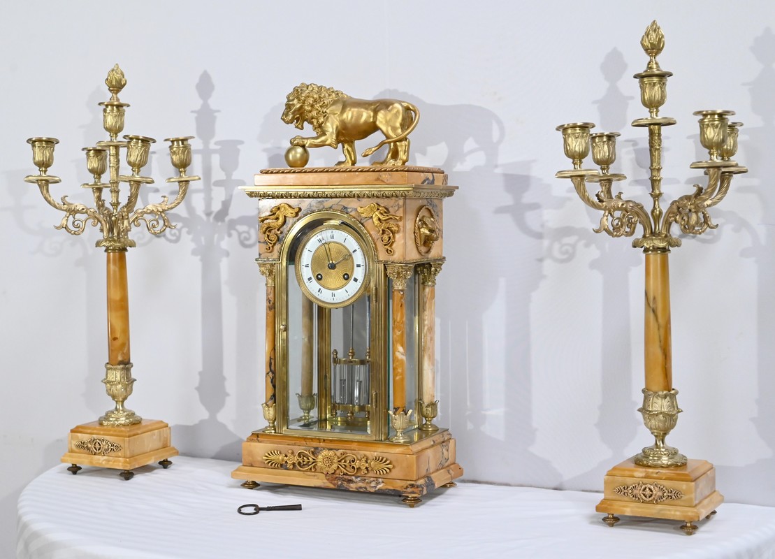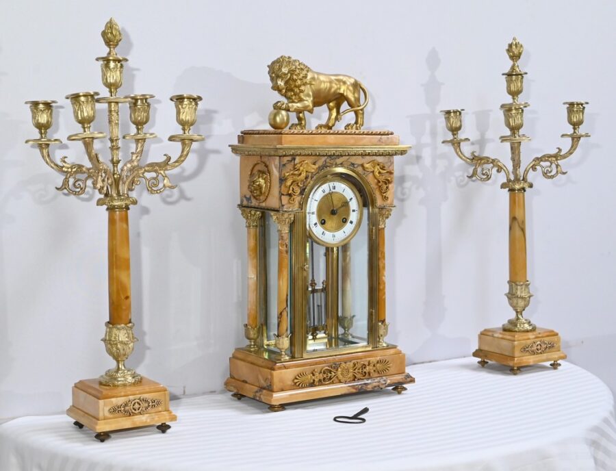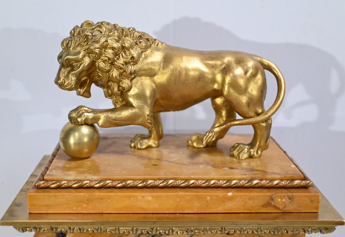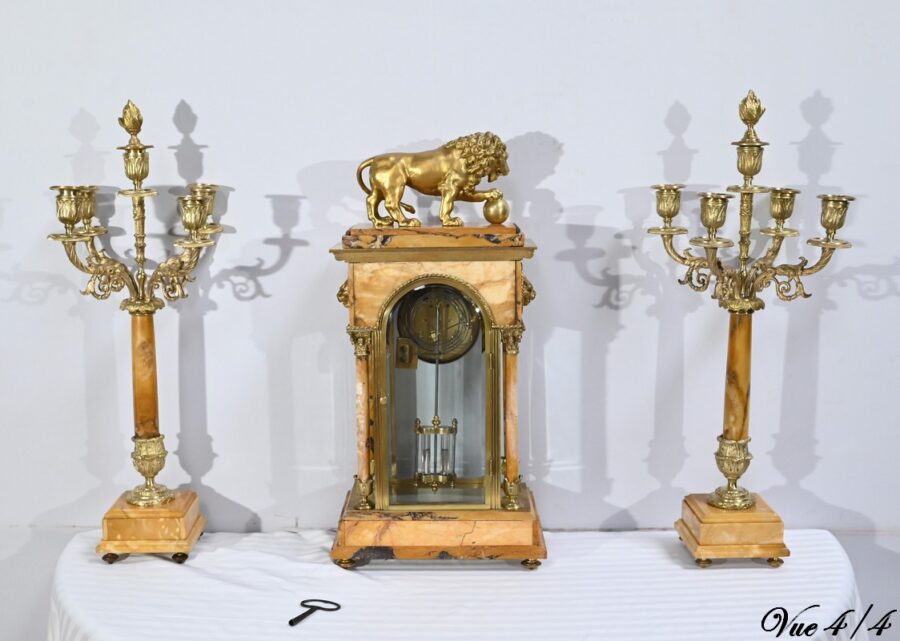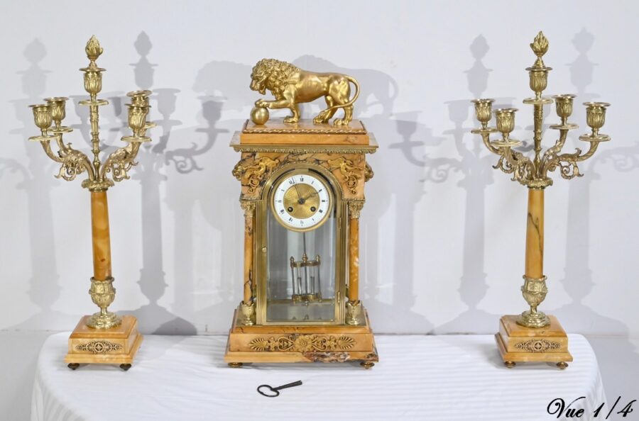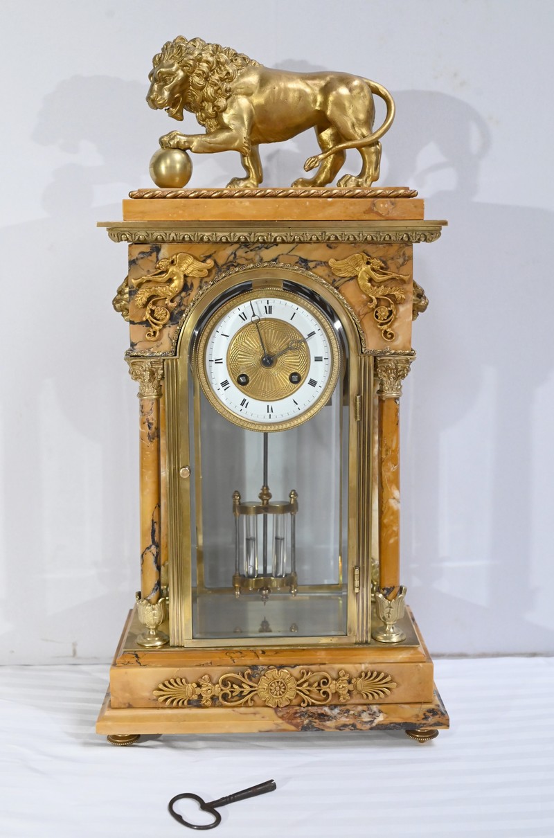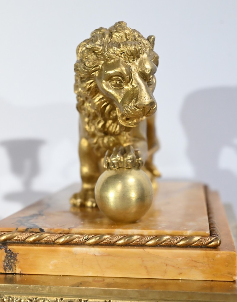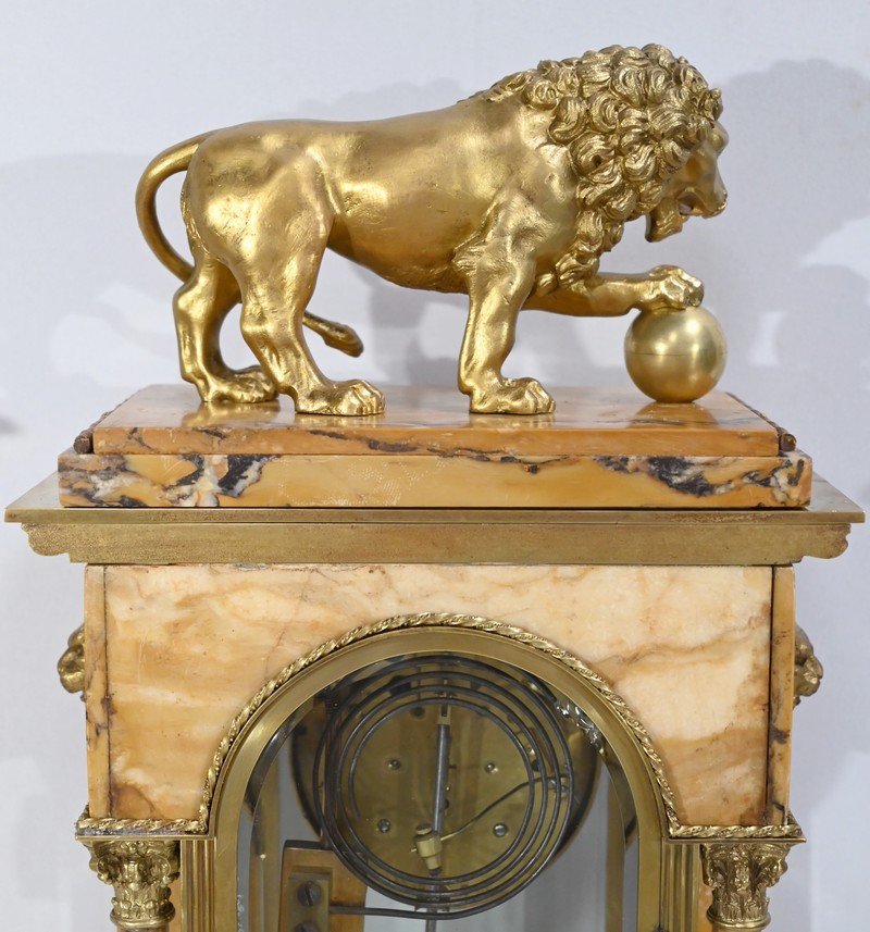 L’horloge en marbre brocatelle de Sienne, réalisée dans l’esprit temple, est sommé d’une sculpture en bronze à patine doré représentant un lion du cirque romain souligné par une baguette torsadée en laiton.