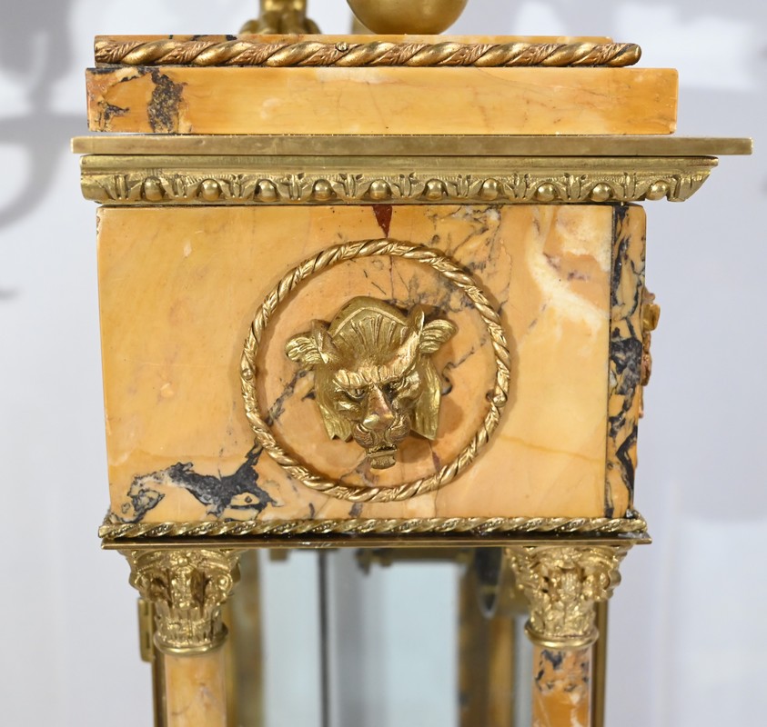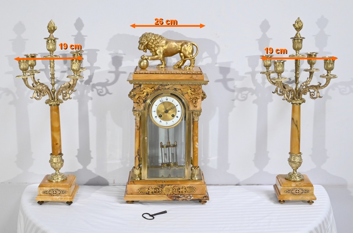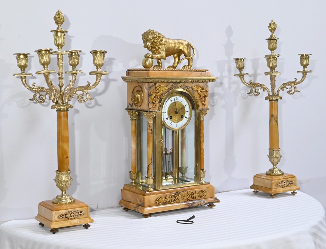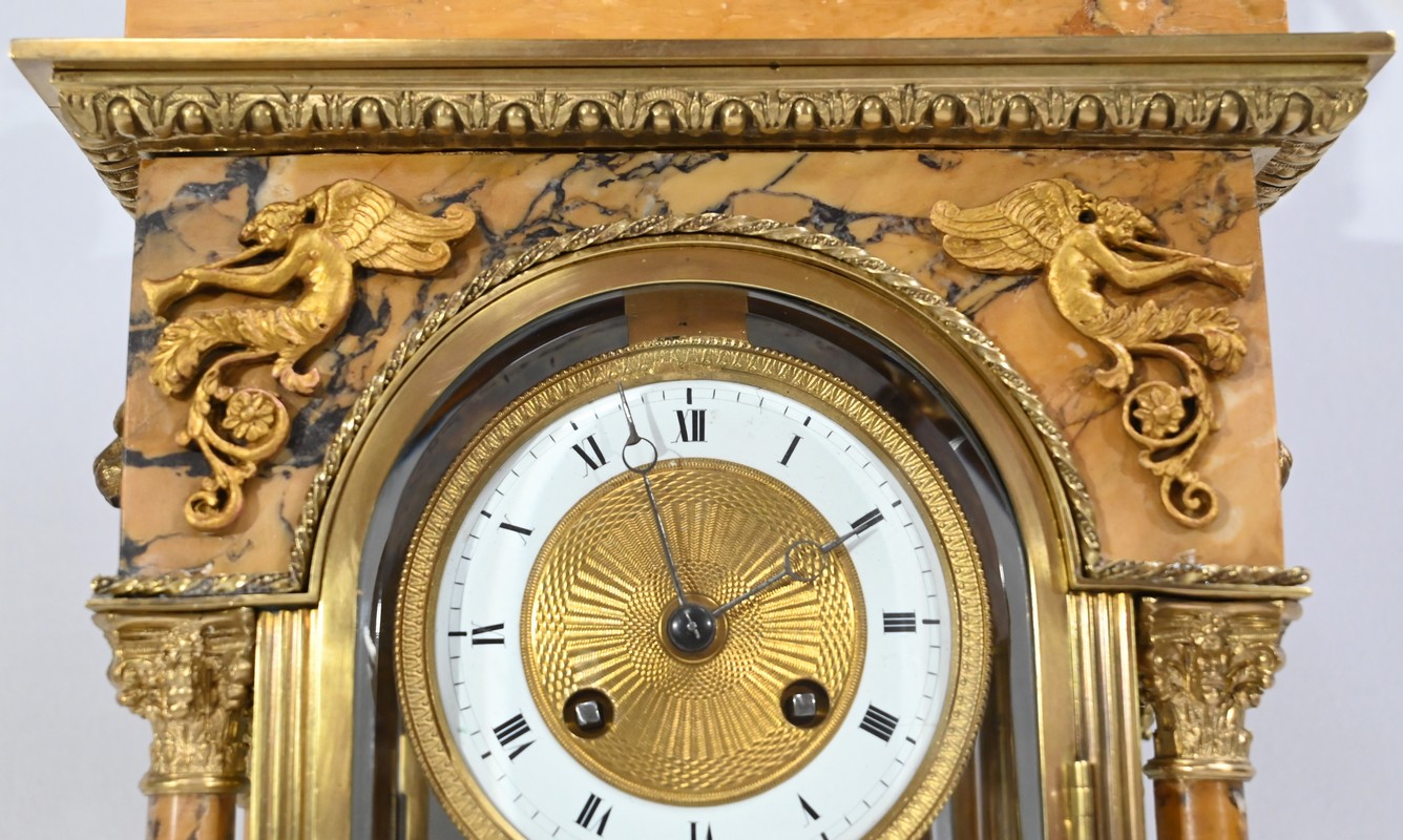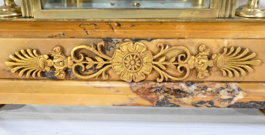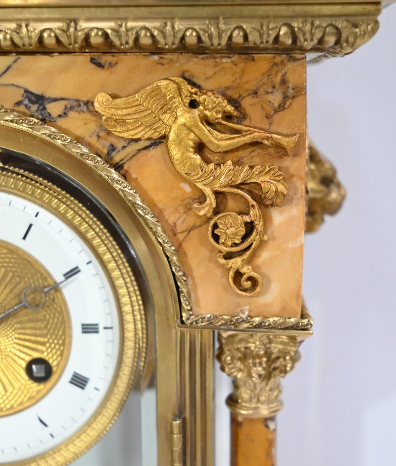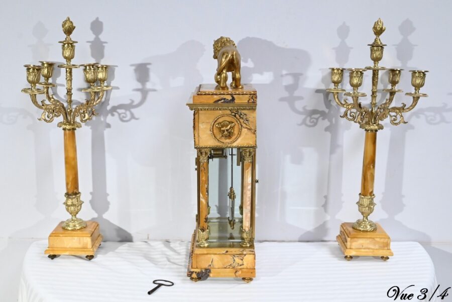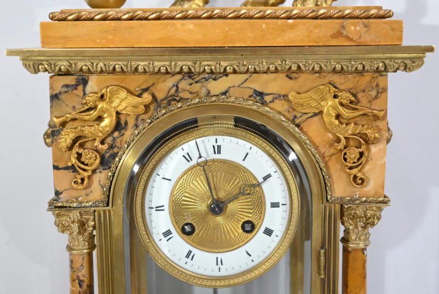 L’horloge en marbre brocatelle de Sienne, réalisée dans l’esprit temple, est sommé d’une sculpture en bronze à patine doré représentant un lion du cirque romain souligné par une baguette torsadée en laiton.
