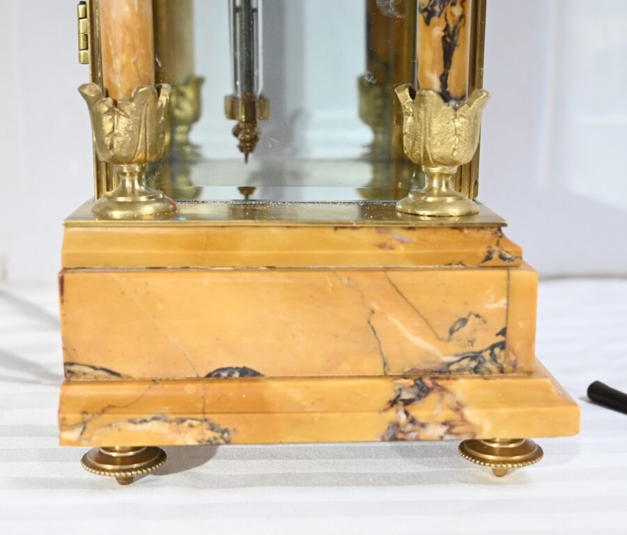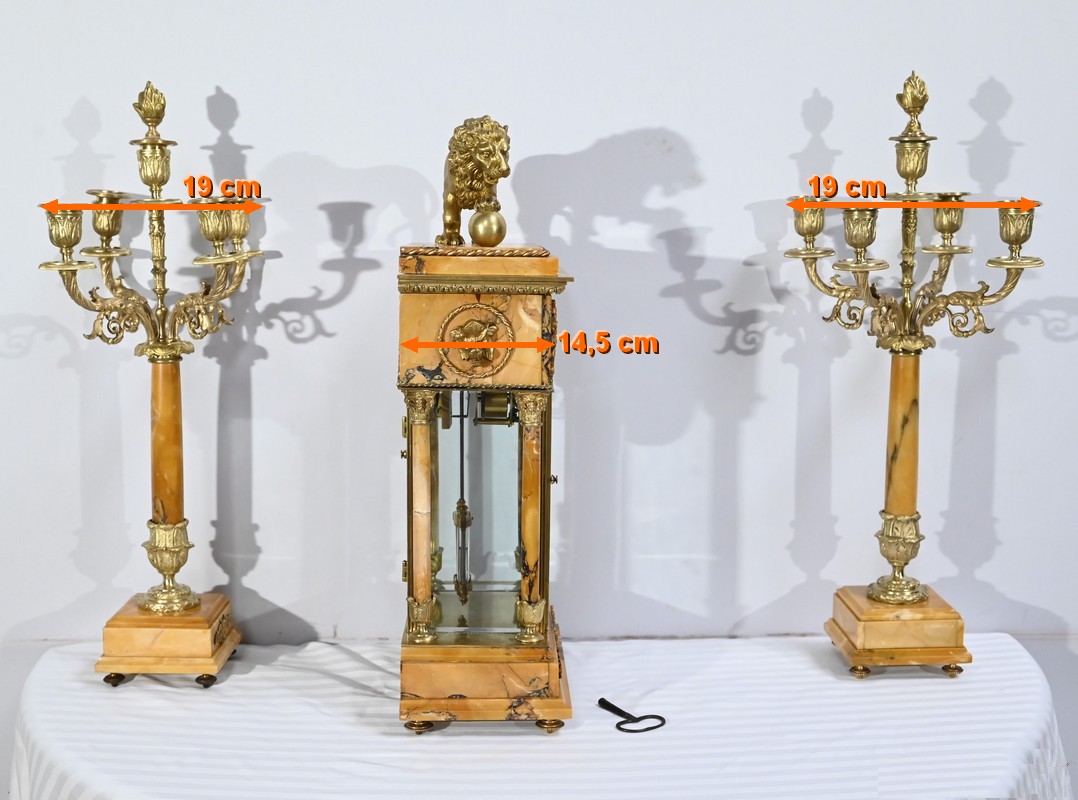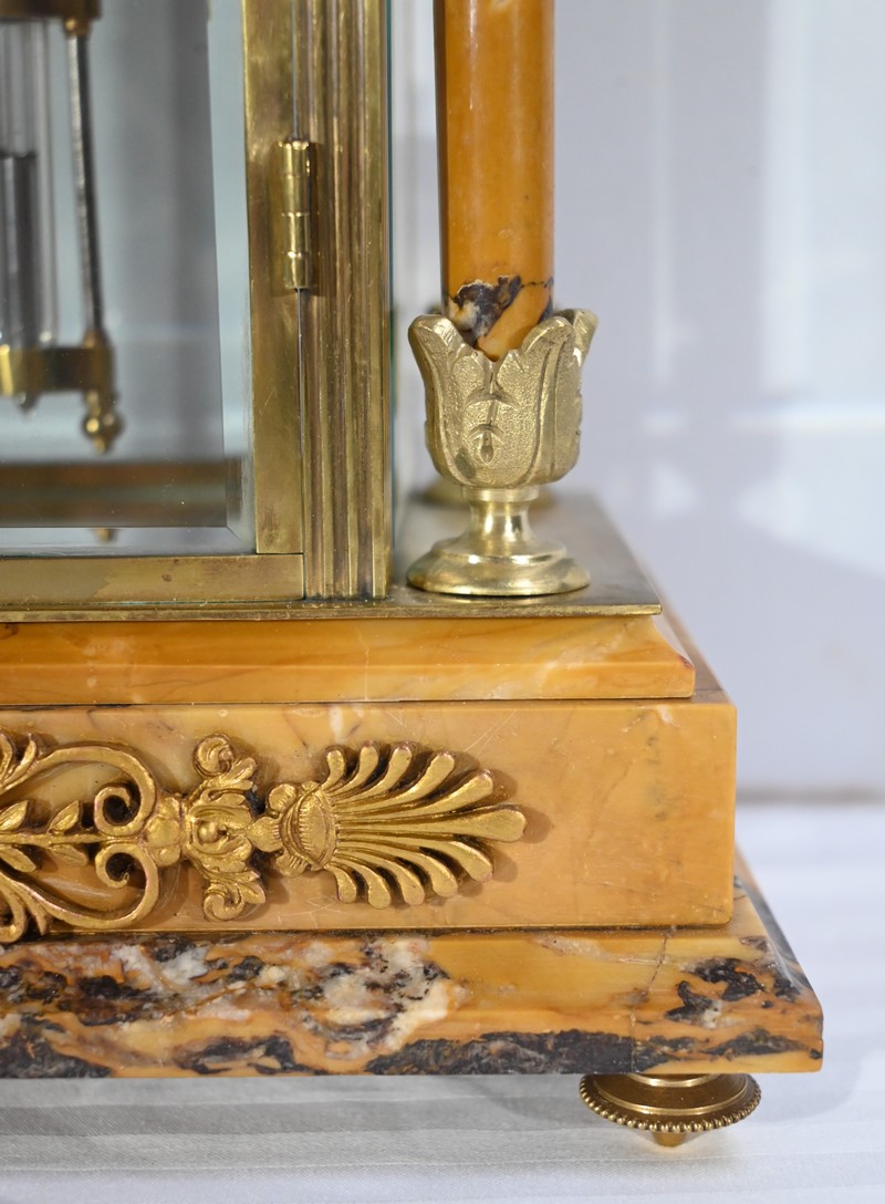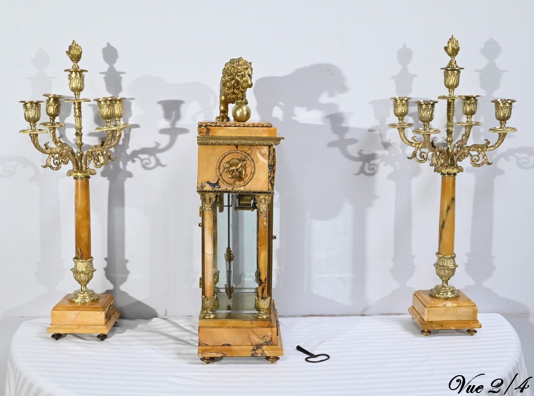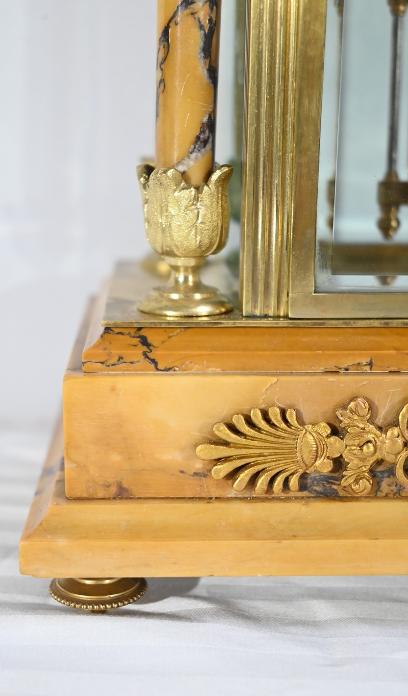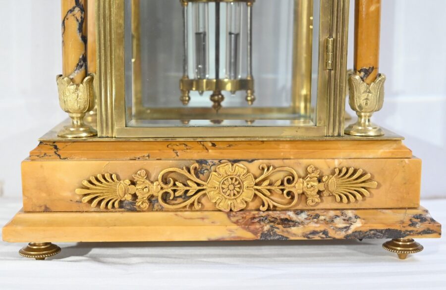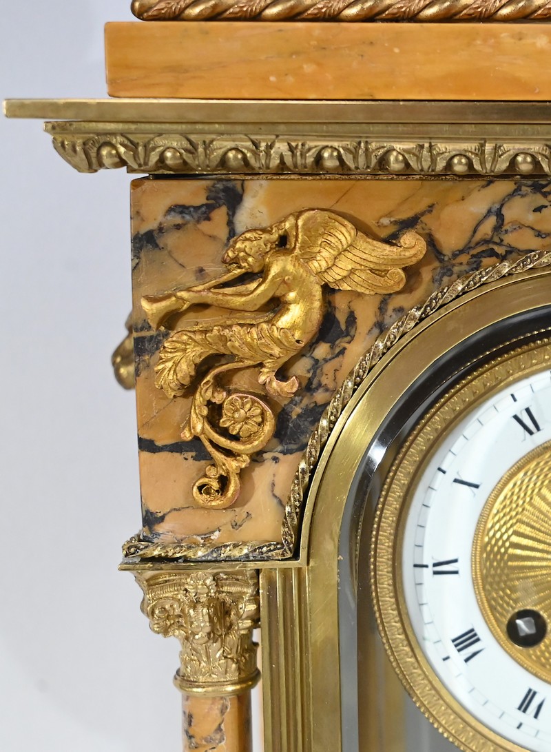 L’horloge en marbre brocatelle de Sienne, réalisée dans l’esprit temple, est sommé d’une sculpture en bronze à patine doré représentant un lion du cirque romain souligné par une baguette torsadée en laiton.