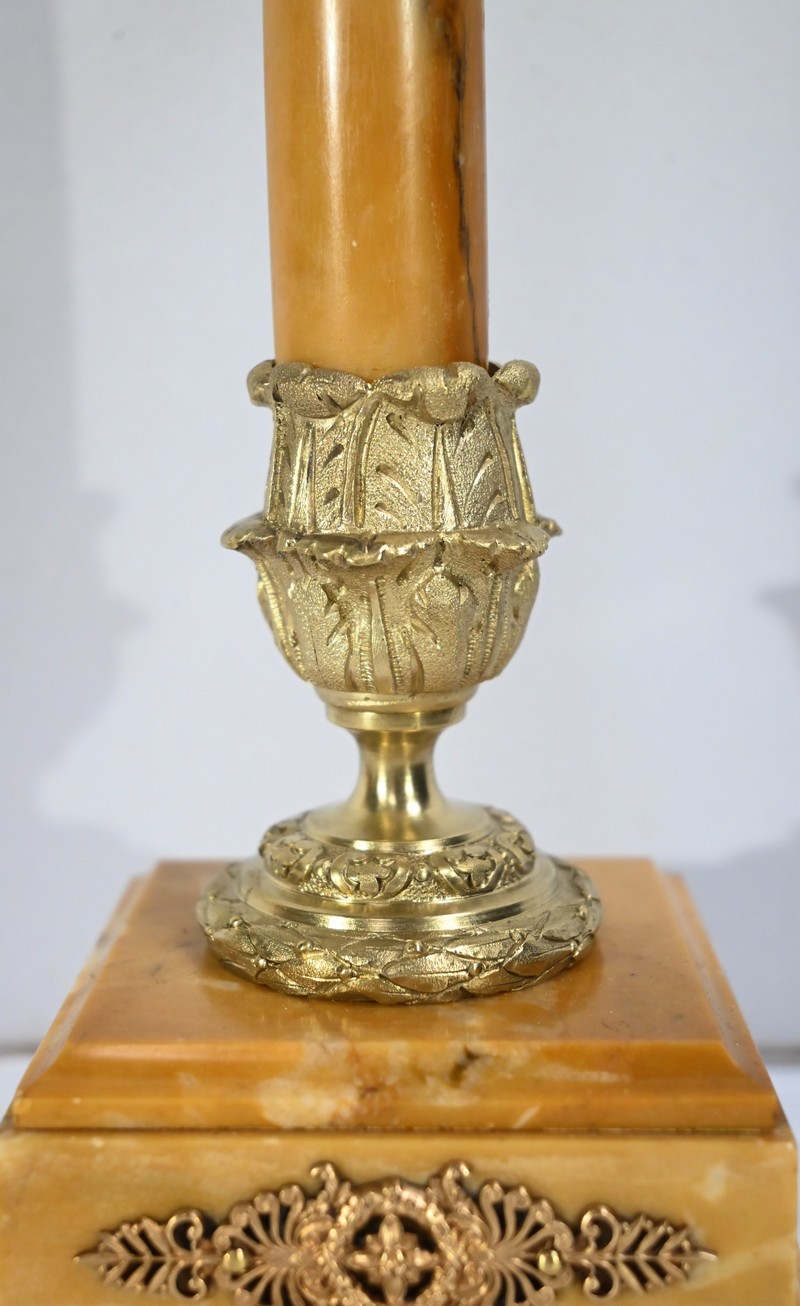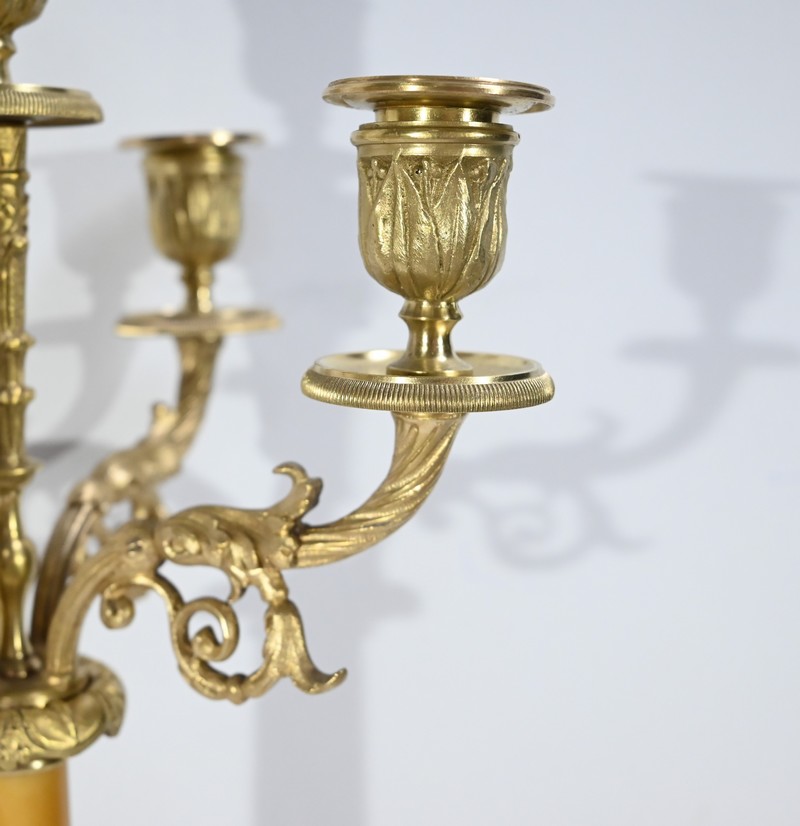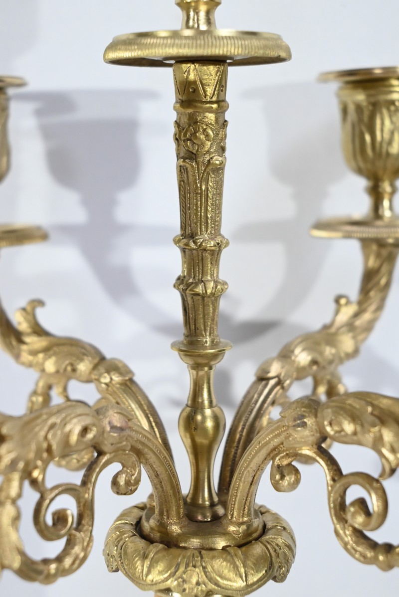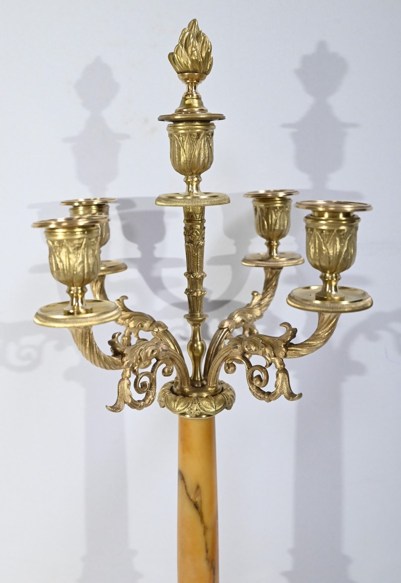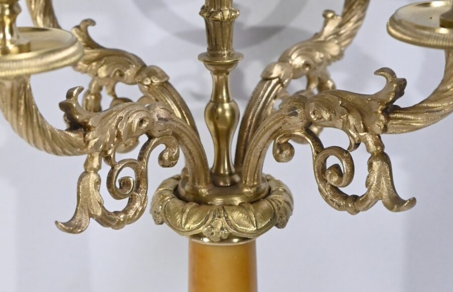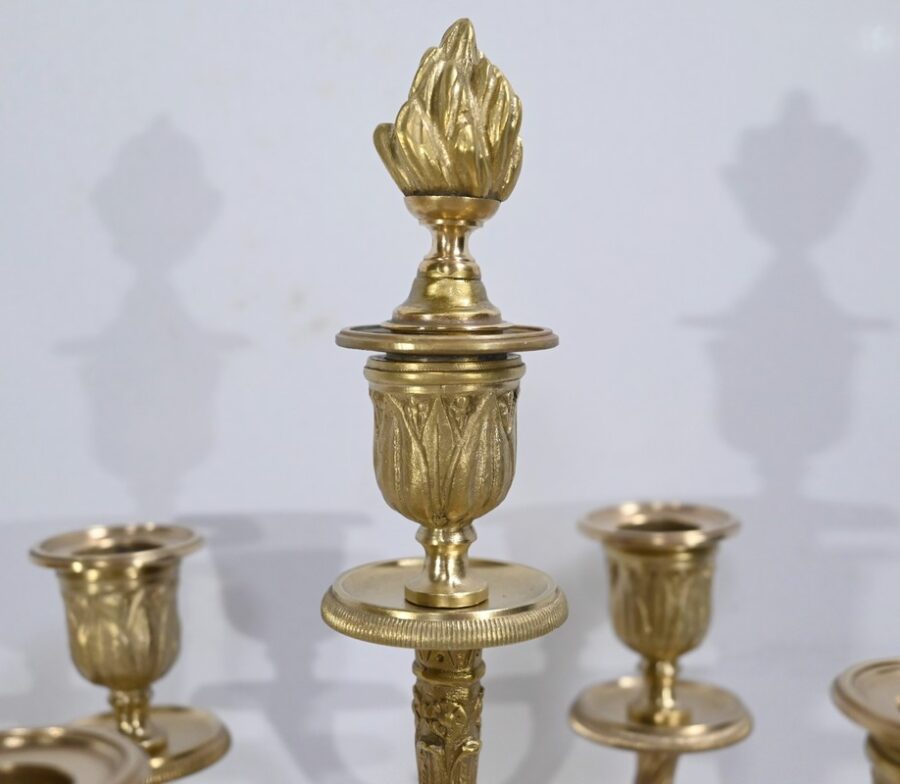 Dans l’esprit de la pendule, les fûts sont soutenus par des calices plus importants reposant sur une base carrée à motifs de palmette et se terminant également par de petits pieds toupies.