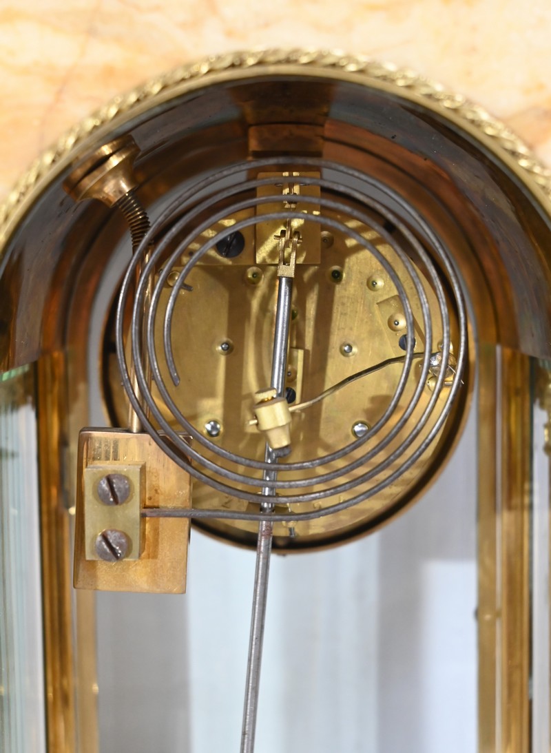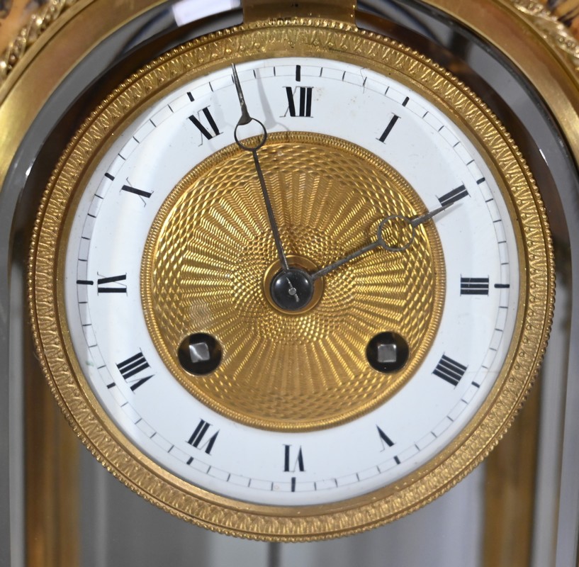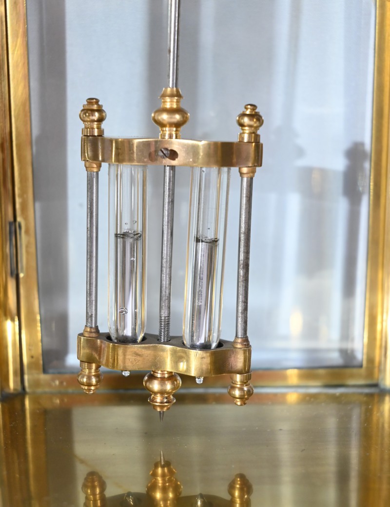 L’intérieur vitré présente une pendule dont le cadran, émaillé et à laiton ciselé, est gradué aux heures en chiffre romain.