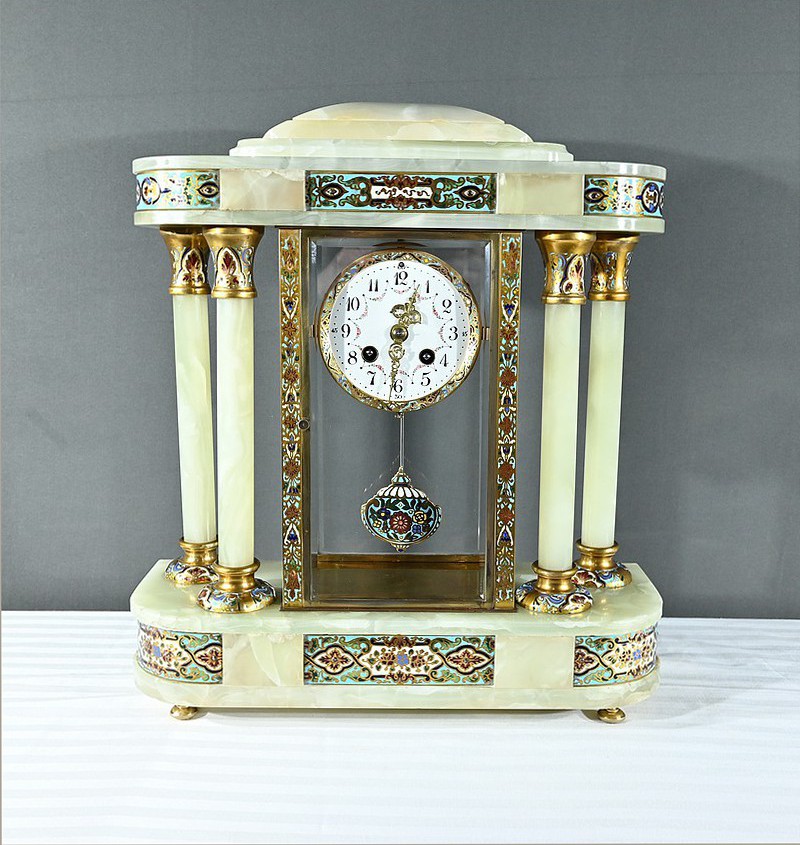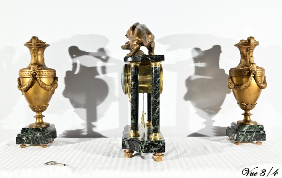 L’horloge en marbre vert de mer est munie d’une base, aux angles concaves, décorée d’un motif en laiton ciselé représentant deux cygnes et une fontaine.