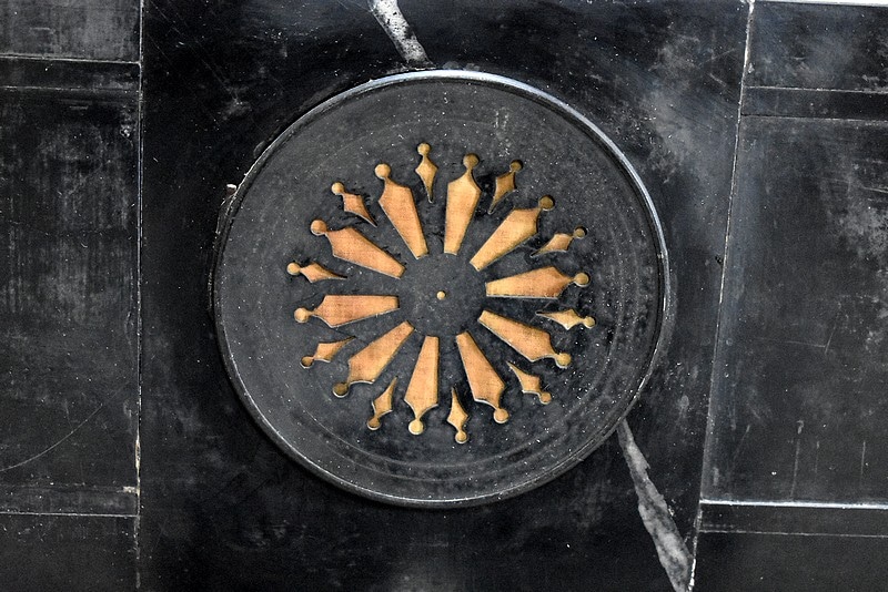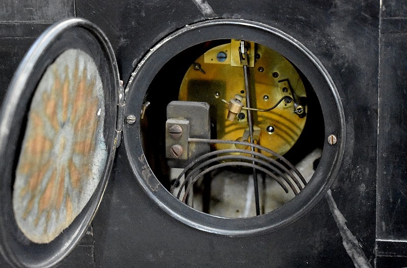 La façade est garnie en partie haute d’un masque de personnage entourés de rinceaux et pommes de pin, de frises surplombant les colonnes détachées ainsi que d’un motif en relief à décors de 3 chérubins de chaque côté. Toutes ces ornementations sont en laiton vieilli, s’ajoutant à des gravures dans le marbre qui ont été dorées.