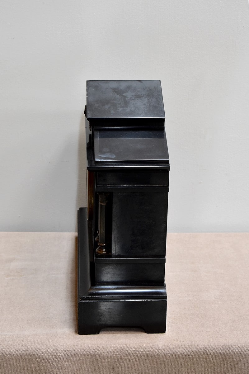 Pendule de cheminée de style Napoléon III en marbre noir uni, très lourde.