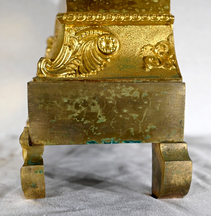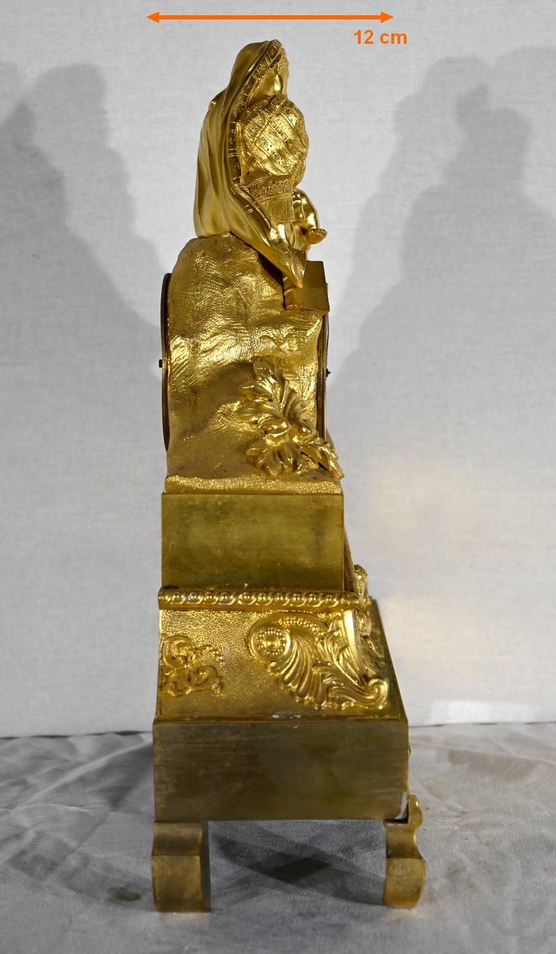 Horloge rectangulaire étagée, à mécanisme à suspension à fil, en bronze doré, figurant « La Vierge à la Chaise », tirée de l’œuvre du peintre italien Raphaël (1483-1520). Marie, assise, tient dans ses bras l’enfant Jésus.