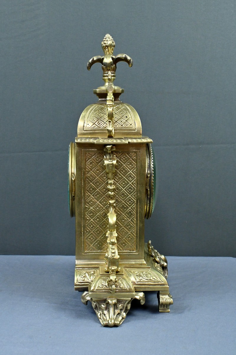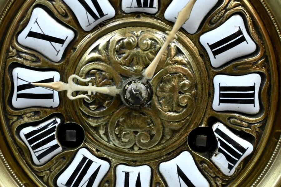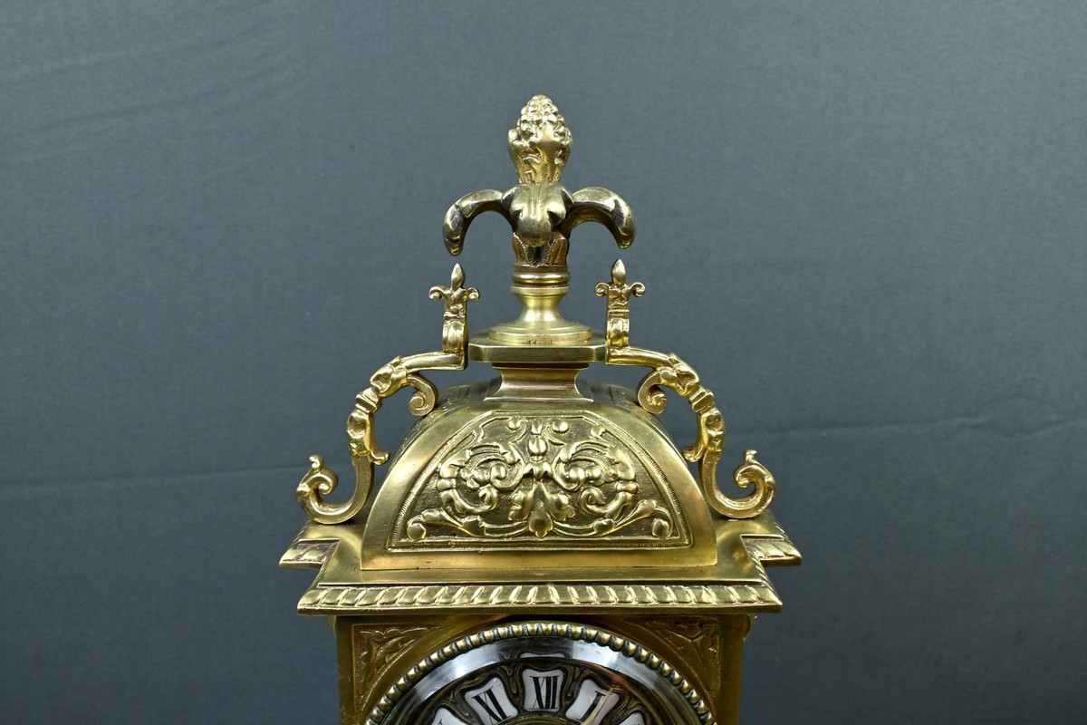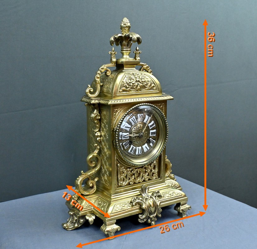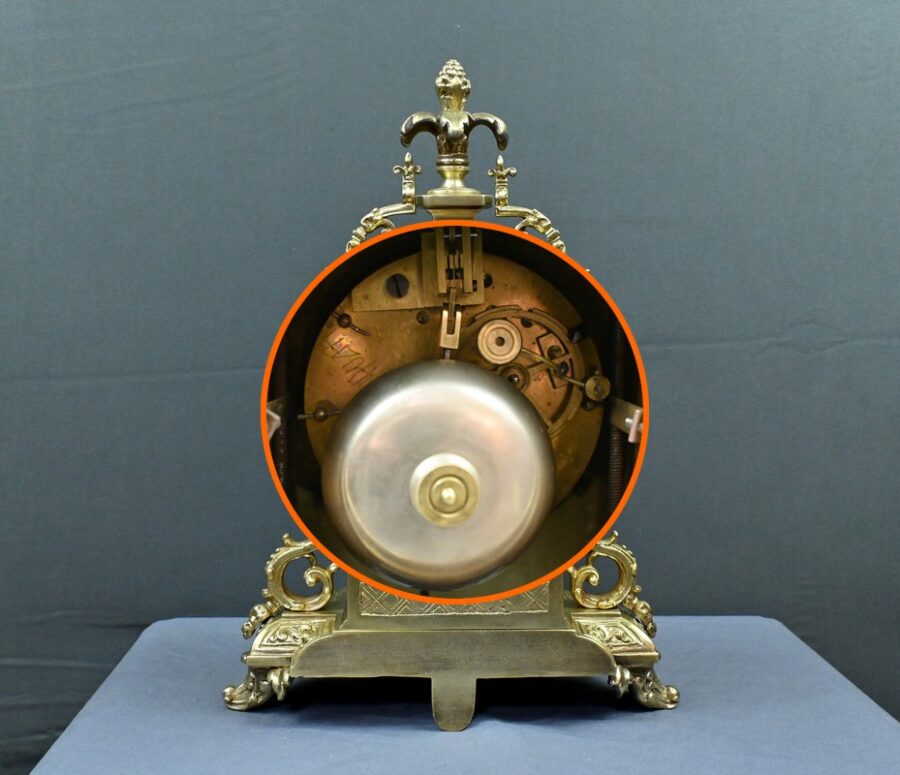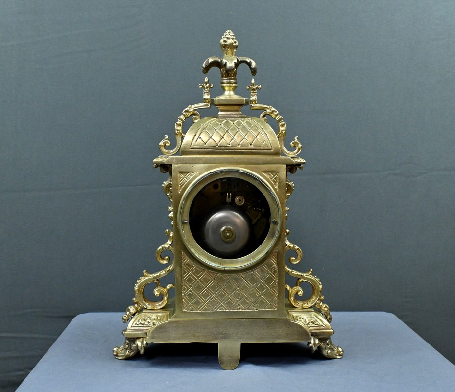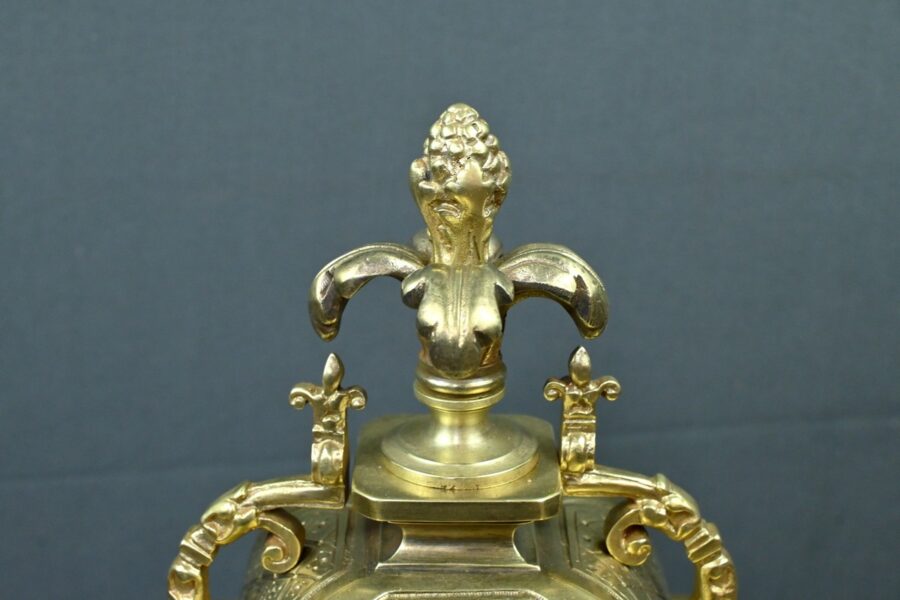 Le sommet est orné d’une pomme de pin naissant d’une fleur, symbole de prospérité et d’éternité, une allégorie subtile qui renforce le prestige de cette horloge.