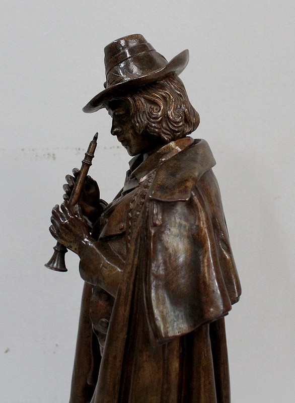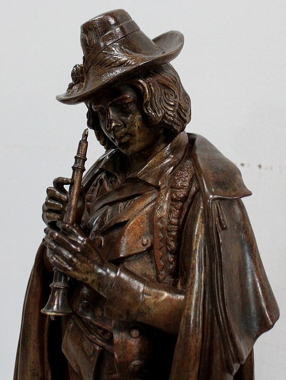Cette Œuvre représente un Musicien tenant une Flûte de ses Mains fines et portant un Chapeau agrémenté de Plumes et d’un Ruban retenu par une Rose. Sur ses épaules, une grande Cape recouvre sa tenue travaillée en détails.