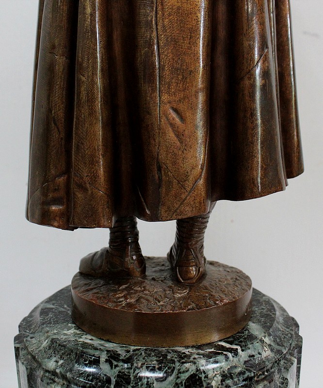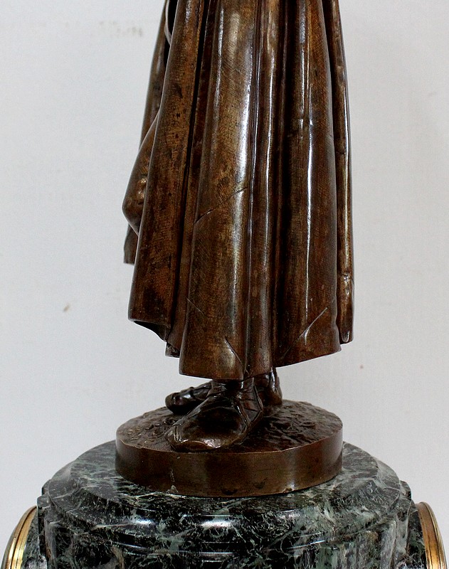 Pendule composée d’une Sculpture en Bronze à Patine Brune figurant un Joueur de Flûte, surmontant une Base en Marbre Vert d’Écume de Mer.