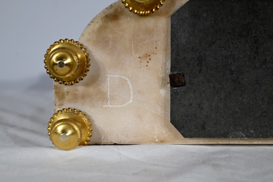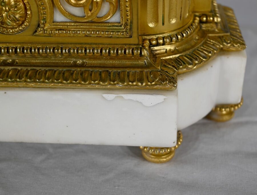 La façade à motifs de rinceaux est ajourée et laisse apparaître un marbre blanc, identique à celui sur lequel est fixé ce garde temps.