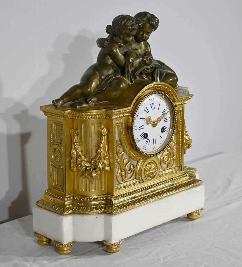 Cette pendule en bronze doré est délicatement ciselée de rinceaux, de feuilles d’acanthe, de perles et de guirlandes. Elle est sommée d’une sculpture en bronze, à patine brune, figurant deux enfants, en position semi-allongée, parcourant un ouvrage. Le garçon semble avoir un regard protecteur sur la jeune fille à ses côtés, tandis que celle-ci se recouvre le bras d’un drapé tout en continuant sa lecture.