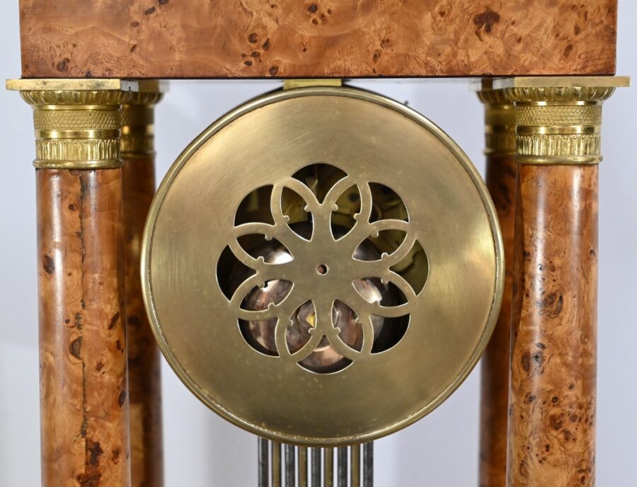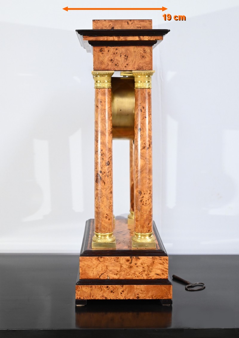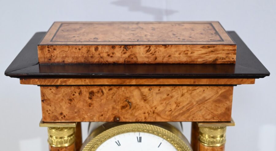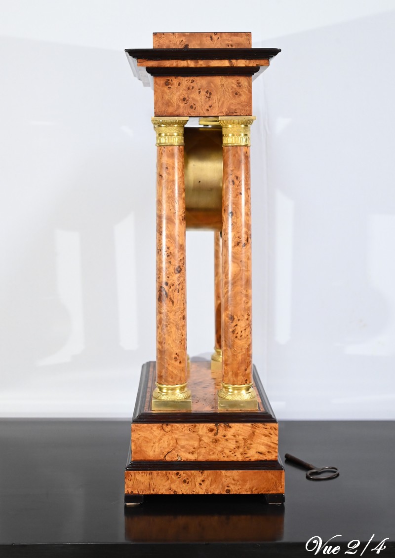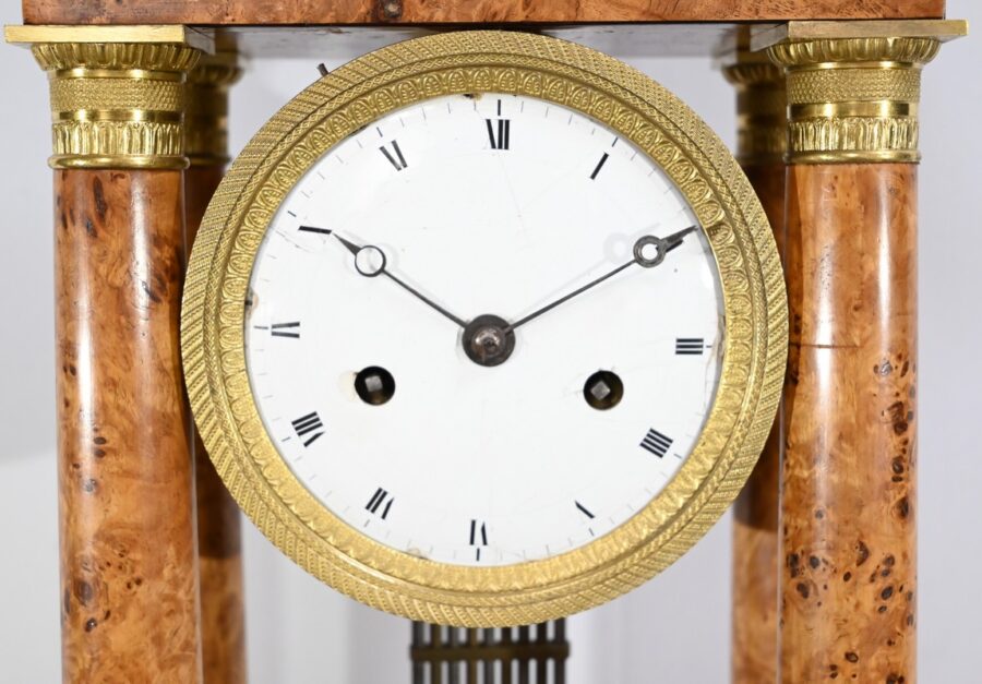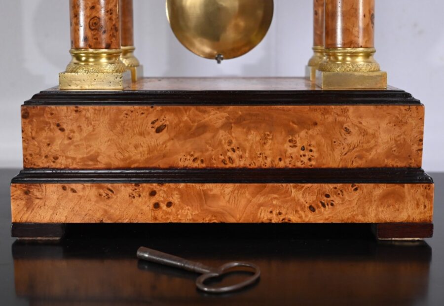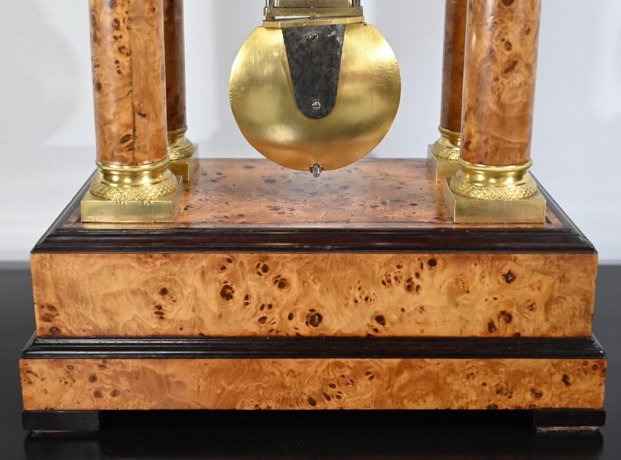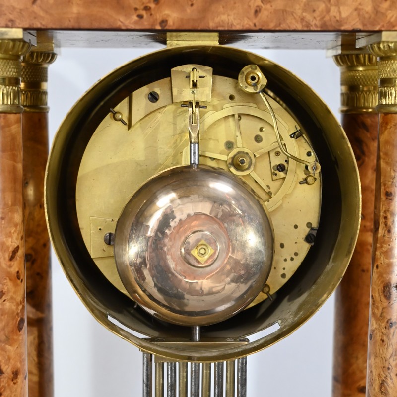 Cette pendule en loupes de thuya à colonnes agrémentées de bagues de laiton délicatement ciselées présente un chapiteau et une base étagée.