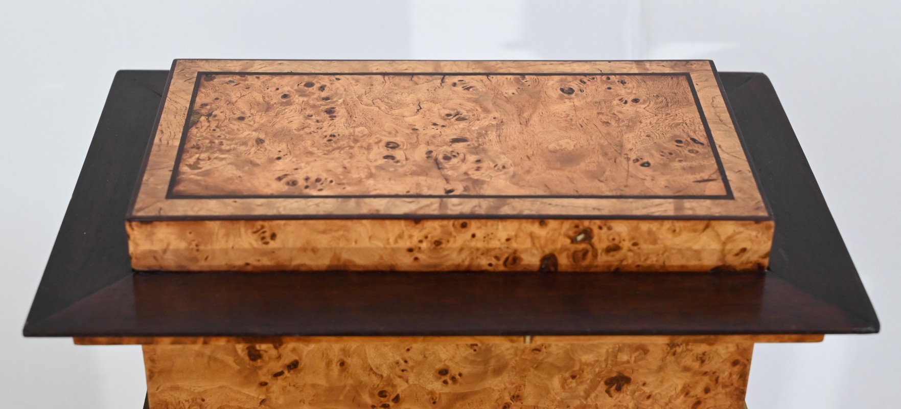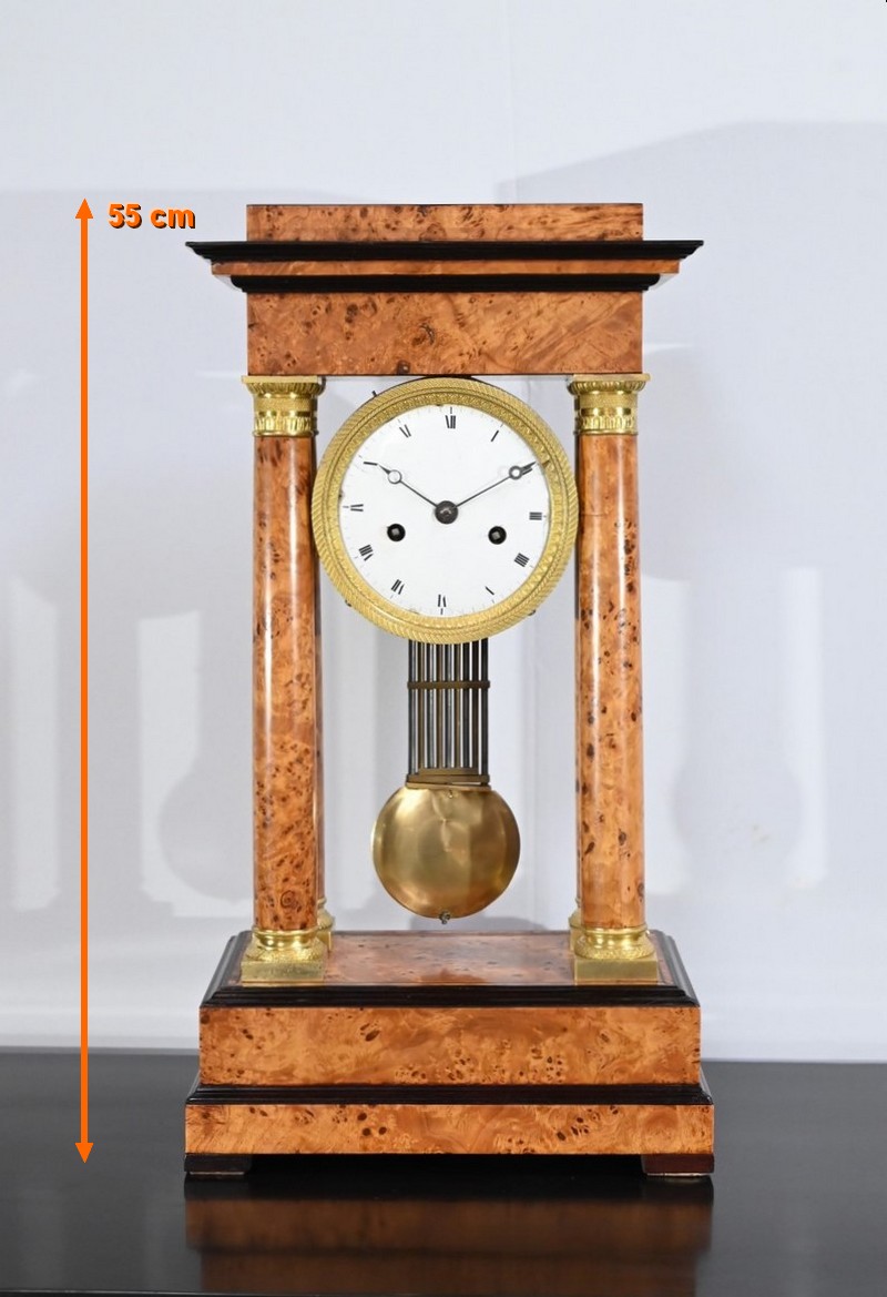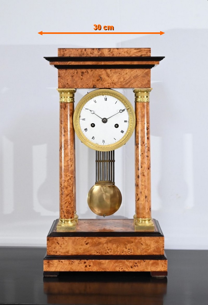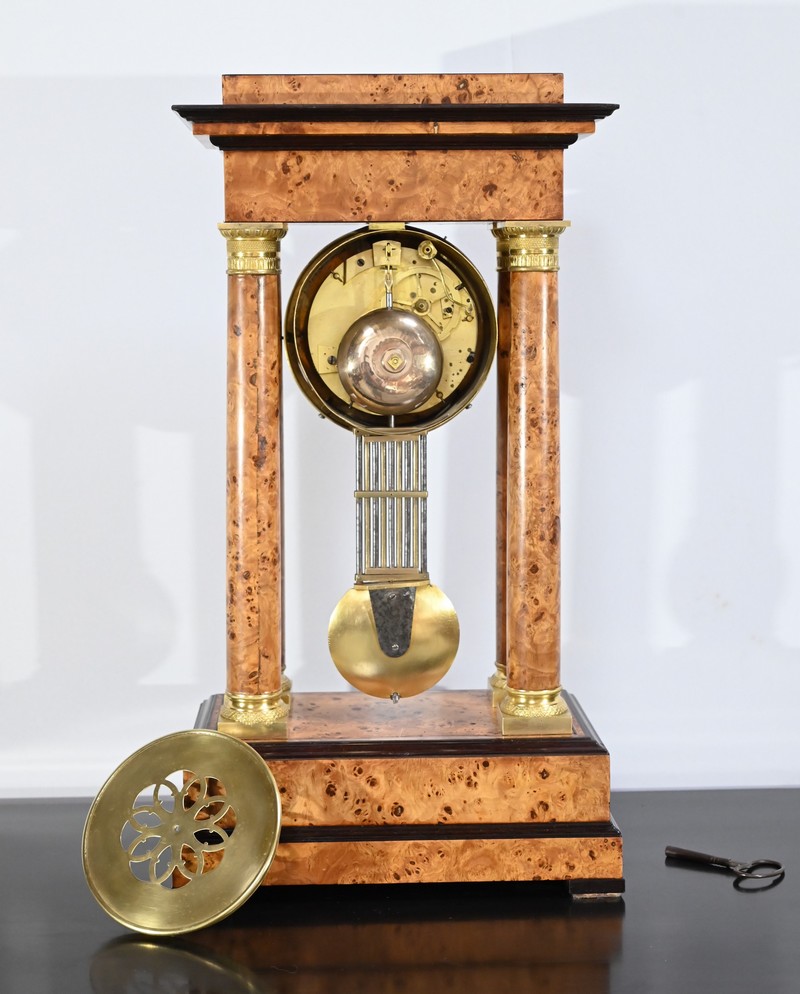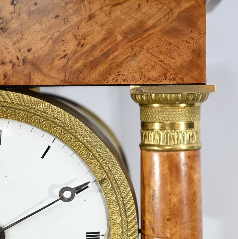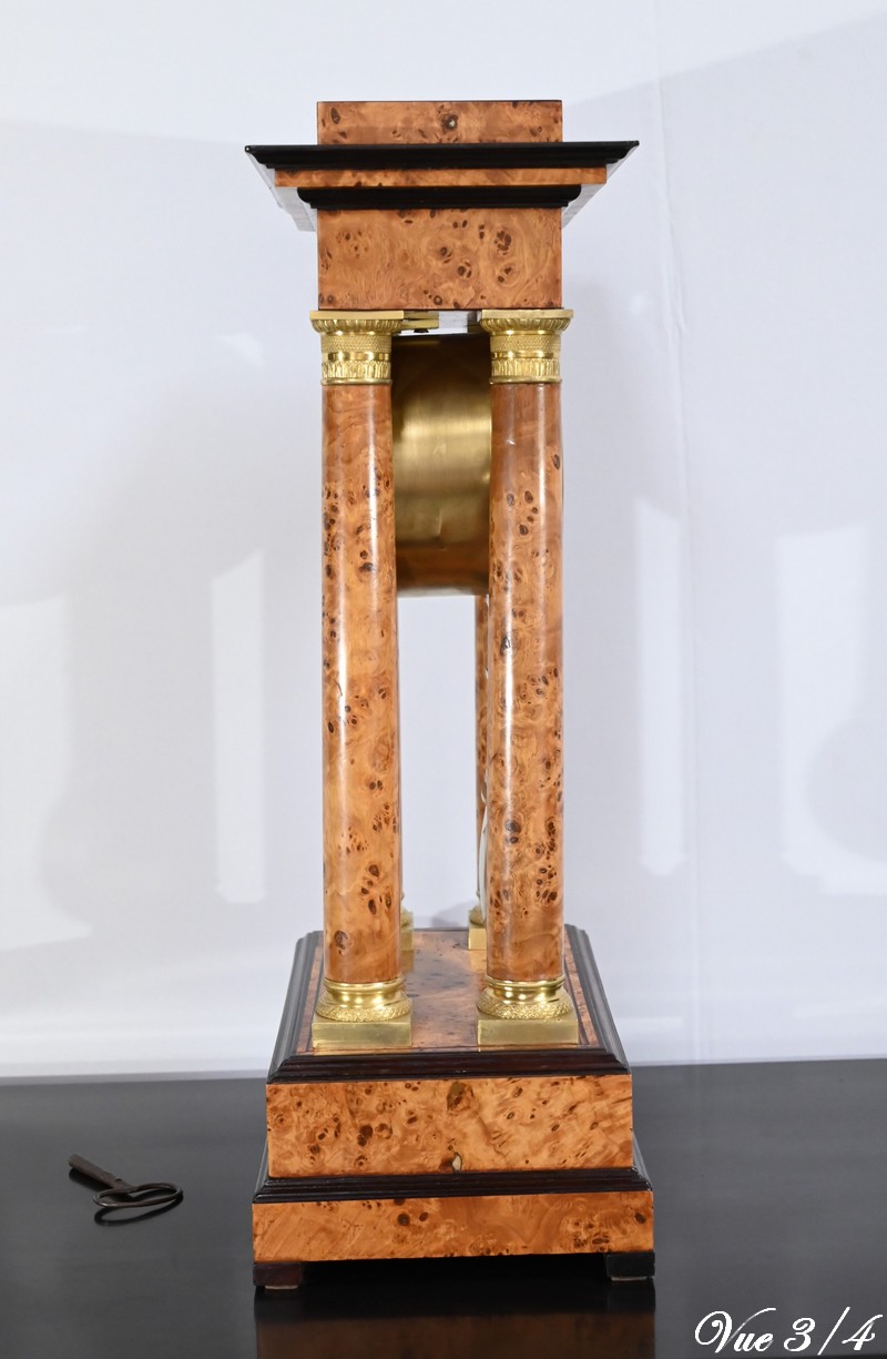 Cette pendule en loupes de thuya à colonnes agrémentées de bagues de laiton délicatement ciselées présente un chapiteau et une base étagée.