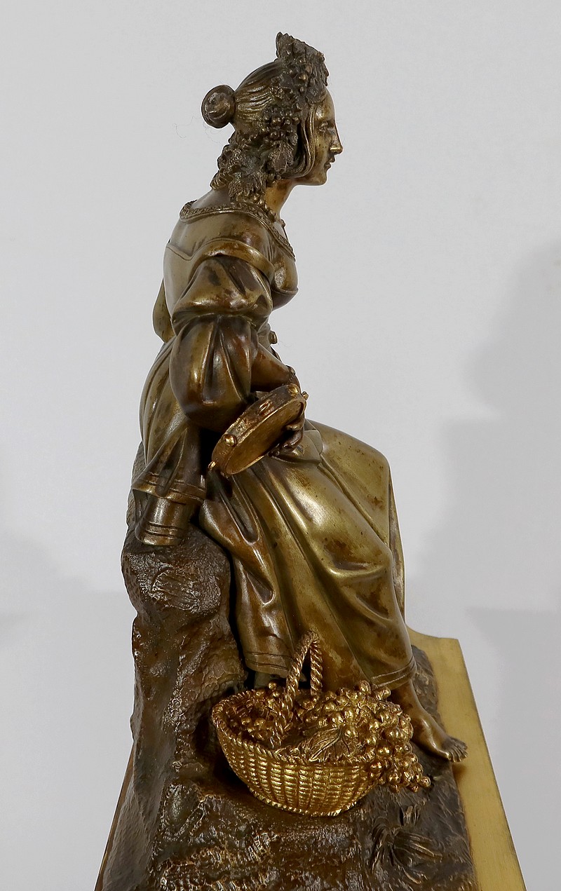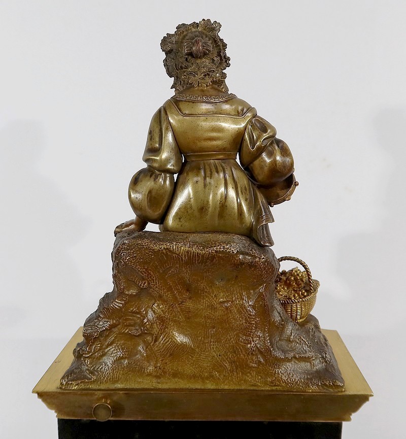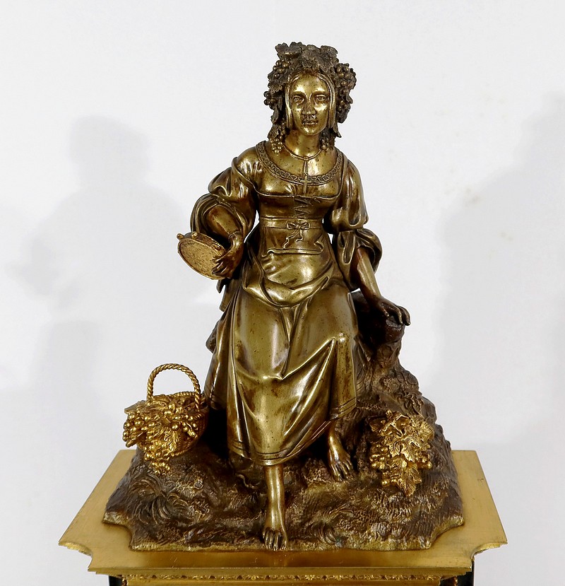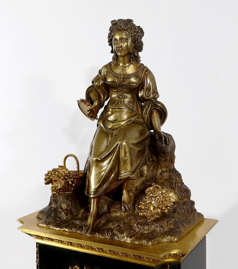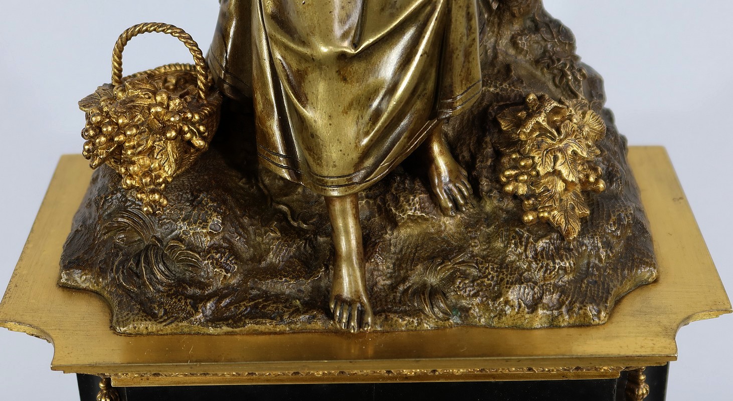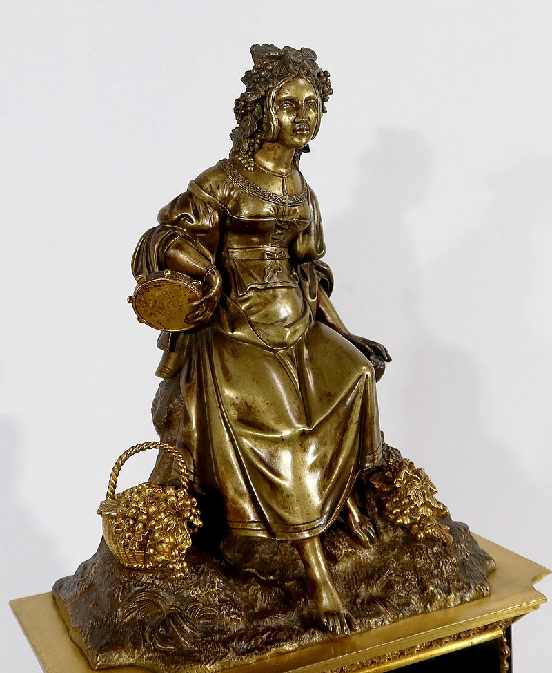 Cette belle pendule est sommée d’une galante tenant un tambourin et accompagnée d’un panier rempli de raisin à ses pieds. La sculpture en bronze à patine médaille se distingue du tambourin, du panier et des grappes de raisin, travaillés quant à eux, en bronze doré.