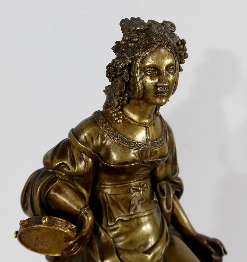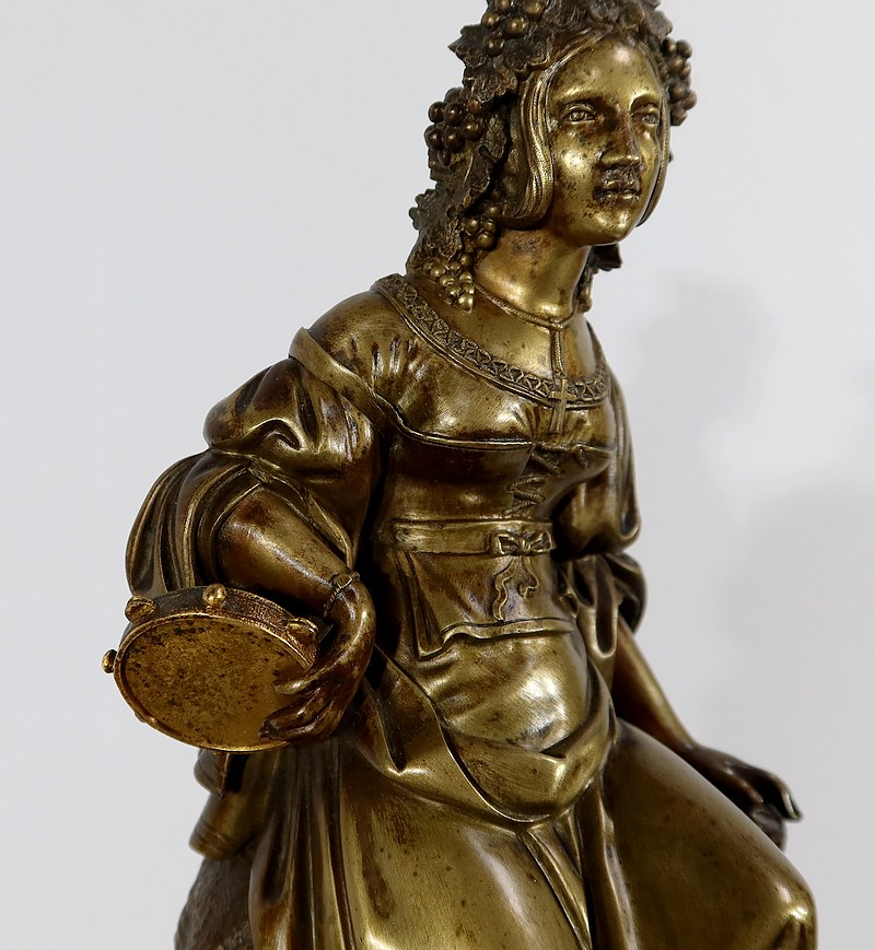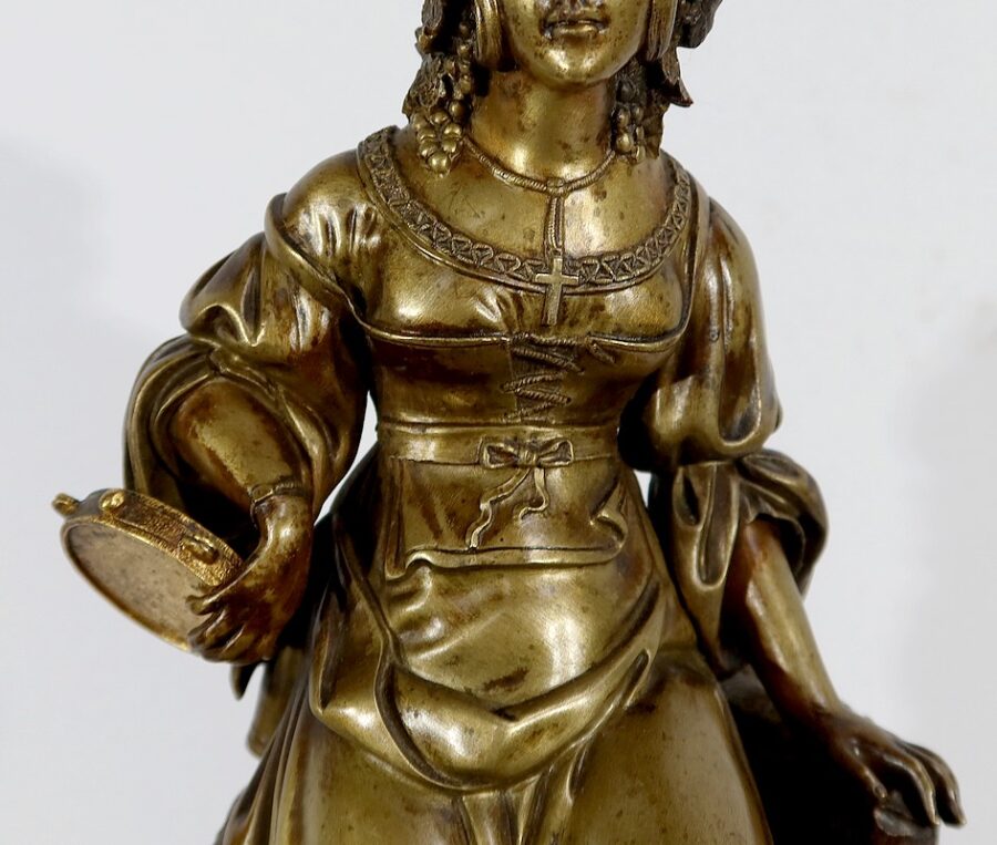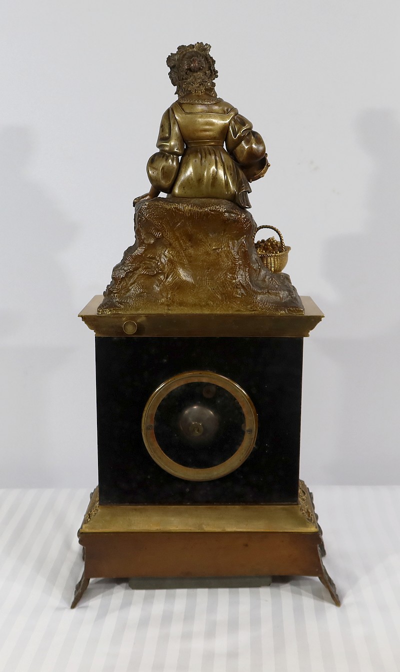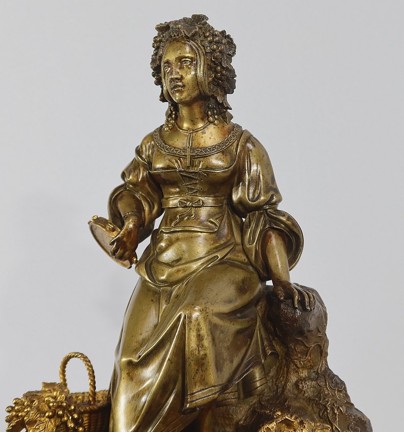 Cette belle pendule est sommée d’une galante tenant un tambourin et accompagnée d’un panier rempli de raisin à ses pieds. La sculpture en bronze à patine médaille se distingue du tambourin, du panier et des grappes de raisin, travaillés quant à eux, en bronze doré.