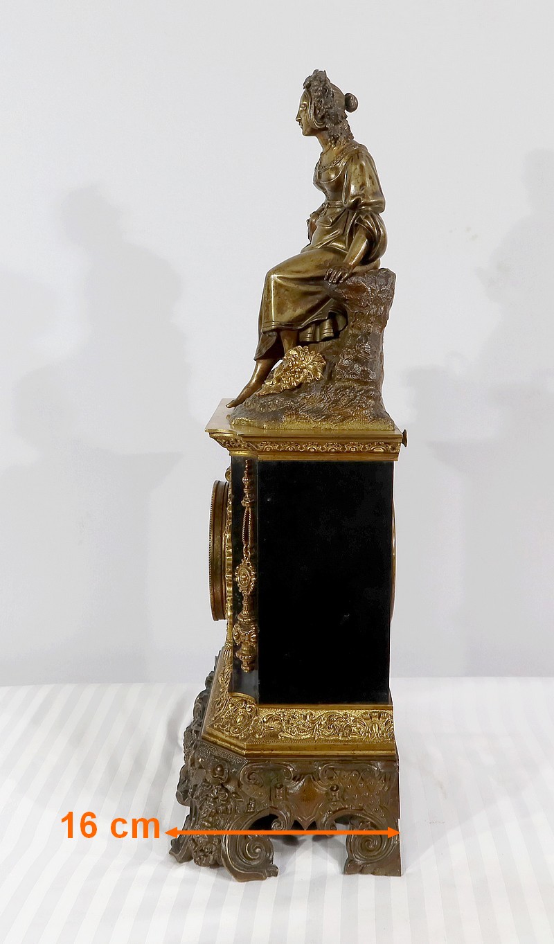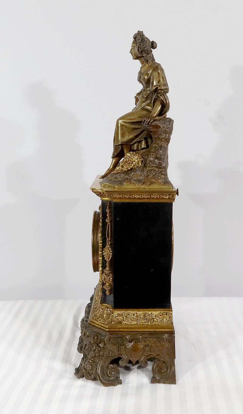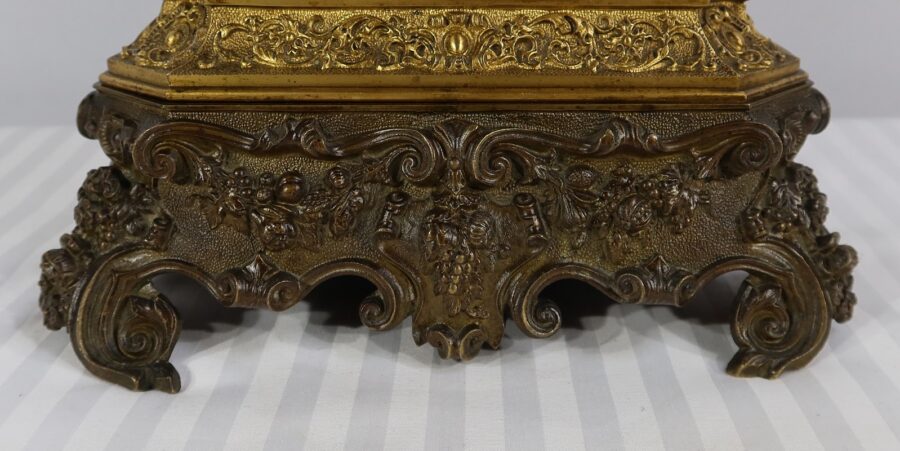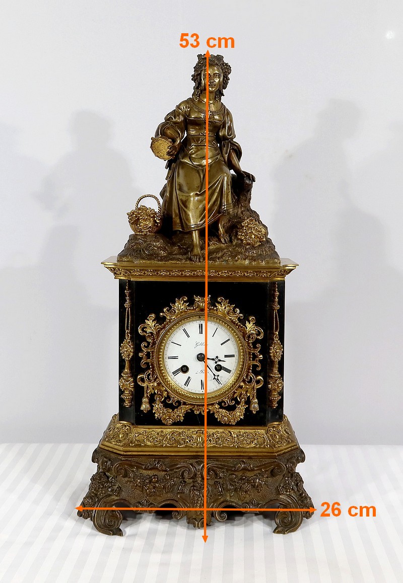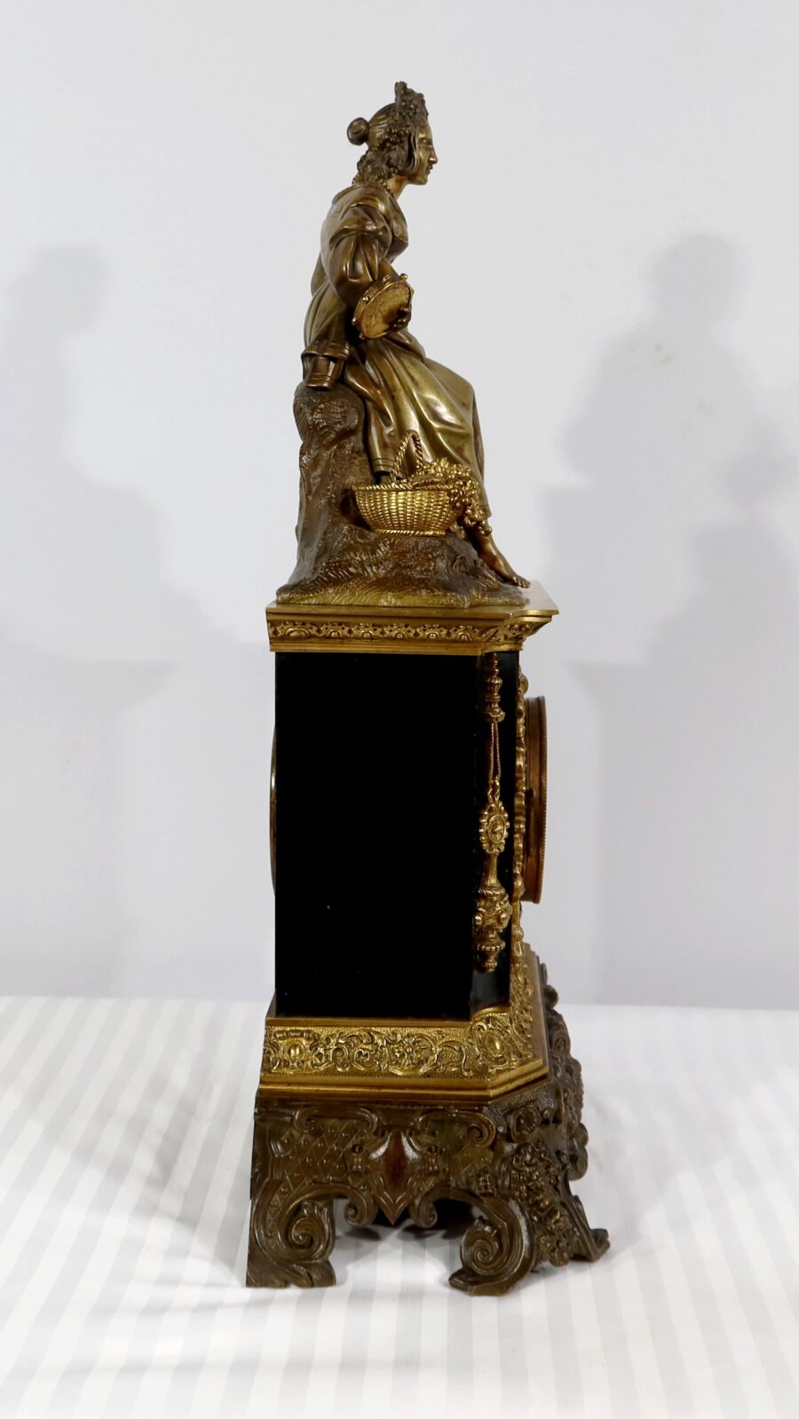 Cette belle pendule est sommée d’une galante tenant un tambourin et accompagnée d’un panier rempli de raisin à ses pieds. La sculpture en bronze à patine médaille se distingue du tambourin, du panier et des grappes de raisin, travaillés quant à eux, en bronze doré.