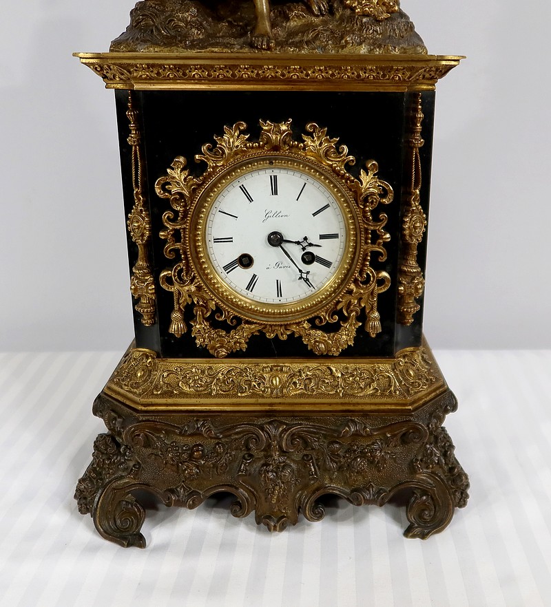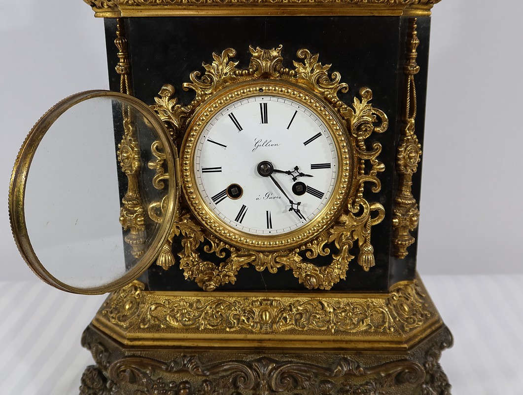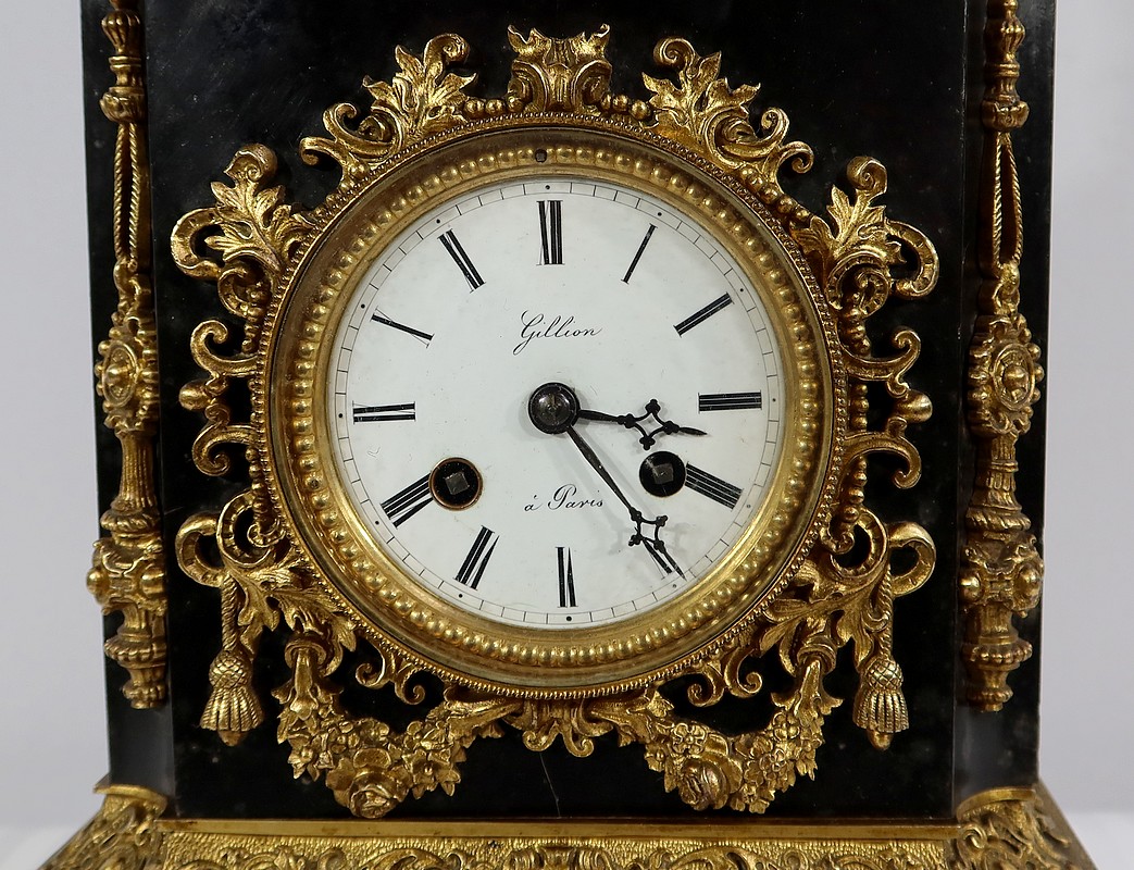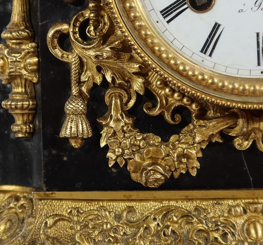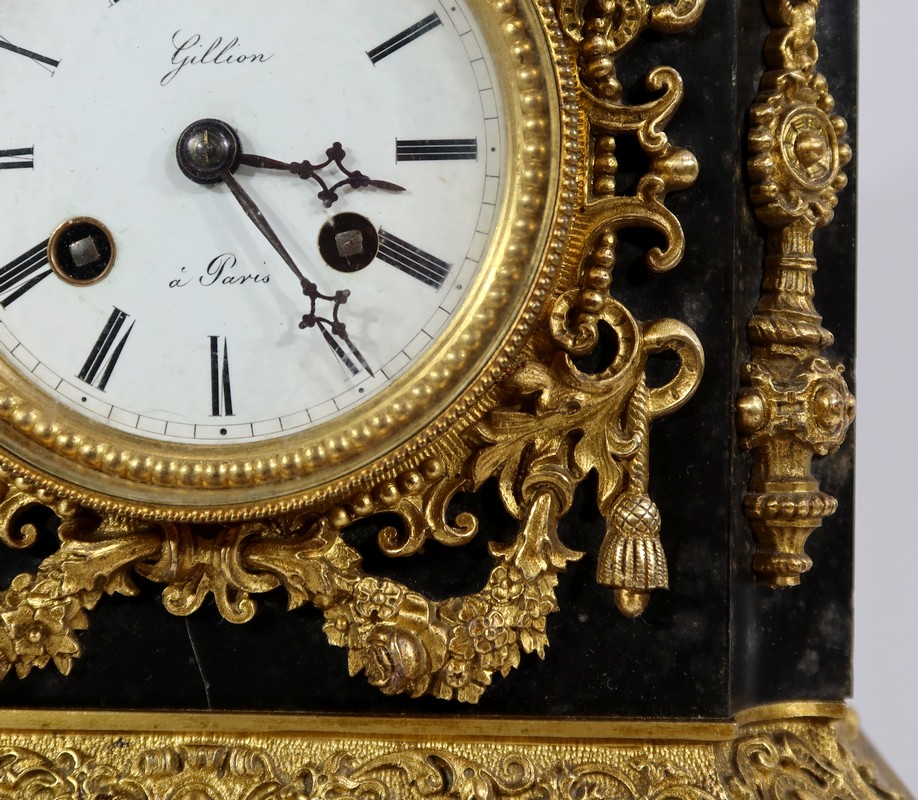 L’horloge en marbre noir possède un cadran émaillé blanc avec chiffres romains noirs signé « Gillion à Paris ». Le pourtour de ce cadran est décoré de guirlandes de perles et de riches ornementations : des volutes, des feuillages, des pompons et des guirlandes de fleurs.