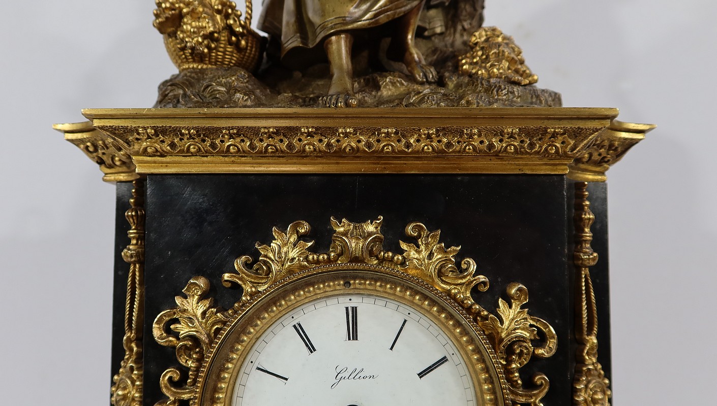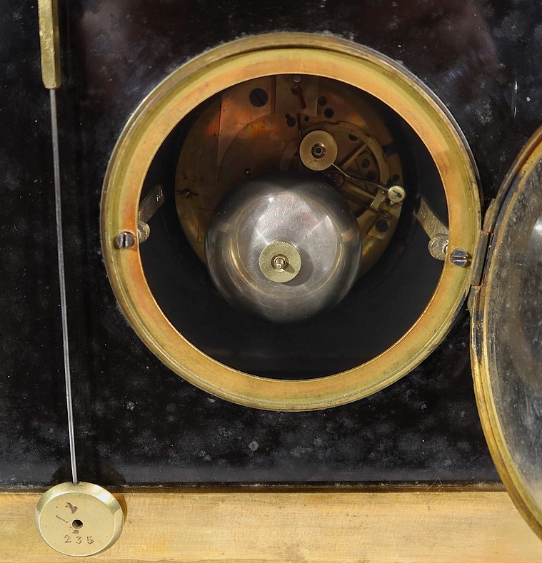 Pendule en marbre noir décorée d’éléments de bronze doré ou patiné, réalisée par le Maître Horloger Gillion installé 5, rue de braque à paris, au début XIXème siècle.