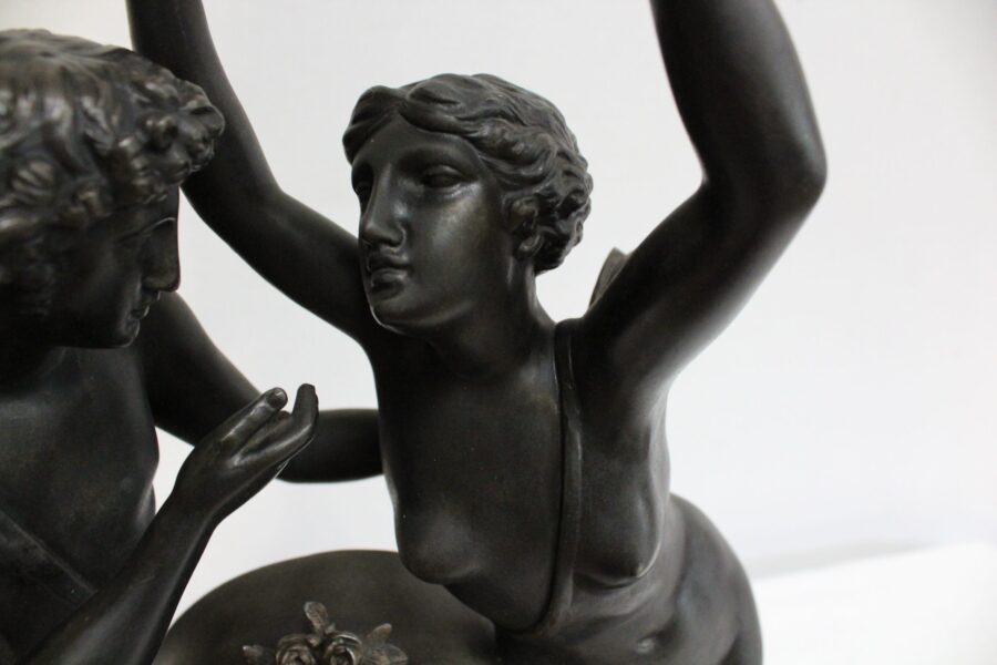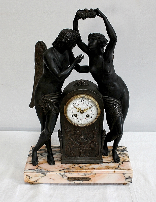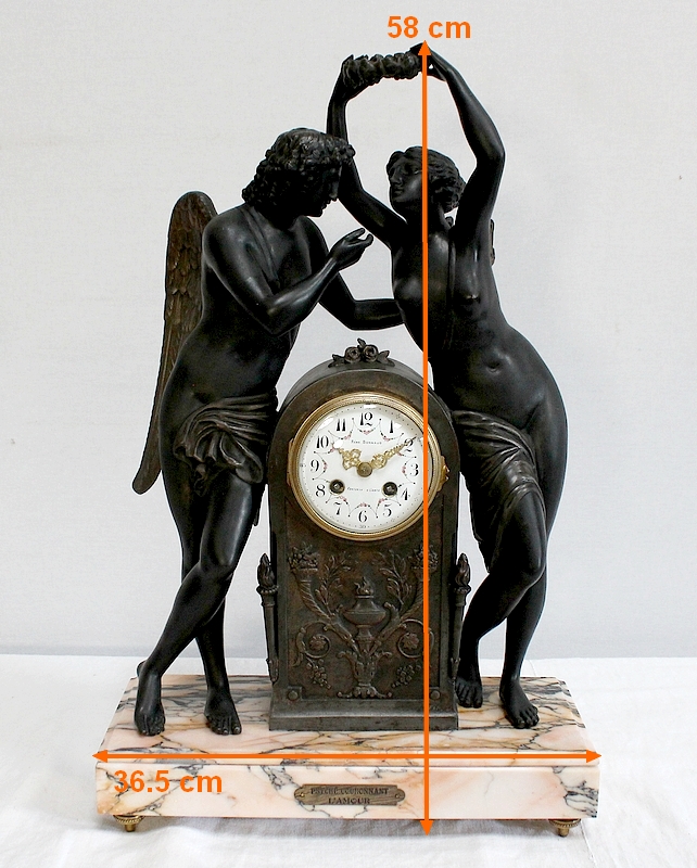 Cette Pendule illustre un épisode du mythe de Psyché dans lequel celle-ci s’apprête à déposer sur le front d’Éros sa couronne blanche de pureté. Les deux amants sont vêtus d’un simple voile qui cache leurs nudités, et ils revêtent leurs attributs respectifs, des ailes d’ange pour Cupidon et des ailes de papillon pour Psyché.