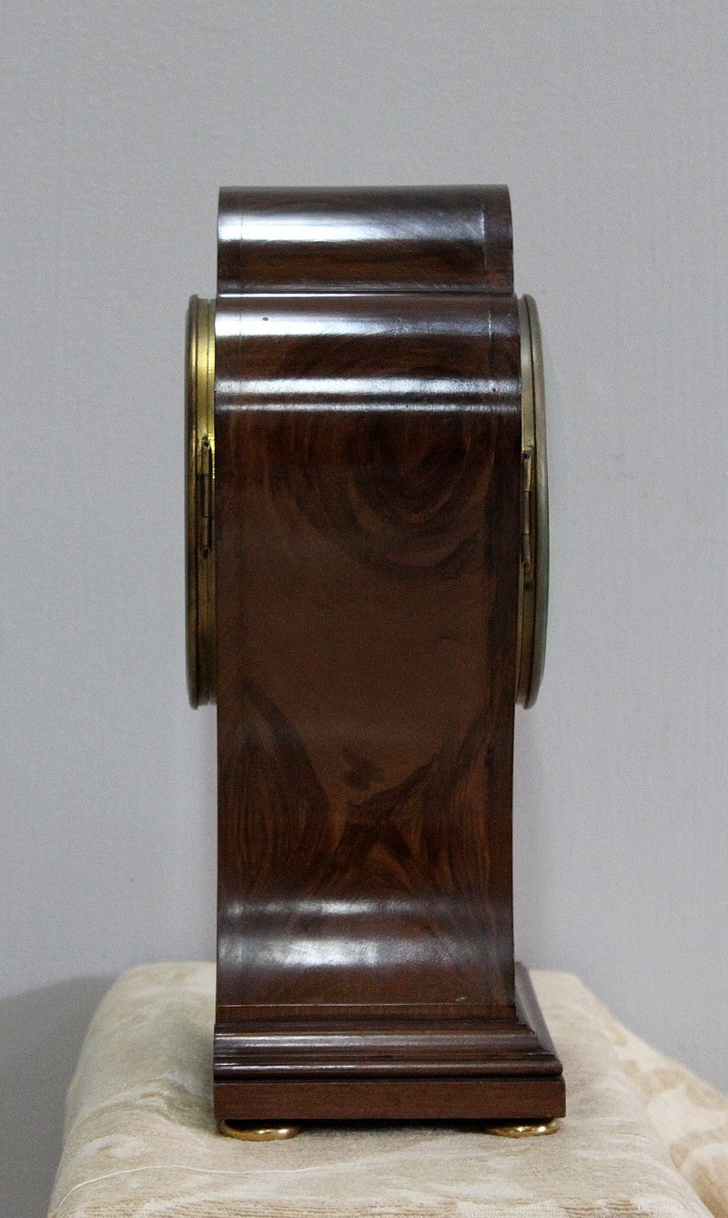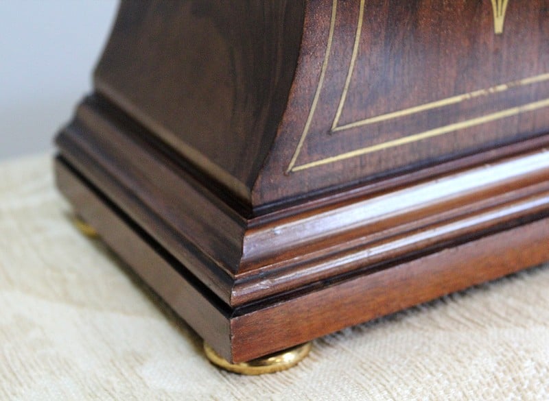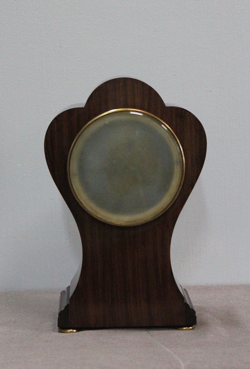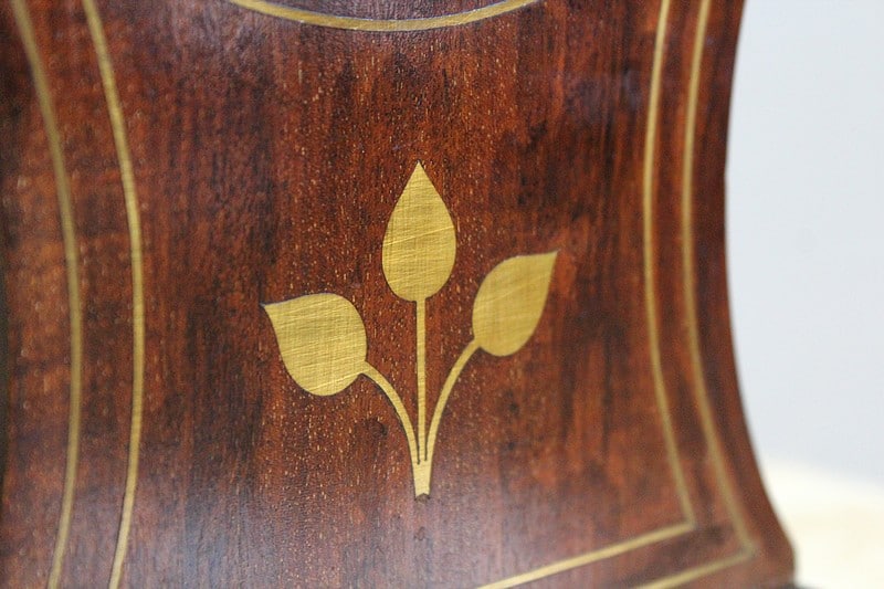Pendulette de cheminée Art Nouveau d’exception en acajou de Cuba massif moiré, ornée d’incrustations de laiton en filets et décoration de trois fleurs sur le devant.