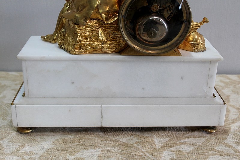 Très belle pendulette arborant un bronze finement travaillé posé sur un marbre blanc de Carrare orné de baguettes de laiton.