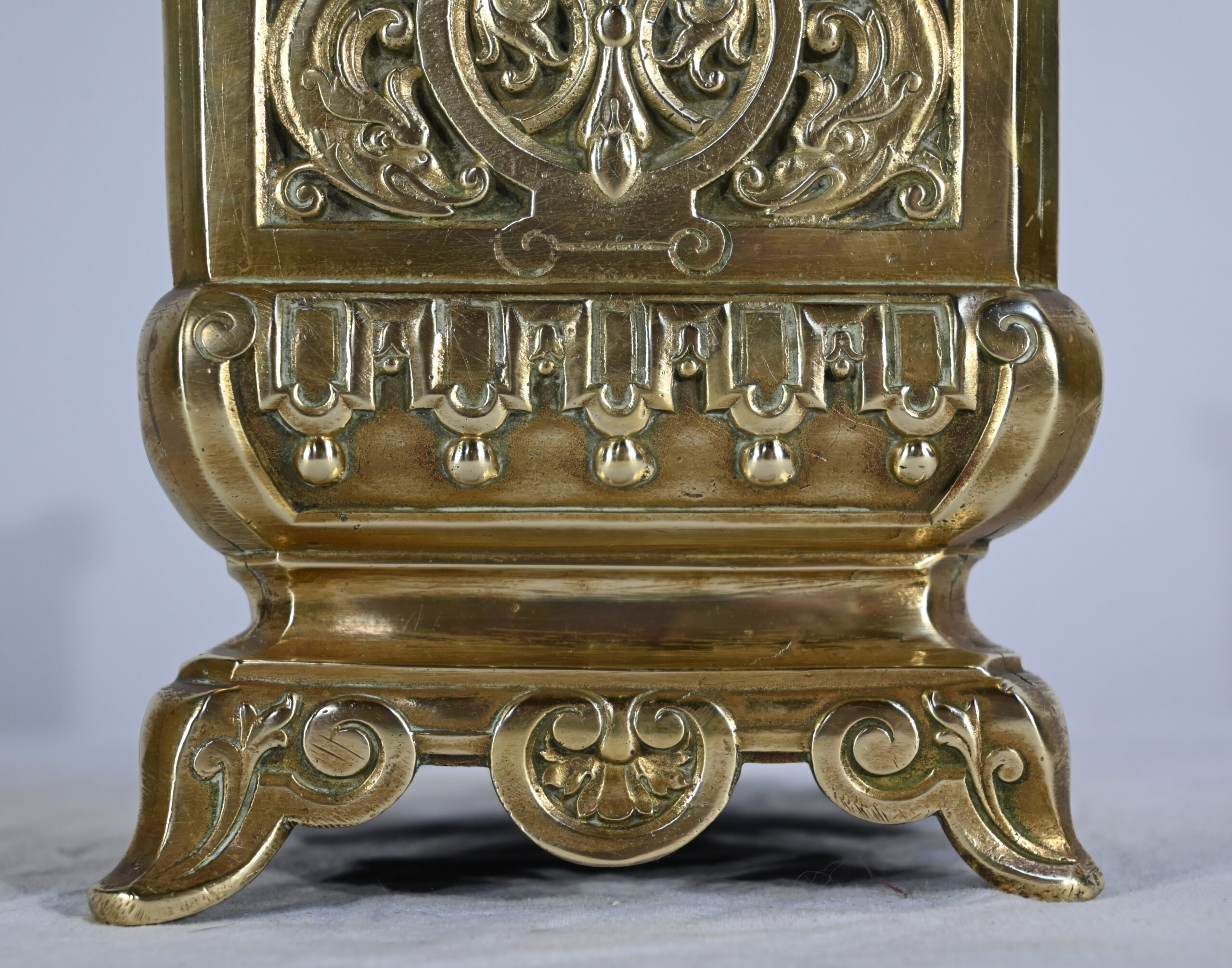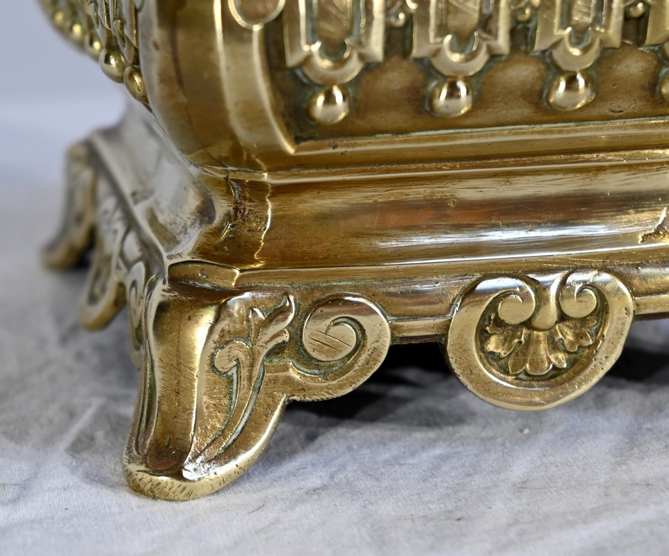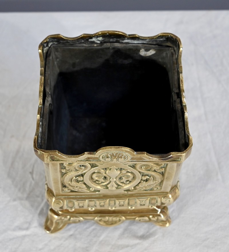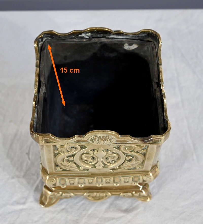 Cache-pot de section carrée, en bronze doré, à décors ciselé de fleurs de lys en médaillons, d’animaux chimériques et de coquille. La base, moulurée en gorge, présente quatre pieds à volutes.